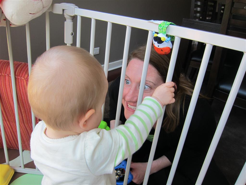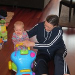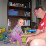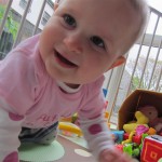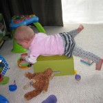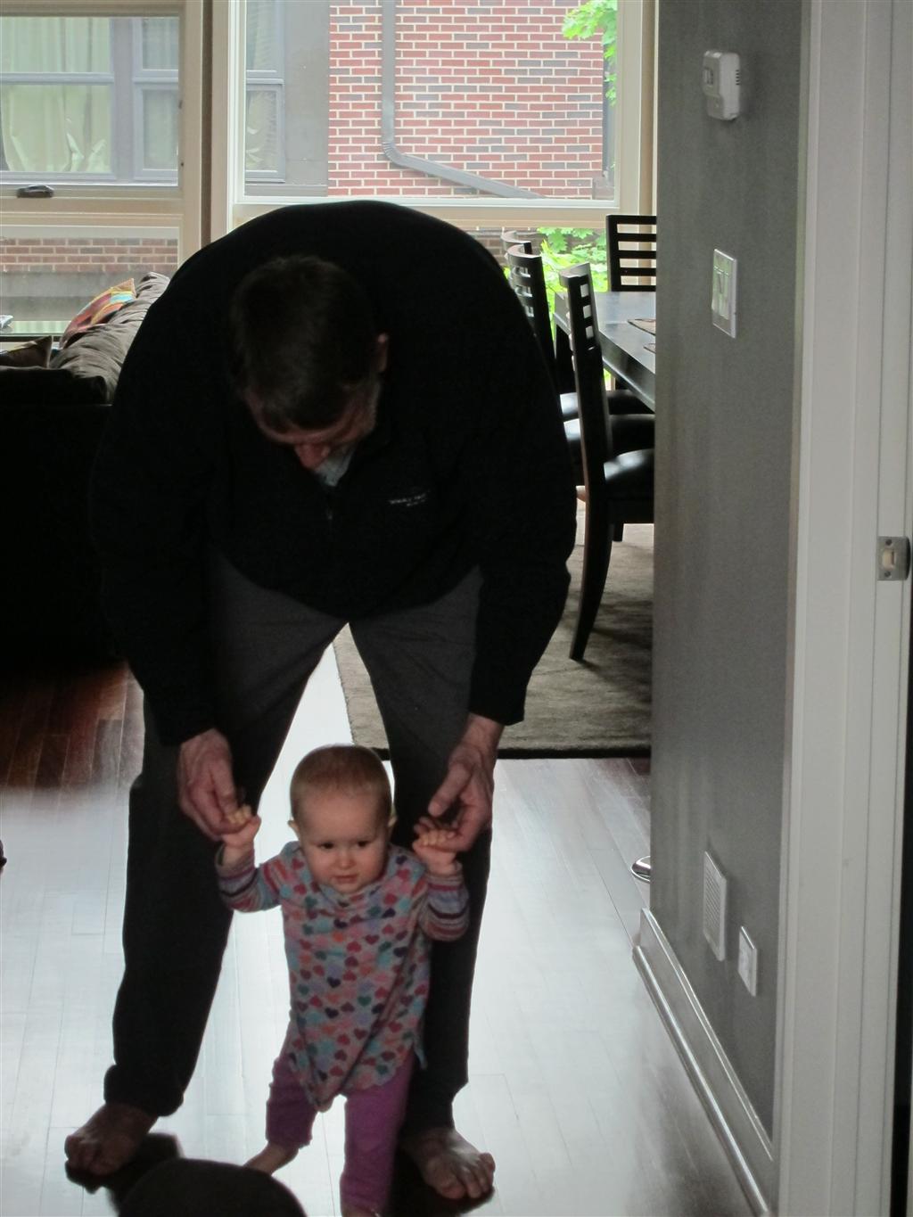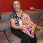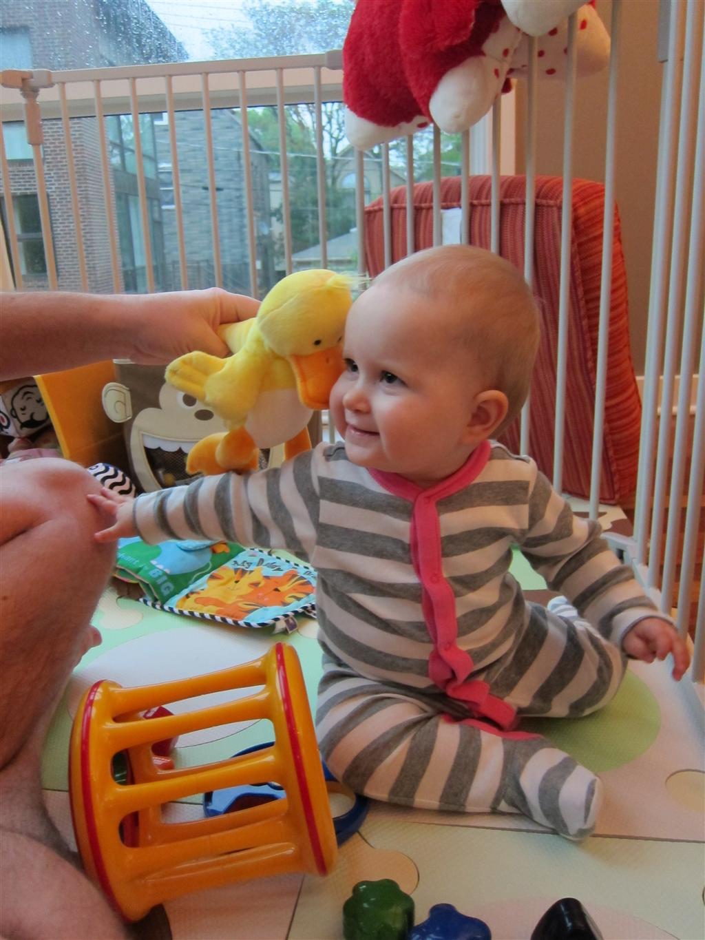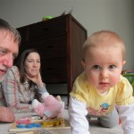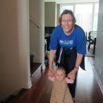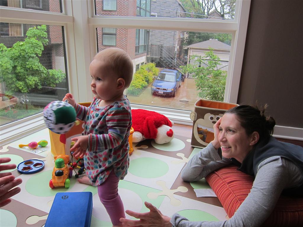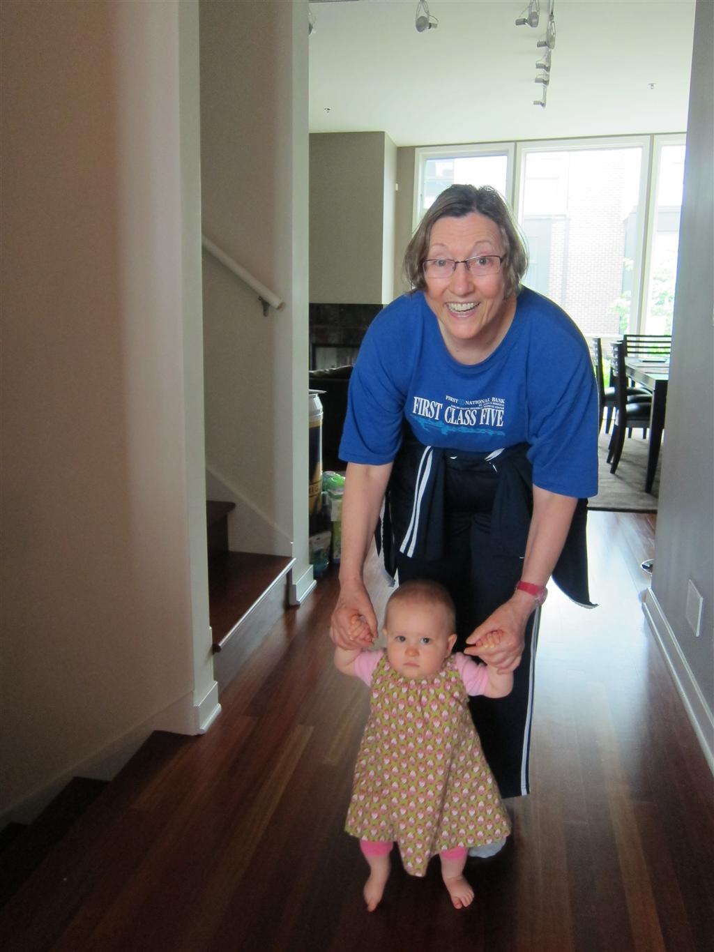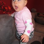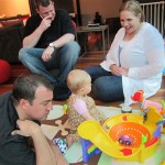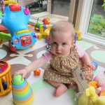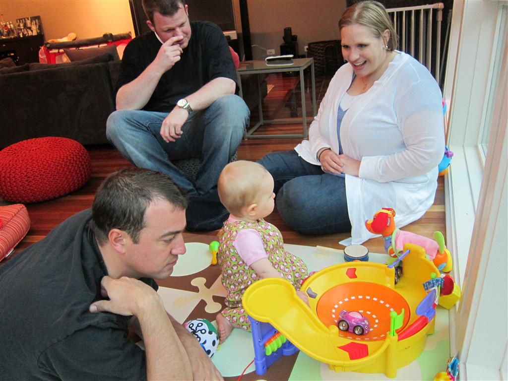 It was a fun packed week with lots of visitors at Eleanor’s house.  Early in the week, we were practicing our standing and crawling.  Zapa has to be increasingly on her toes to as Eleanor’s reach and quickness both increase.  Papa and Mimi arrived on thursday night, and Eleanor had lots of fun playing with them all weekend.  There were lots of smiles, lots of meals, and lots of standing.   Unfortunately, the weather didn’t cooperate, so we didn’t get outside much.  In fact, Dad had to cook the burgers and shish kabobs under cover of an umbrella on Sunday, when Uncle B, Breanne, Tia and Jay came over.   As if all that excitement wasn’t enough, a new tooth also popped through this week, a bottom tooth on the left side, tooth number seven in all.  On the sad side, Eleanor had her first painful diaper rash this week as well – which put a little damper on Saturday’s fun – poor thing.