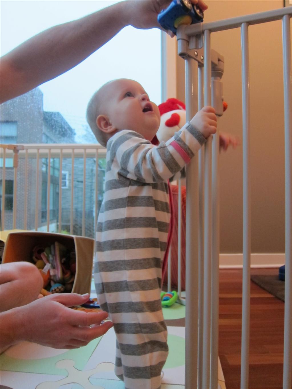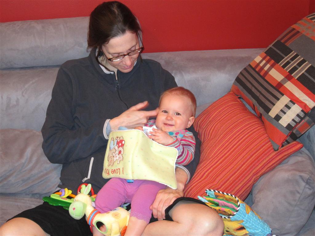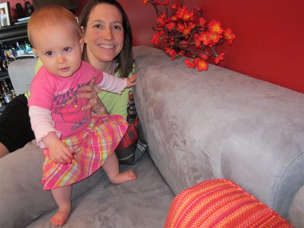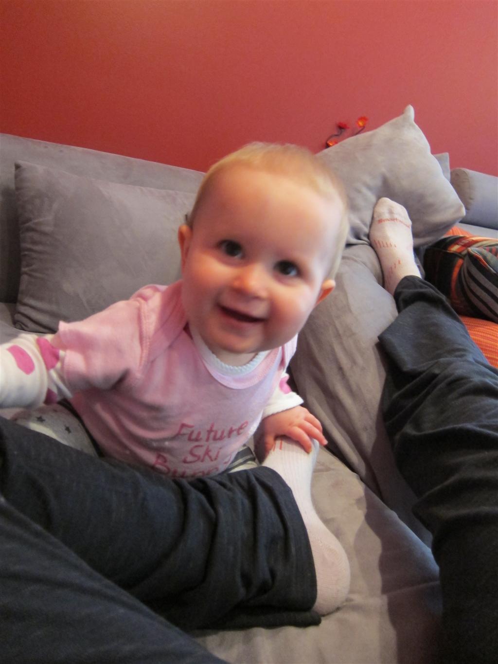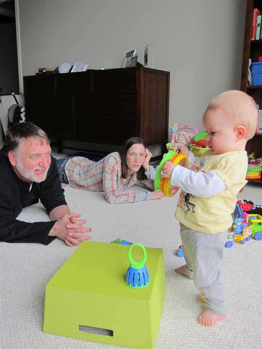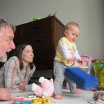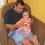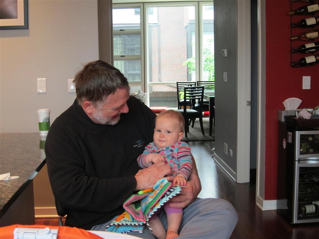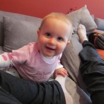It was a fun packed week with lots of visitors at Eleanor’s house.  Early in the week, we were practicing our standing and crawling.  Zapa has to be increasingly on her toes to as Eleanor’s reach and quickness both increase.  Papa and Mimi arrived on thursday night, and Eleanor had lots of fun playing with them all weekend.  There were lots of smiles, lots of meals, and lots of standing.   Unfortunately, the weather didn’t cooperate, so we didn’t get outside much.  In fact, Dad had to cook the burgers and shish kabobs under cover of an umbrella on Sunday, when Uncle B, Breanne, Tia and Jay came over.   As if all that excitement wasn’t enough, a new tooth also popped through this week, a bottom tooth on the left side, tooth number seven in all.  On the sad side, Eleanor had her first painful diaper rash this week as well – which put a little damper on Saturday’s fun – poor thing.
