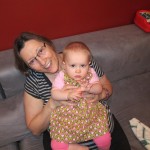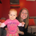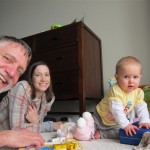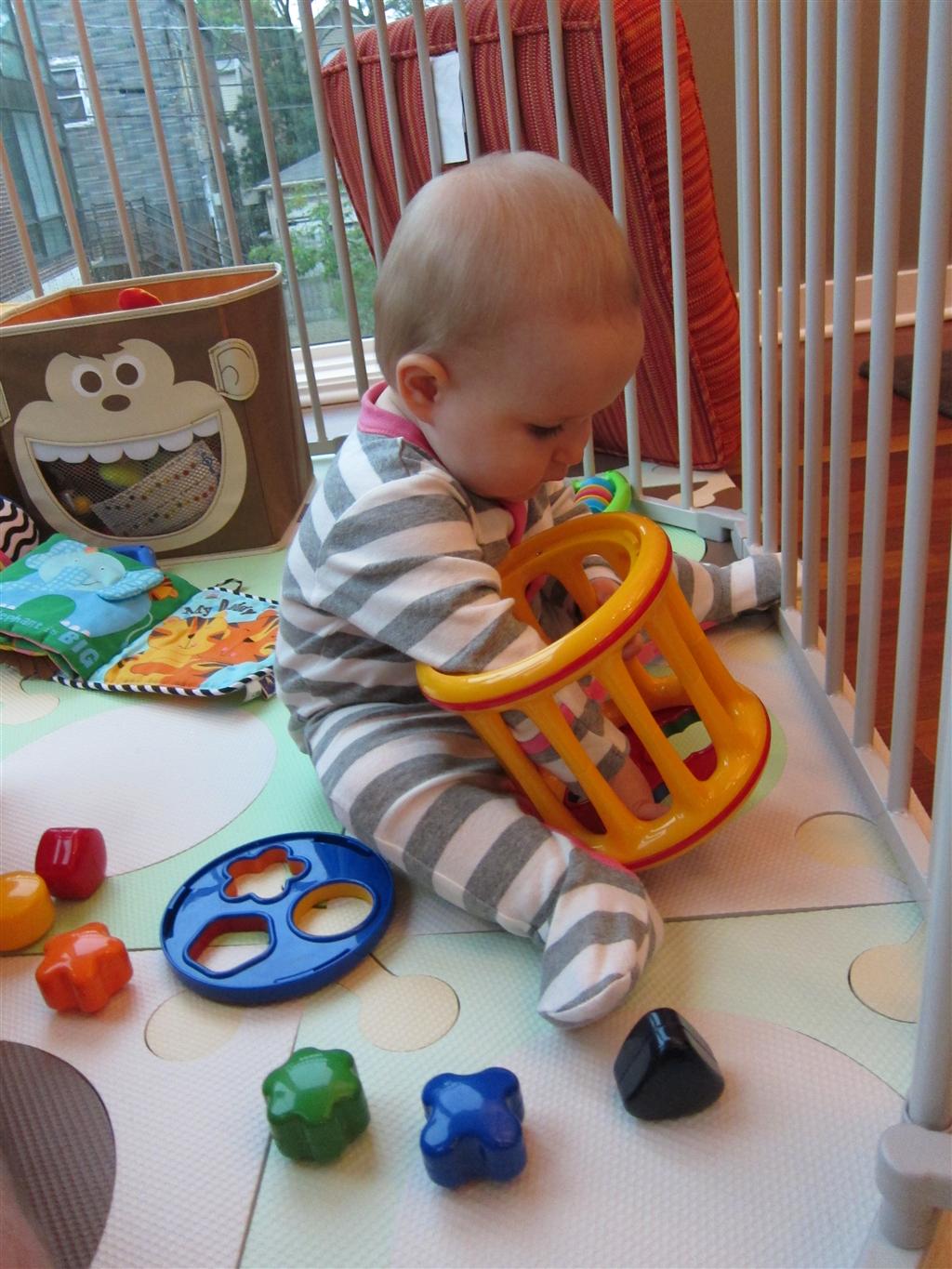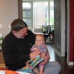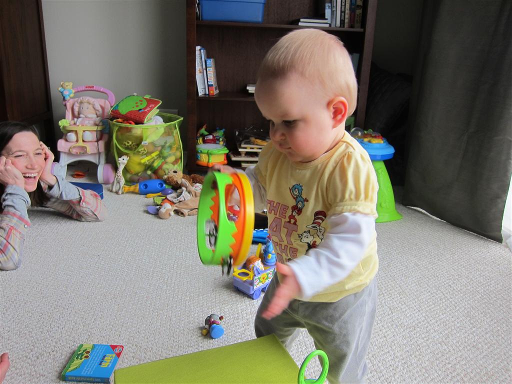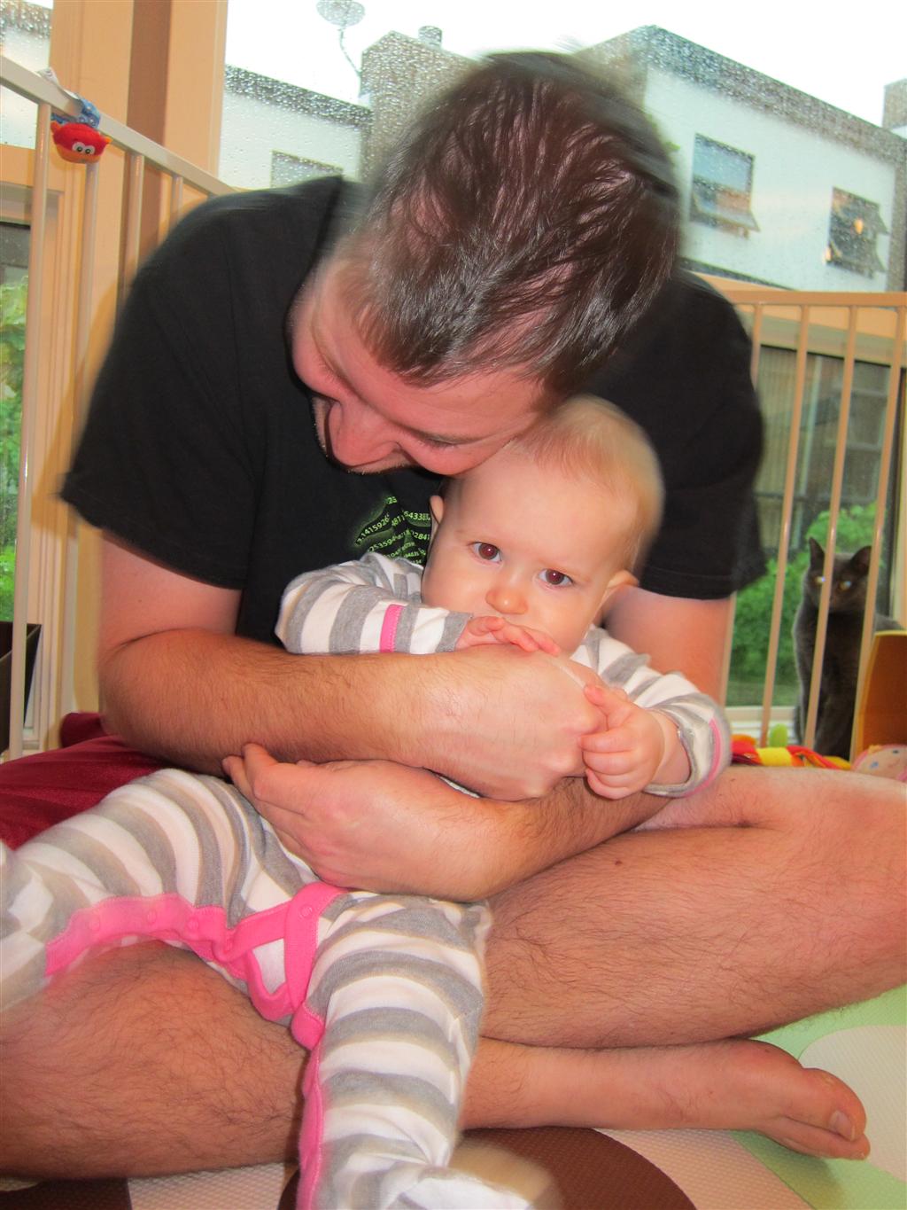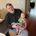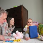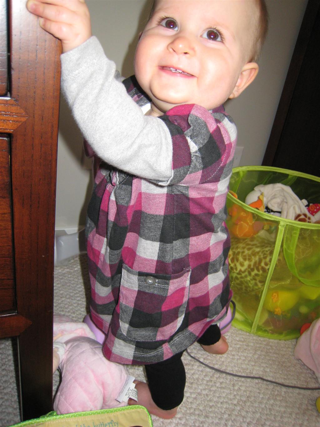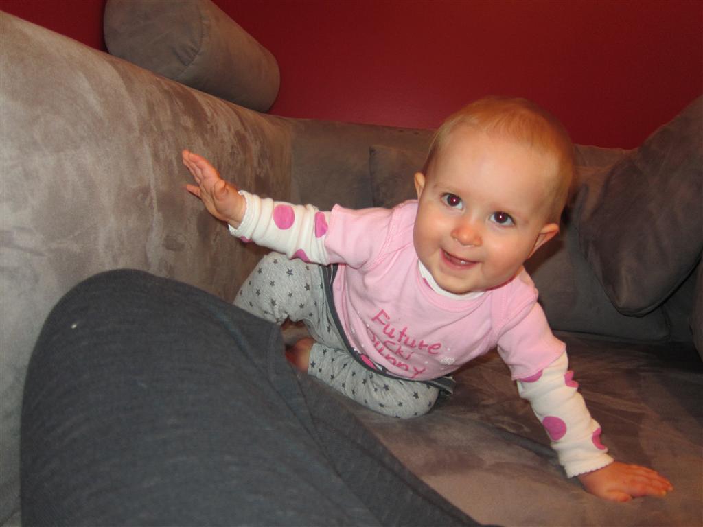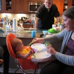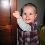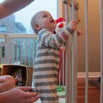 It was a fun packed week with lots of visitors at Eleanor’s house.  Early in the week, we were practicing our standing and crawling.  Zapa has to be increasingly on her toes to as Eleanor’s reach and quickness both increase.  Papa and Mimi arrived on thursday night, and Eleanor had lots of fun playing with them all weekend.  There were lots of smiles, lots of meals, and lots of standing.   Unfortunately, the weather didn’t cooperate, so we didn’t get outside much.  In fact, Dad had to cook the burgers and shish kabobs under cover of an umbrella on Sunday, when Uncle B, Breanne, Tia and Jay came over.   As if all that excitement wasn’t enough, a new tooth also popped through this week, a bottom tooth on the left side, tooth number seven in all.  On the sad side, Eleanor had her first painful diaper rash this week as well – which put a little damper on Saturday’s fun – poor thing.