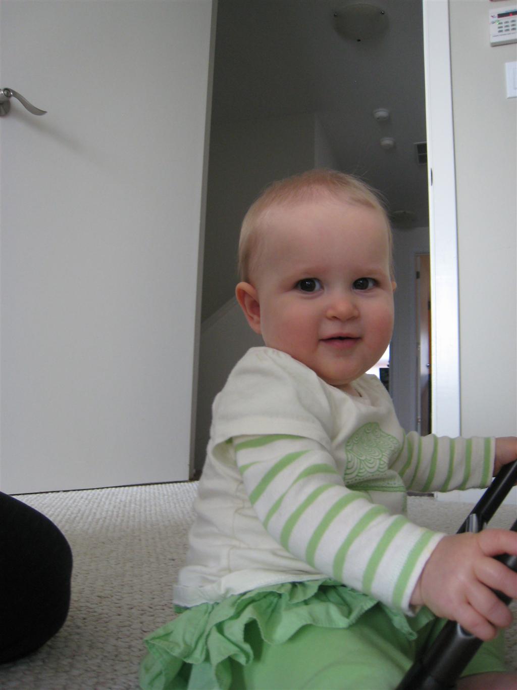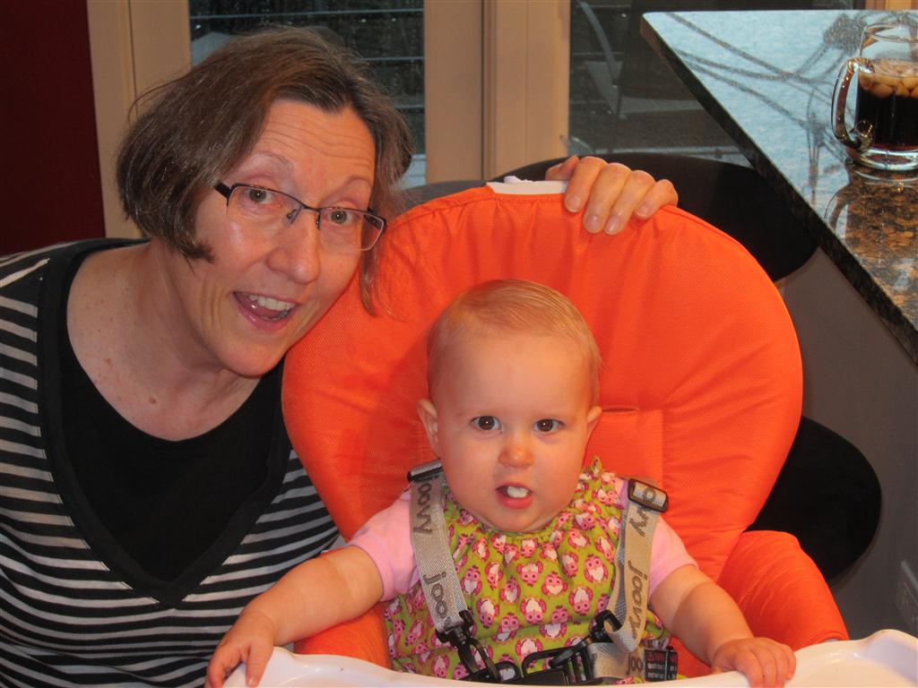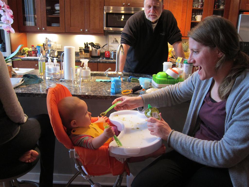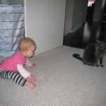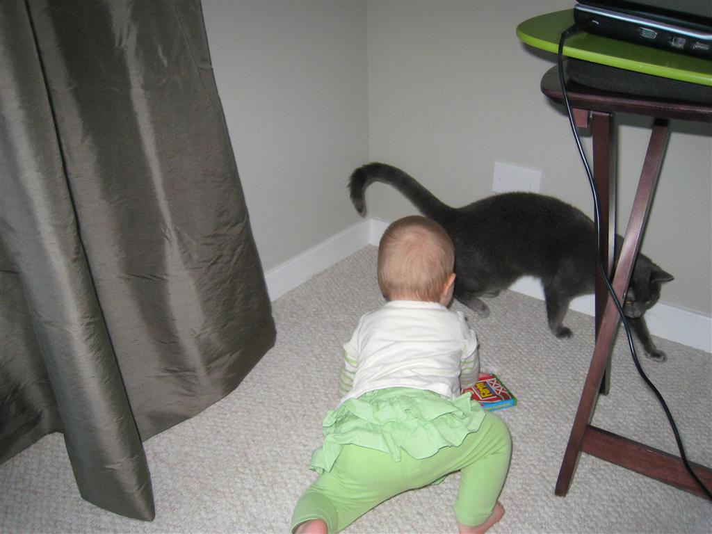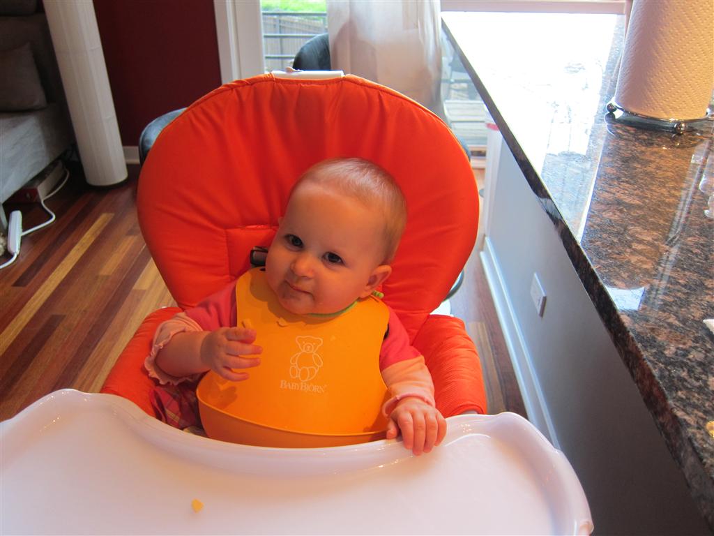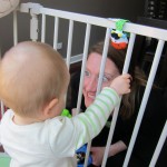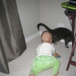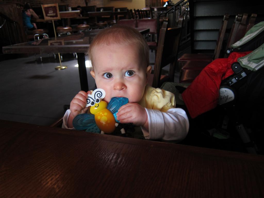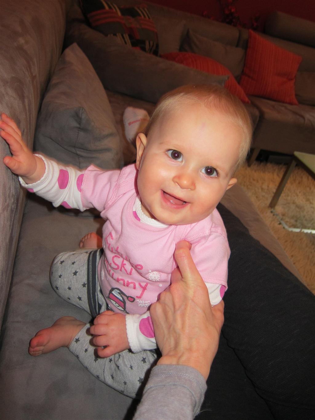 It was a fun packed week with lots of visitors at Eleanor’s house.  Early in the week, we were practicing our standing and crawling.  Zapa has to be increasingly on her toes to as Eleanor’s reach and quickness both increase.  Papa and Mimi arrived on thursday night, and Eleanor had lots of fun playing with them all weekend.  There were lots of smiles, lots of meals, and lots of standing.   Unfortunately, the weather didn’t cooperate, so we didn’t get outside much.  In fact, Dad had to cook the burgers and shish kabobs under cover of an umbrella on Sunday, when Uncle B, Breanne, Tia and Jay came over.   As if all that excitement wasn’t enough, a new tooth also popped through this week, a bottom tooth on the left side, tooth number seven in all.  On the sad side, Eleanor had her first painful diaper rash this week as well – which put a little damper on Saturday’s fun – poor thing.