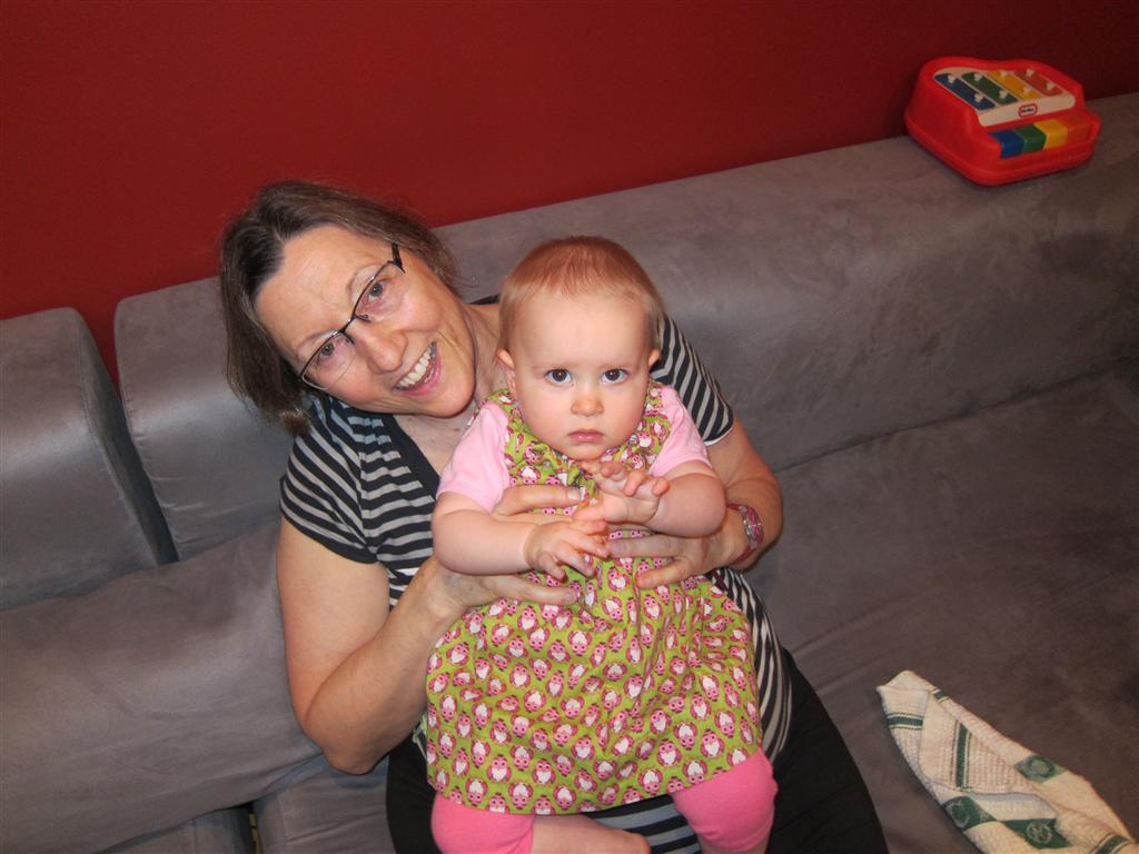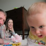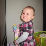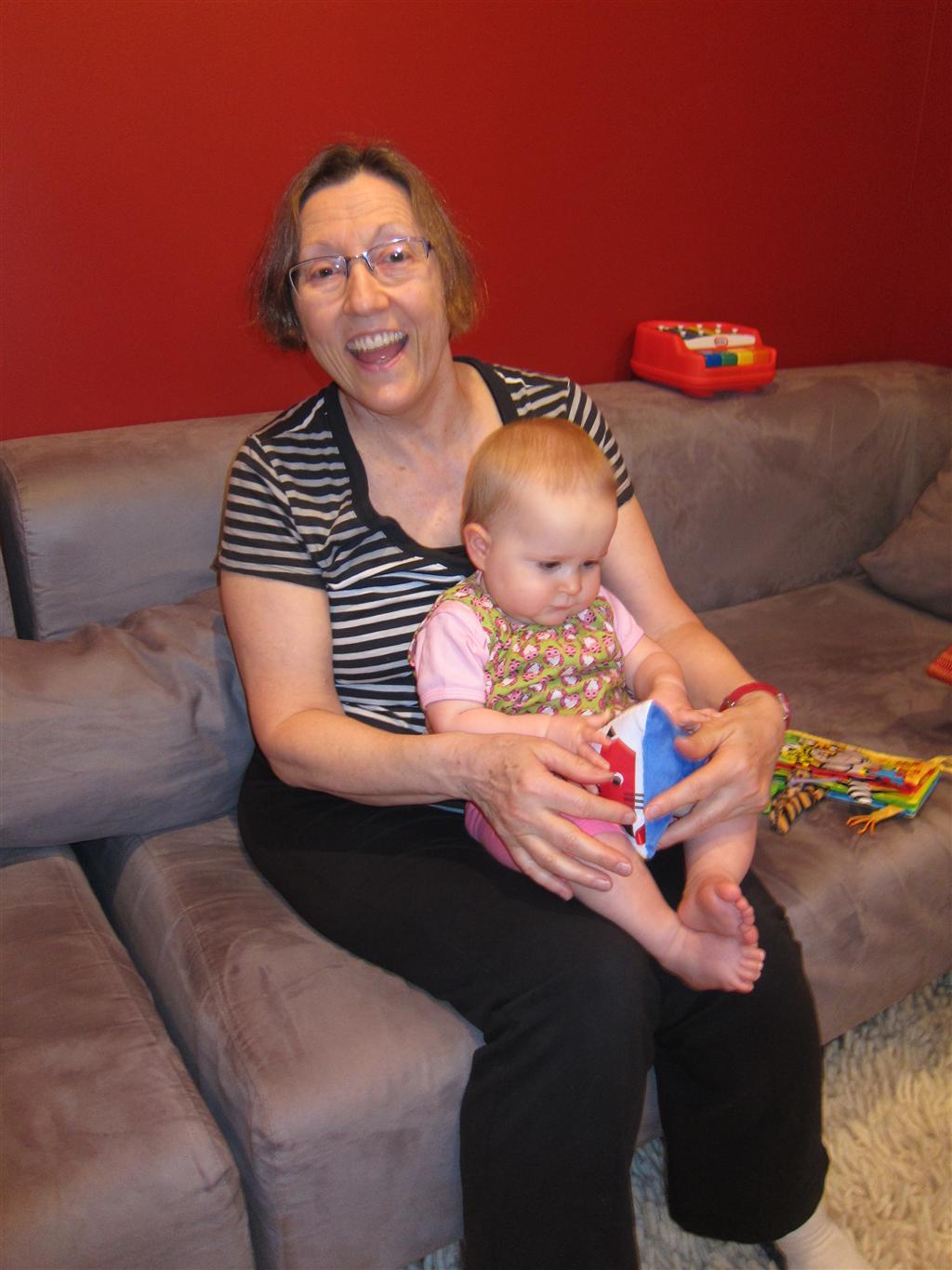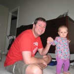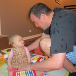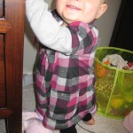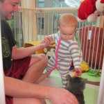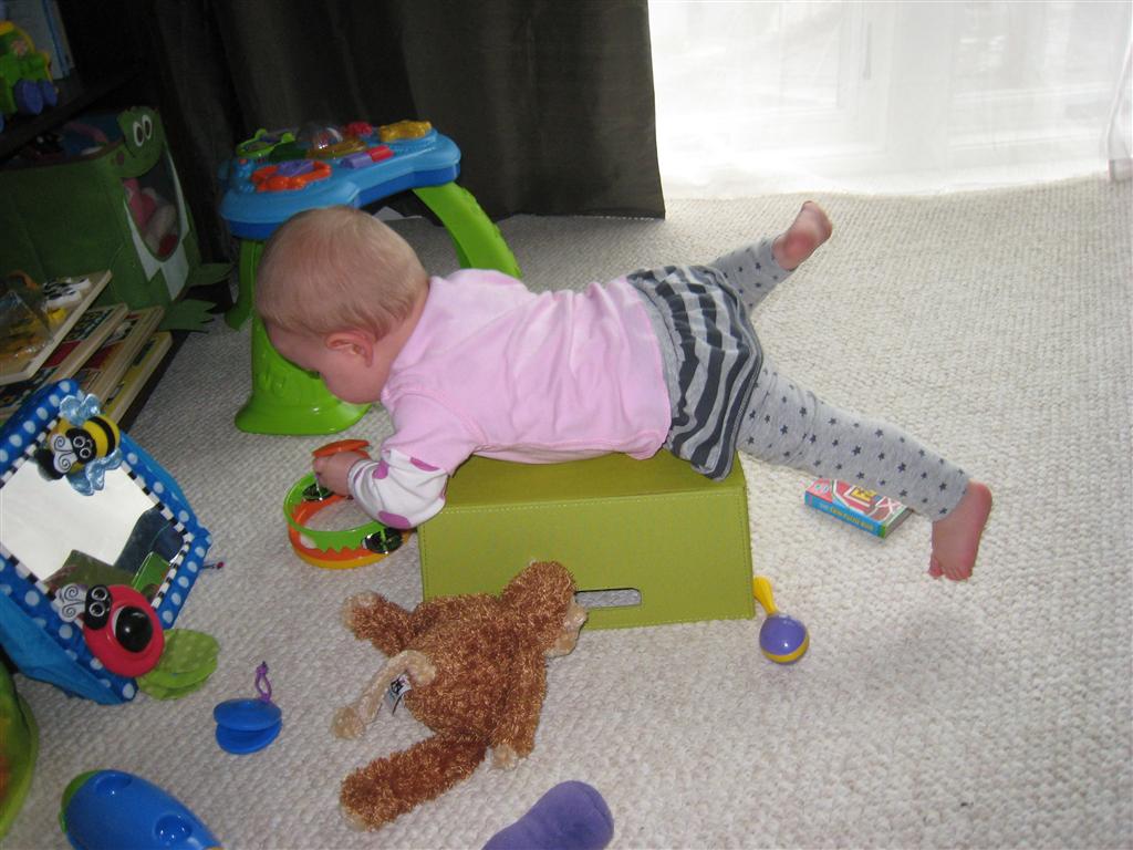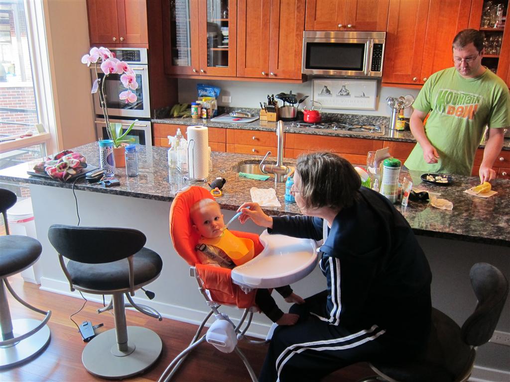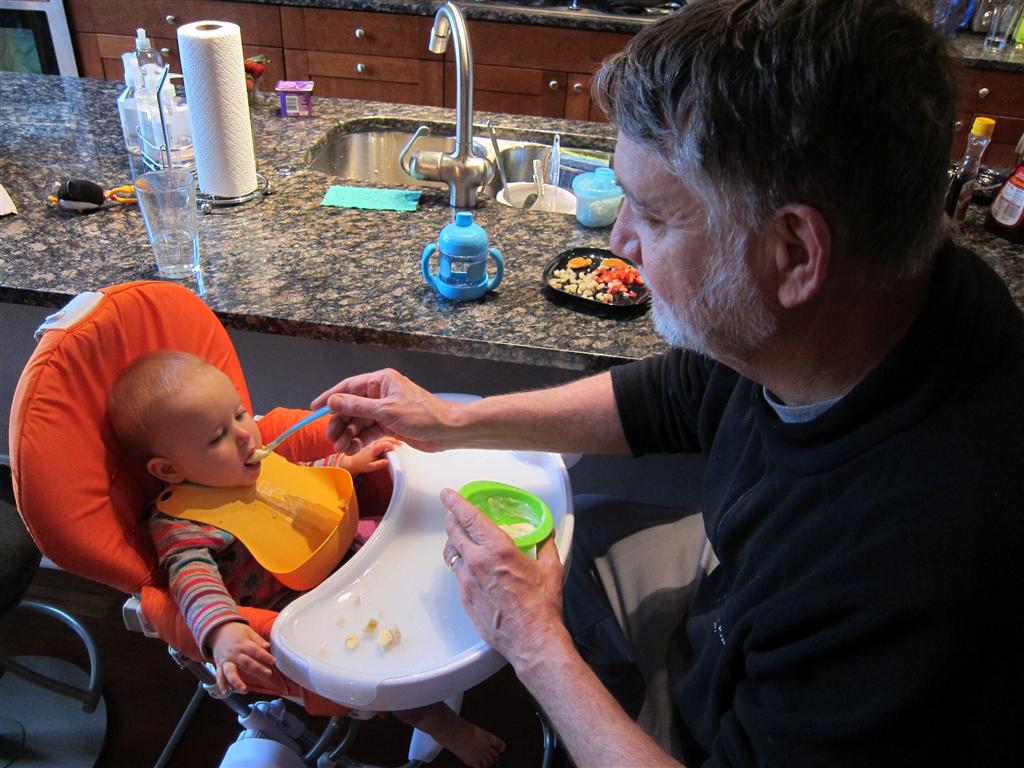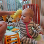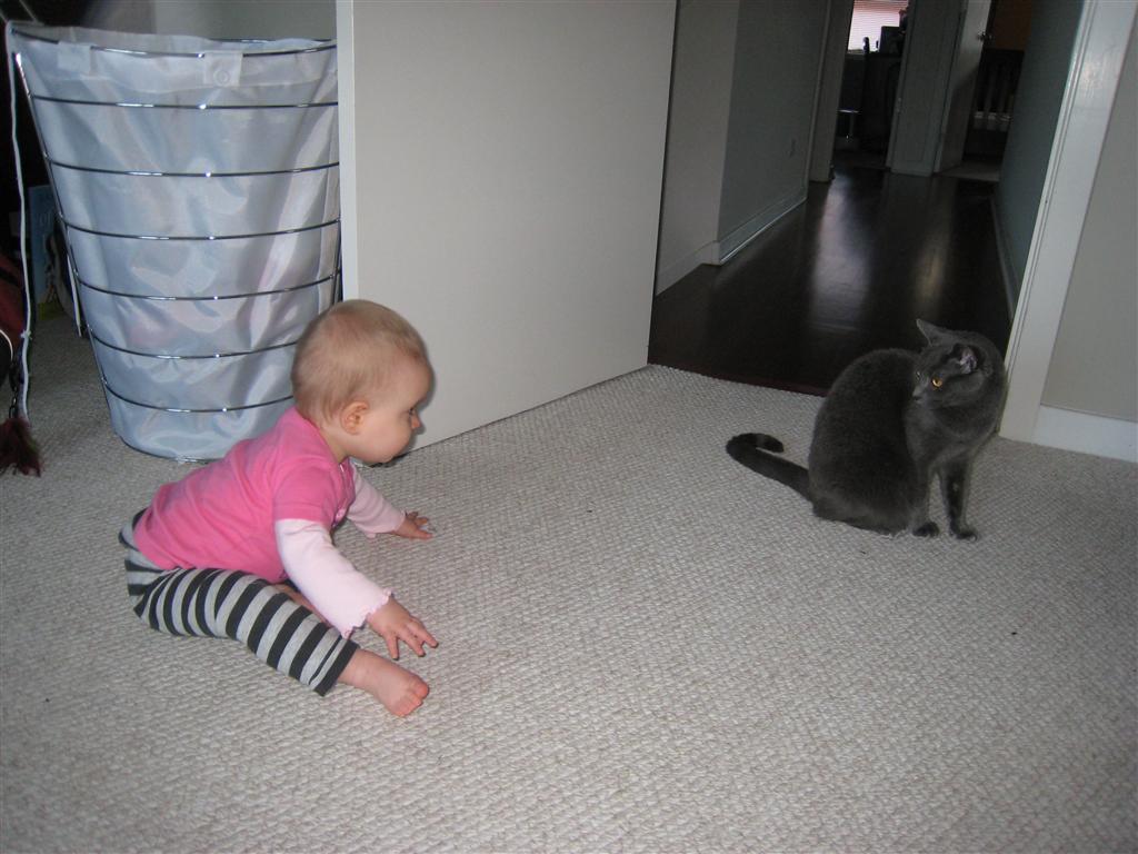 It was a fun packed week with lots of visitors at Eleanor’s house.  Early in the week, we were practicing our standing and crawling.  Zapa has to be increasingly on her toes to as Eleanor’s reach and quickness both increase.  Papa and Mimi arrived on thursday night, and Eleanor had lots of fun playing with them all weekend.  There were lots of smiles, lots of meals, and lots of standing.   Unfortunately, the weather didn’t cooperate, so we didn’t get outside much.  In fact, Dad had to cook the burgers and shish kabobs under cover of an umbrella on Sunday, when Uncle B, Breanne, Tia and Jay came over.   As if all that excitement wasn’t enough, a new tooth also popped through this week, a bottom tooth on the left side, tooth number seven in all.  On the sad side, Eleanor had her first painful diaper rash this week as well – which put a little damper on Saturday’s fun – poor thing.