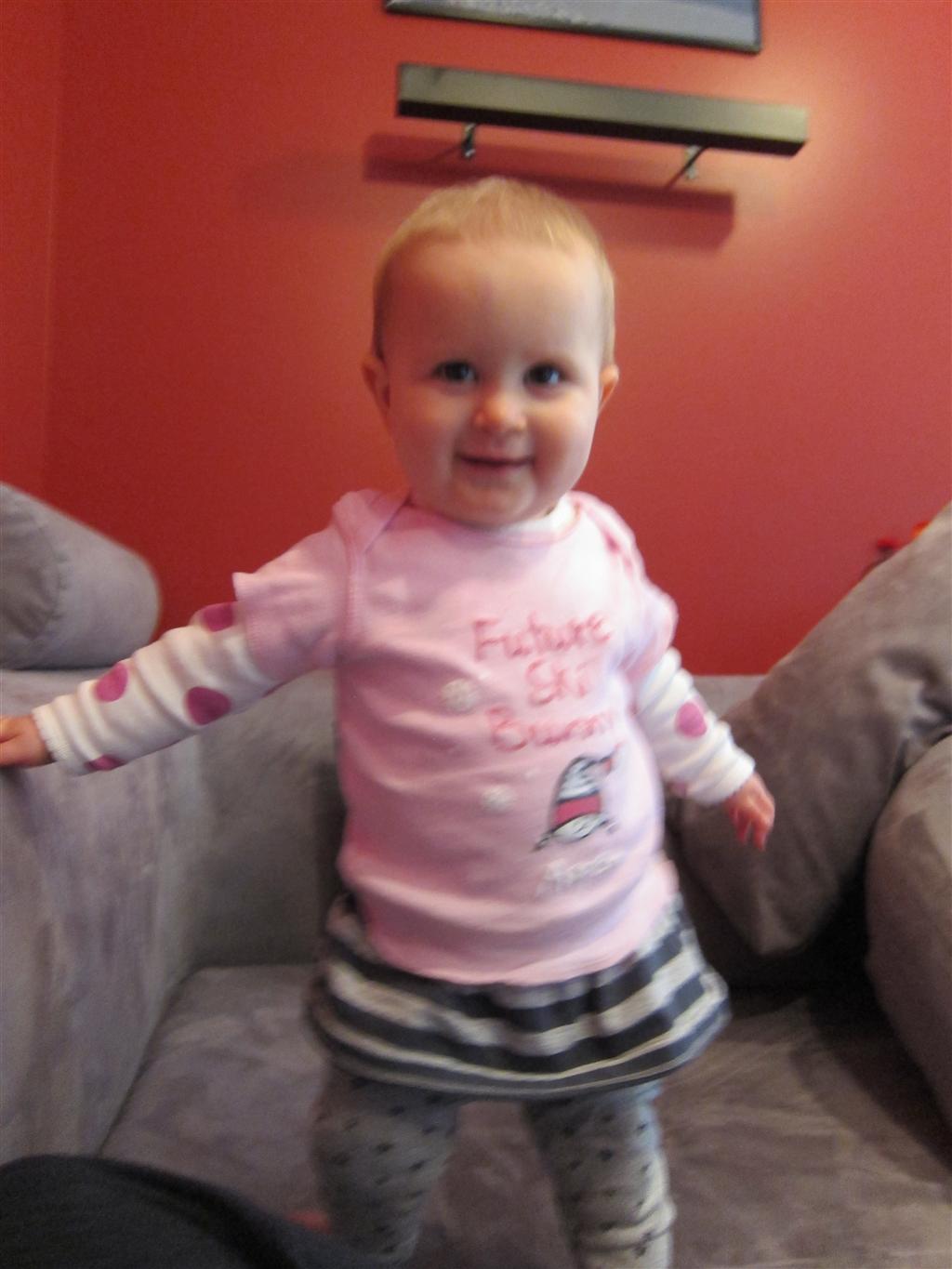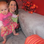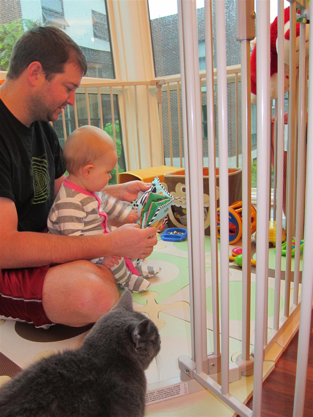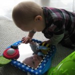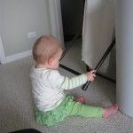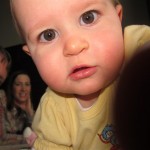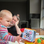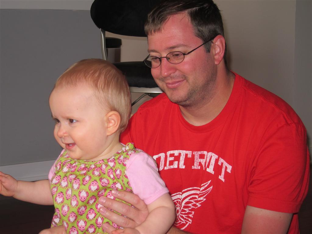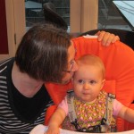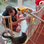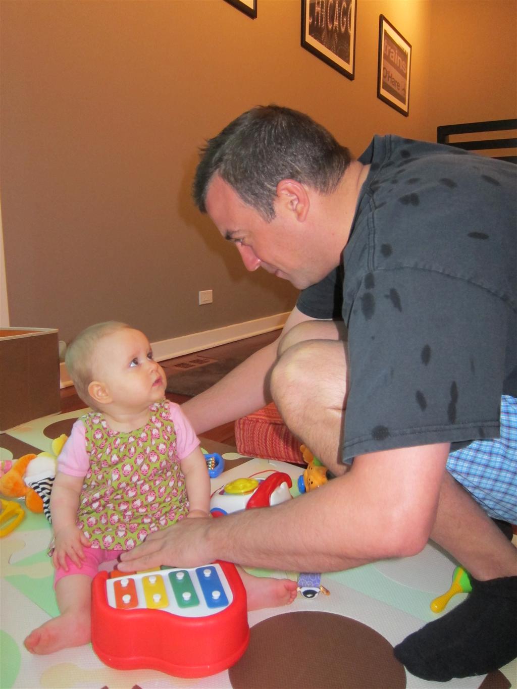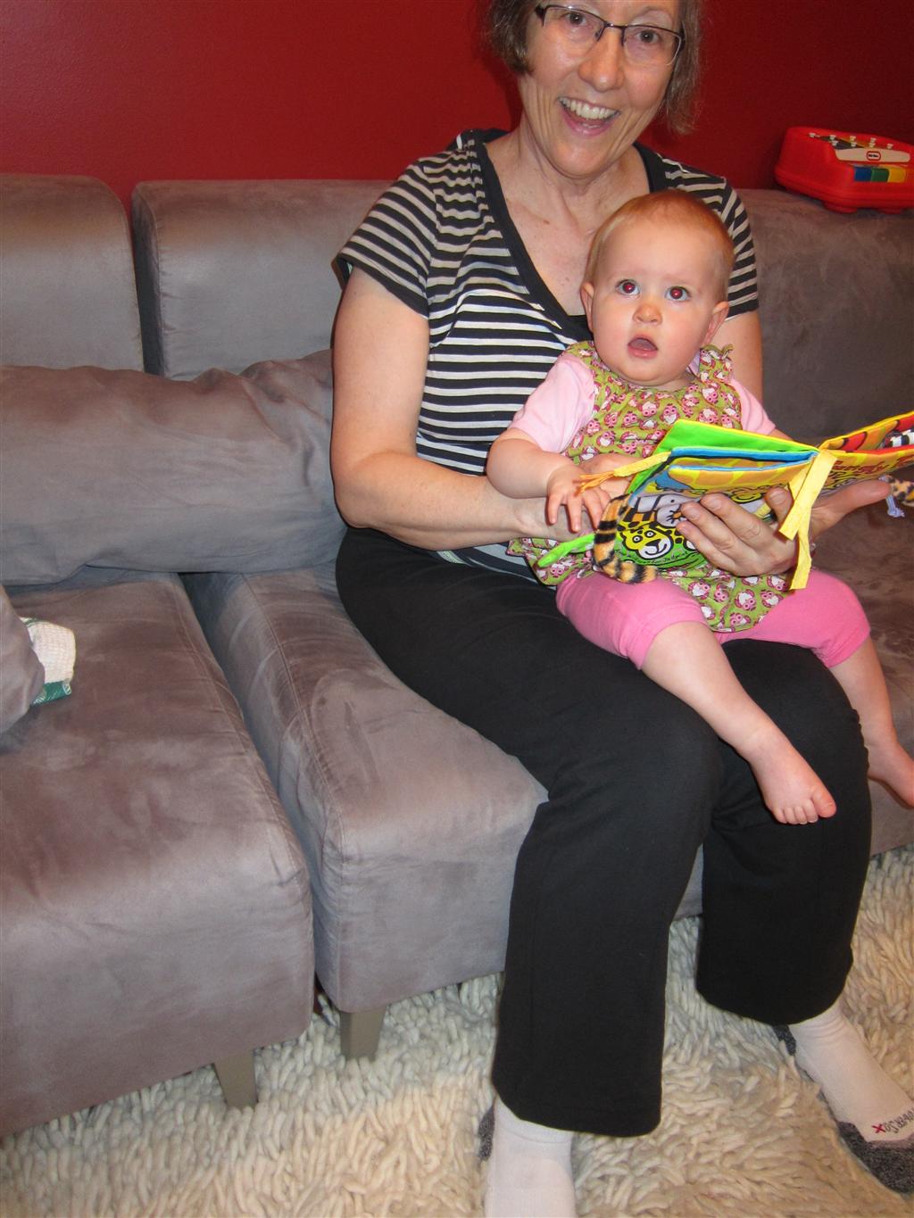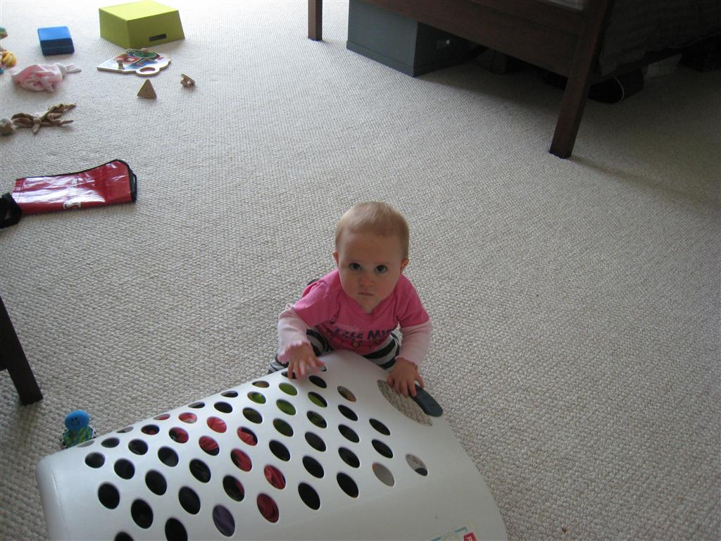 It was a fun packed week with lots of visitors at Eleanor’s house.  Early in the week, we were practicing our standing and crawling.  Zapa has to be increasingly on her toes to as Eleanor’s reach and quickness both increase.  Papa and Mimi arrived on thursday night, and Eleanor had lots of fun playing with them all weekend.  There were lots of smiles, lots of meals, and lots of standing.   Unfortunately, the weather didn’t cooperate, so we didn’t get outside much.  In fact, Dad had to cook the burgers and shish kabobs under cover of an umbrella on Sunday, when Uncle B, Breanne, Tia and Jay came over.   As if all that excitement wasn’t enough, a new tooth also popped through this week, a bottom tooth on the left side, tooth number seven in all.  On the sad side, Eleanor had her first painful diaper rash this week as well – which put a little damper on Saturday’s fun – poor thing.