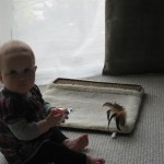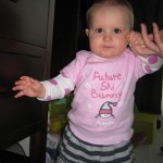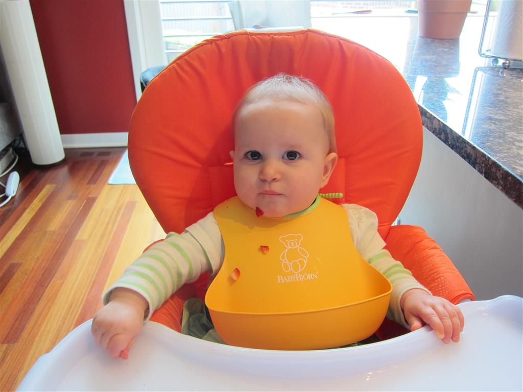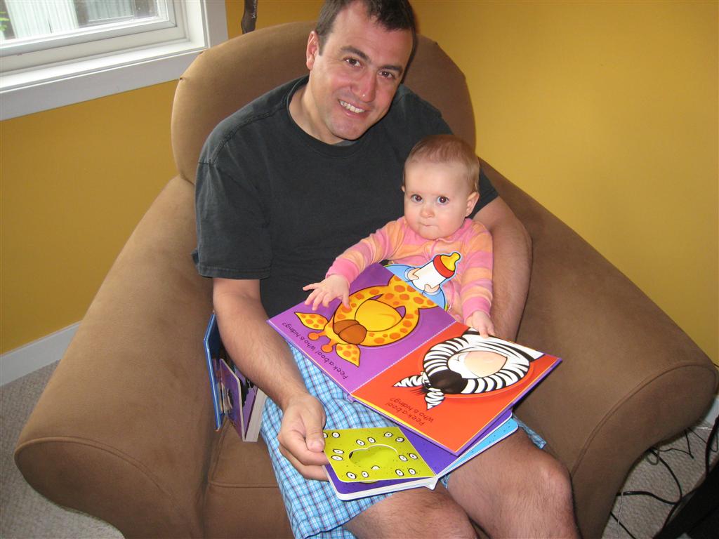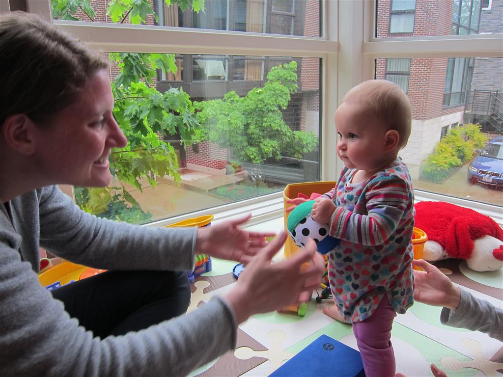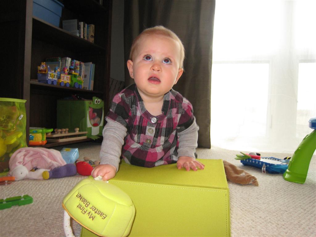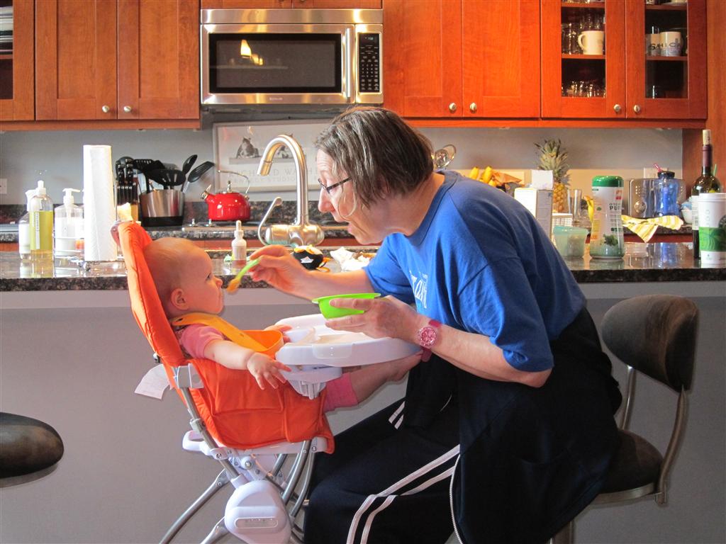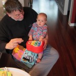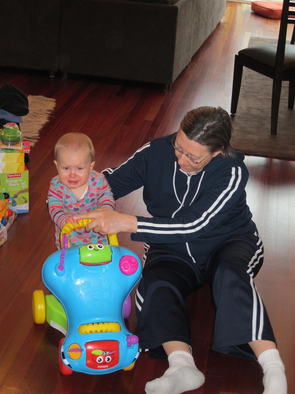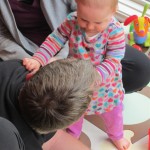 It was a fun packed week with lots of visitors at Eleanor’s house.  Early in the week, we were practicing our standing and crawling.  Zapa has to be increasingly on her toes to as Eleanor’s reach and quickness both increase.  Papa and Mimi arrived on thursday night, and Eleanor had lots of fun playing with them all weekend.  There were lots of smiles, lots of meals, and lots of standing.   Unfortunately, the weather didn’t cooperate, so we didn’t get outside much.  In fact, Dad had to cook the burgers and shish kabobs under cover of an umbrella on Sunday, when Uncle B, Breanne, Tia and Jay came over.   As if all that excitement wasn’t enough, a new tooth also popped through this week, a bottom tooth on the left side, tooth number seven in all.  On the sad side, Eleanor had her first painful diaper rash this week as well – which put a little damper on Saturday’s fun – poor thing.