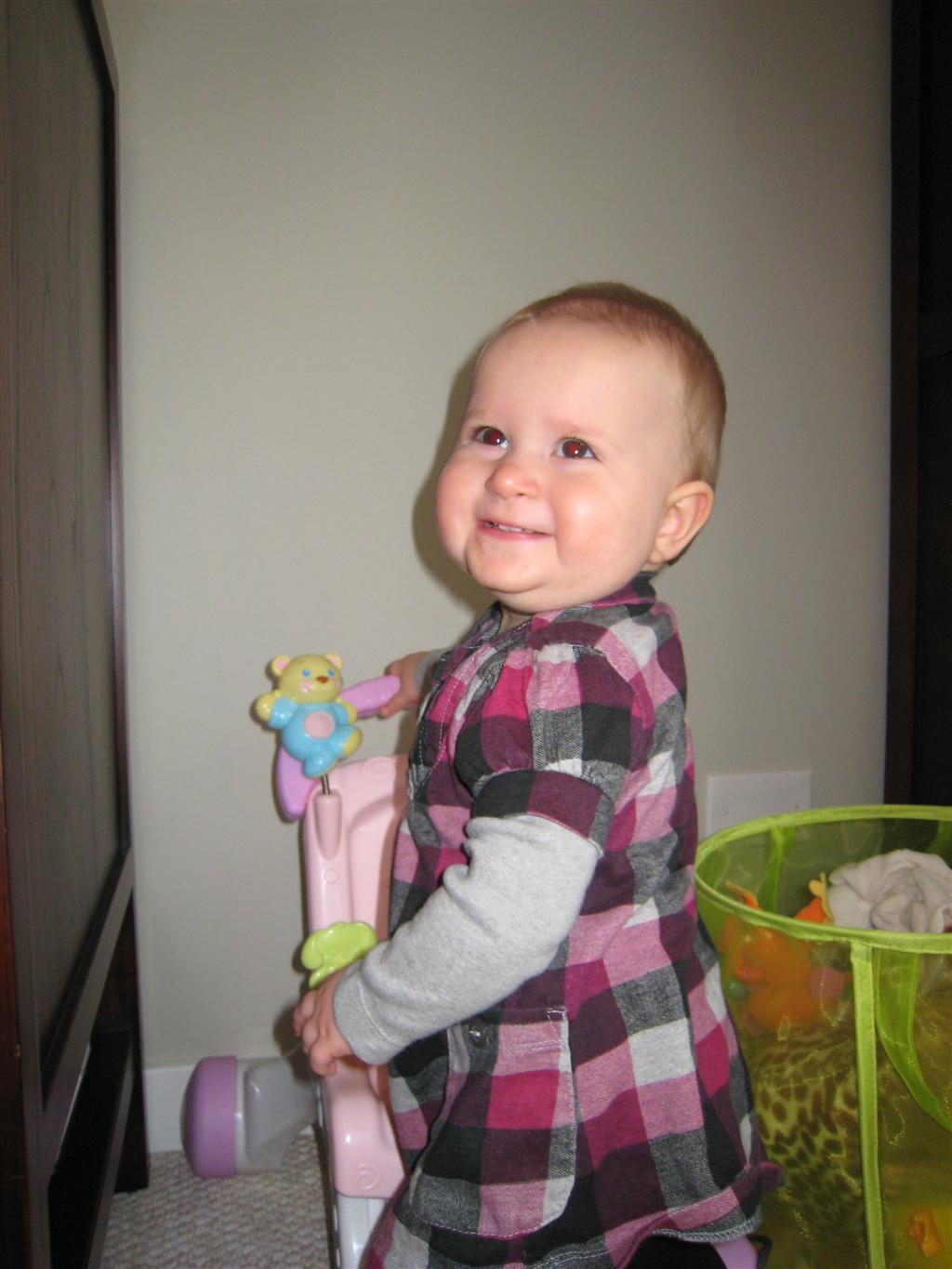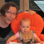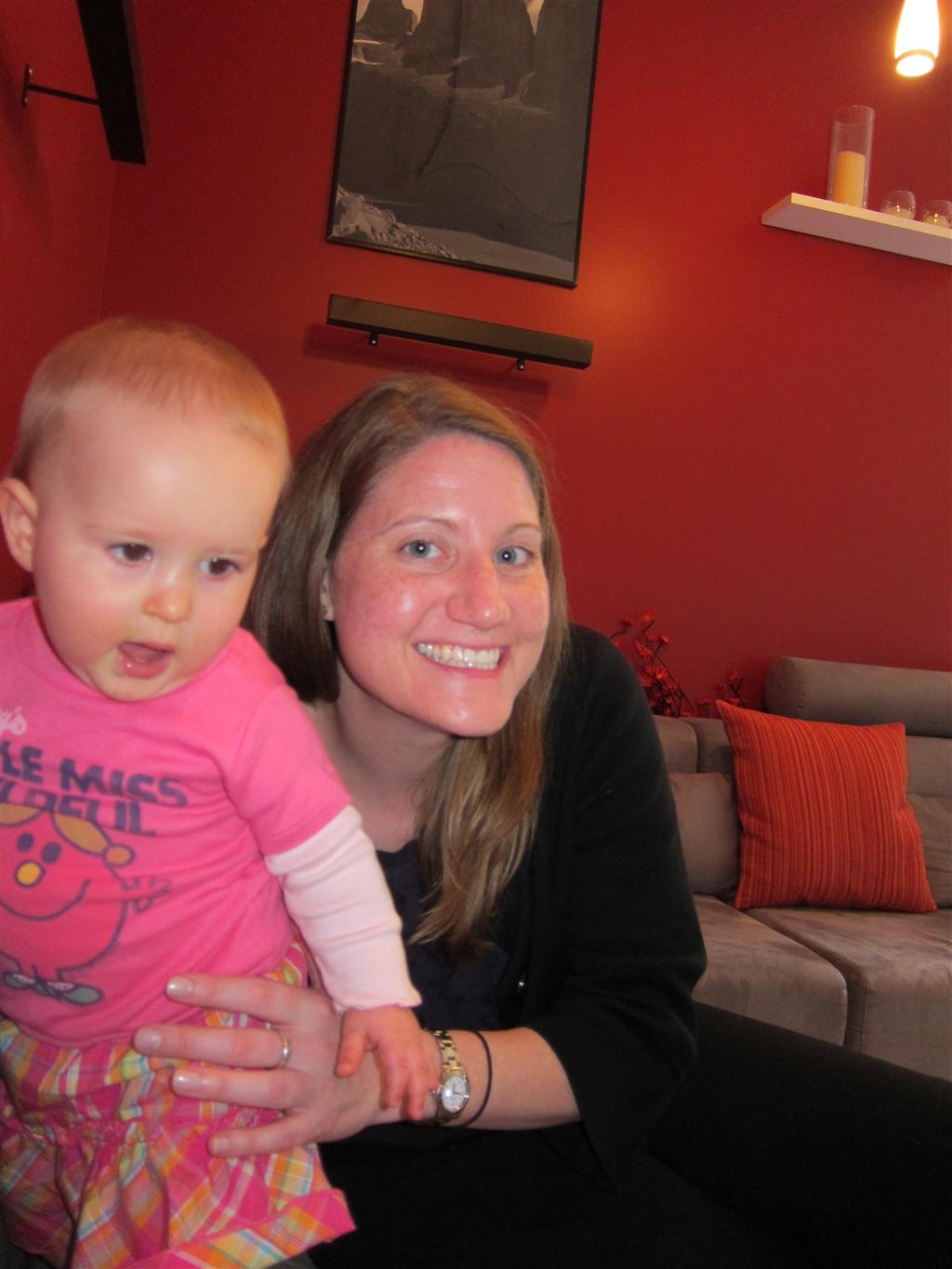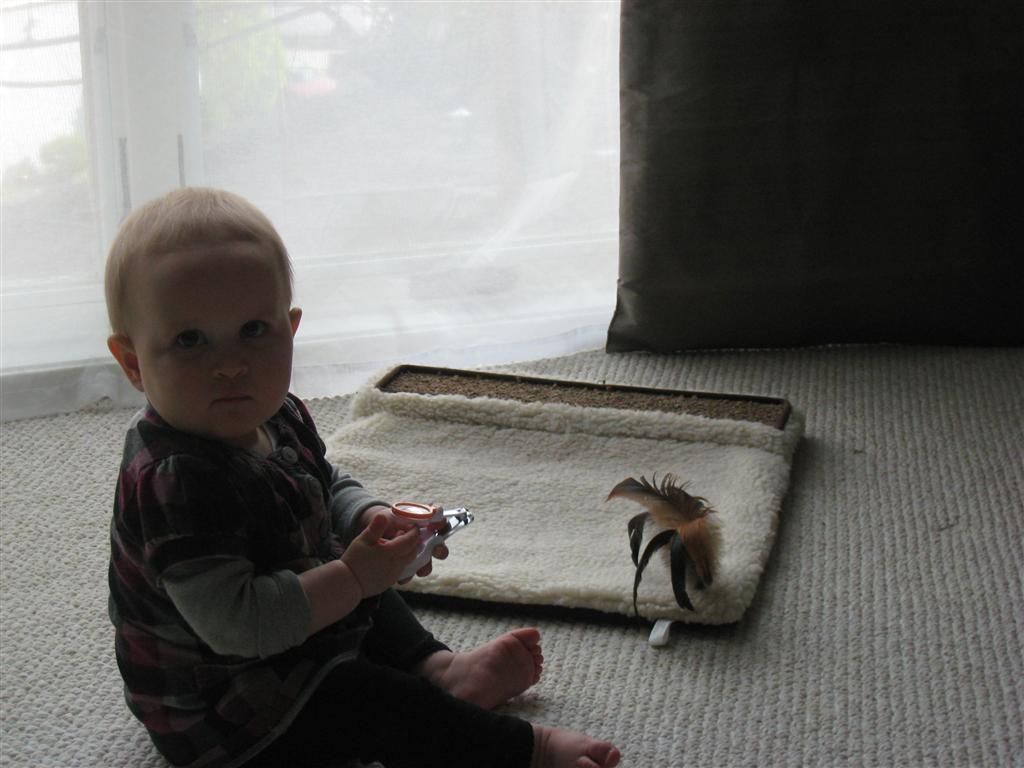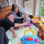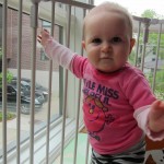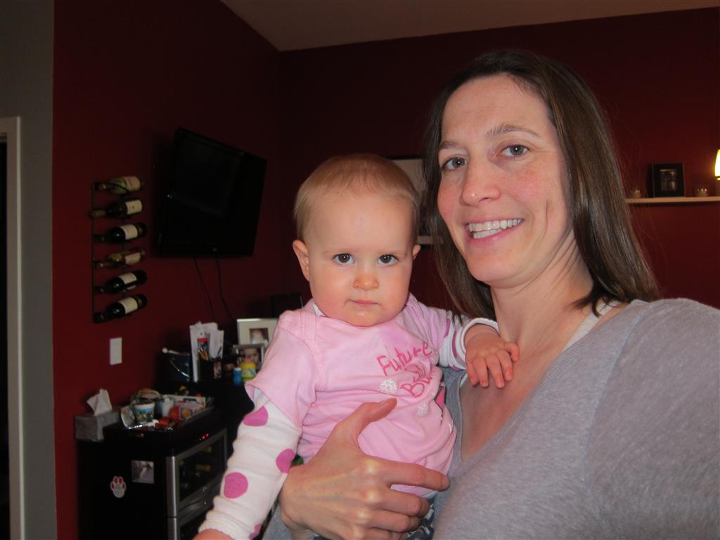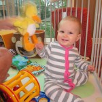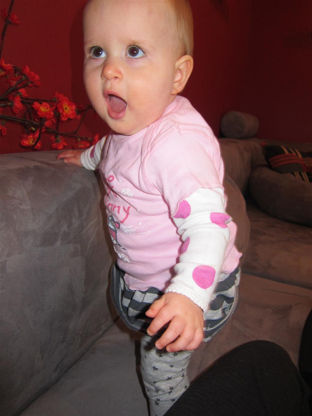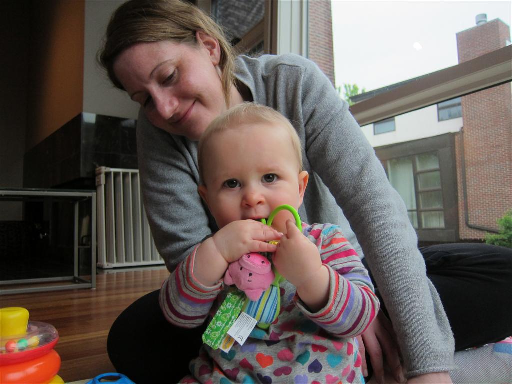 It was a fun packed week with lots of visitors at Eleanor’s house.  Early in the week, we were practicing our standing and crawling.  Zapa has to be increasingly on her toes to as Eleanor’s reach and quickness both increase.  Papa and Mimi arrived on thursday night, and Eleanor had lots of fun playing with them all weekend.  There were lots of smiles, lots of meals, and lots of standing.   Unfortunately, the weather didn’t cooperate, so we didn’t get outside much.  In fact, Dad had to cook the burgers and shish kabobs under cover of an umbrella on Sunday, when Uncle B, Breanne, Tia and Jay came over.   As if all that excitement wasn’t enough, a new tooth also popped through this week, a bottom tooth on the left side, tooth number seven in all.  On the sad side, Eleanor had her first painful diaper rash this week as well – which put a little damper on Saturday’s fun – poor thing.
