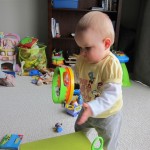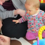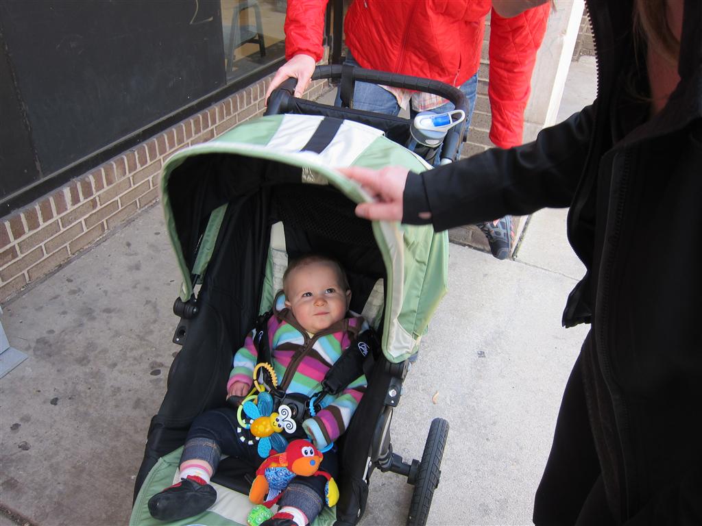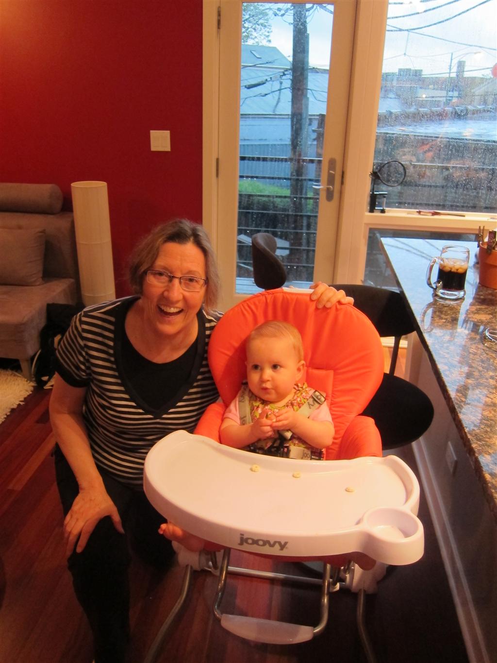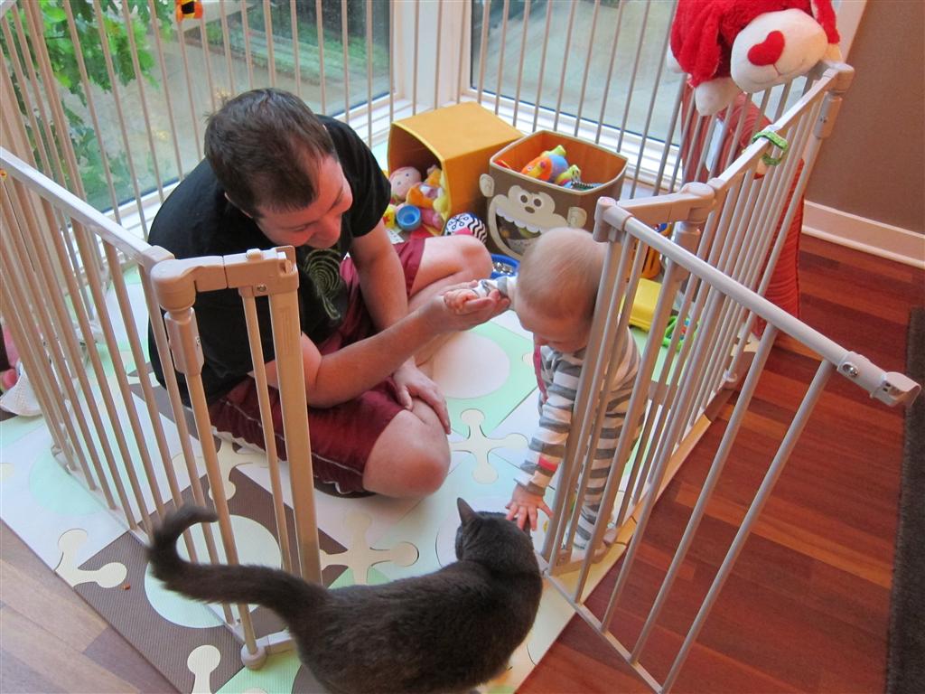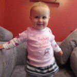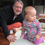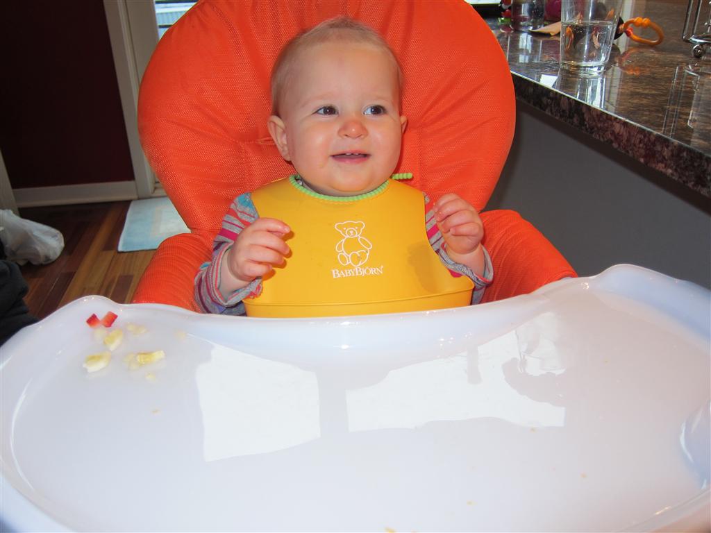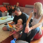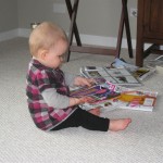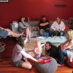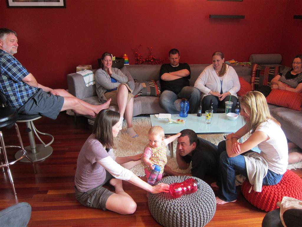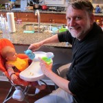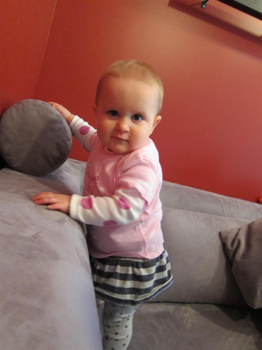 It was a fun packed week with lots of visitors at Eleanor’s house.  Early in the week, we were practicing our standing and crawling.  Zapa has to be increasingly on her toes to as Eleanor’s reach and quickness both increase.  Papa and Mimi arrived on thursday night, and Eleanor had lots of fun playing with them all weekend.  There were lots of smiles, lots of meals, and lots of standing.   Unfortunately, the weather didn’t cooperate, so we didn’t get outside much.  In fact, Dad had to cook the burgers and shish kabobs under cover of an umbrella on Sunday, when Uncle B, Breanne, Tia and Jay came over.   As if all that excitement wasn’t enough, a new tooth also popped through this week, a bottom tooth on the left side, tooth number seven in all.  On the sad side, Eleanor had her first painful diaper rash this week as well – which put a little damper on Saturday’s fun – poor thing.