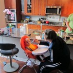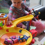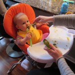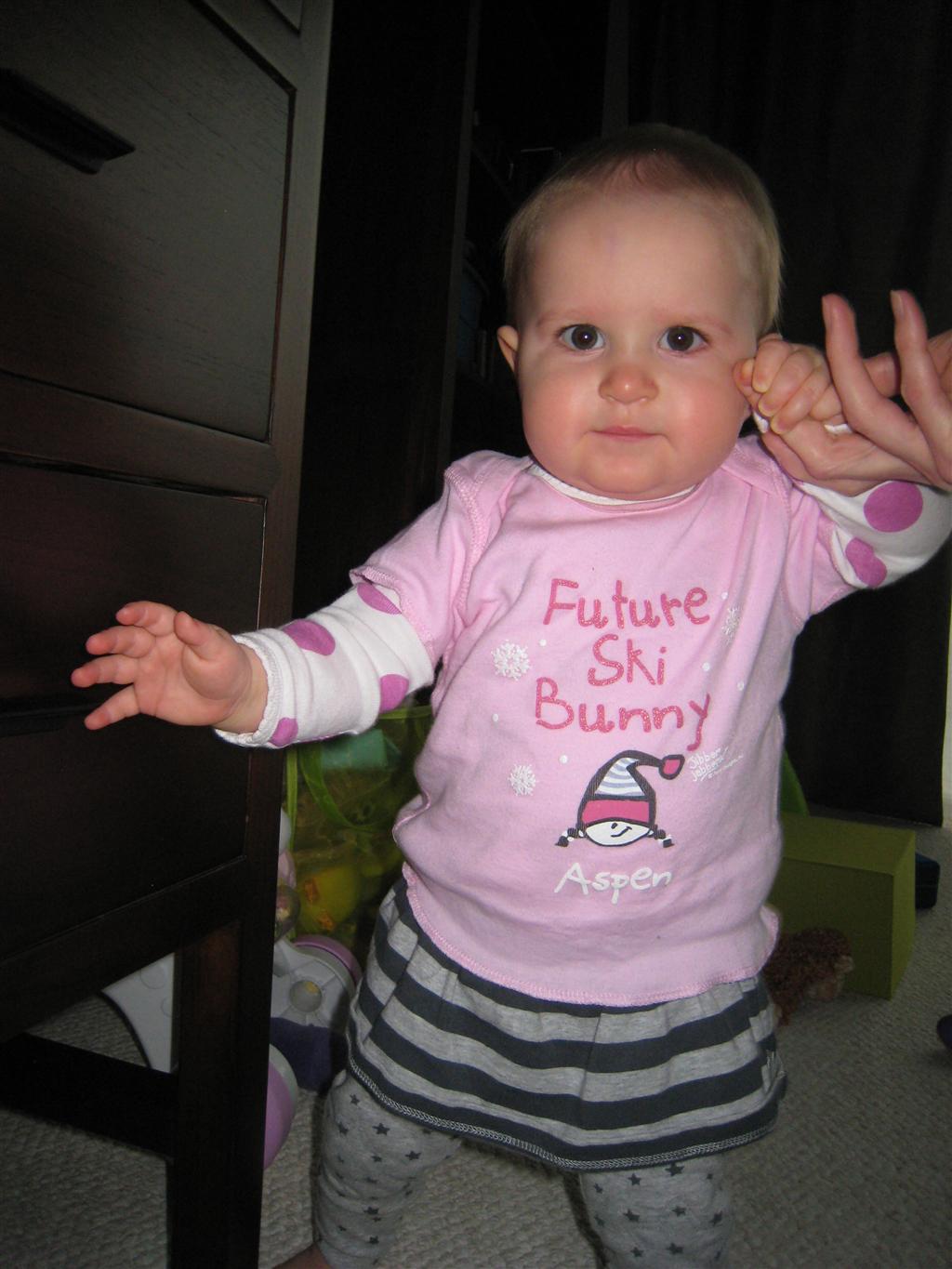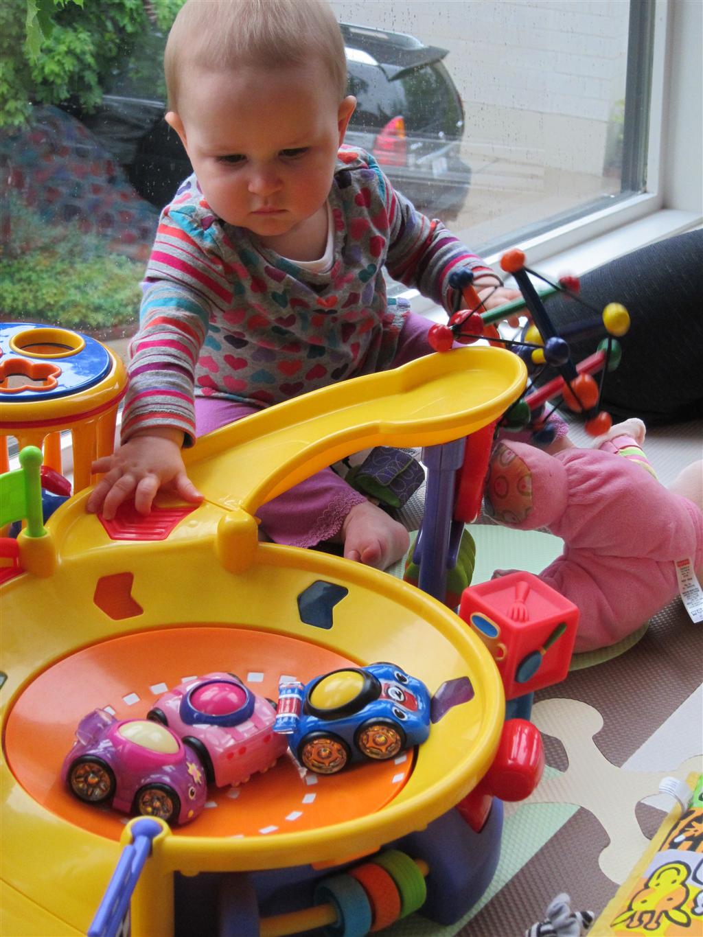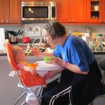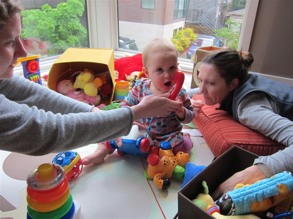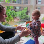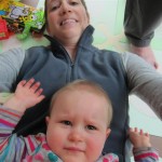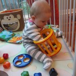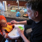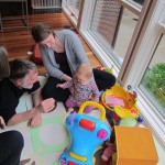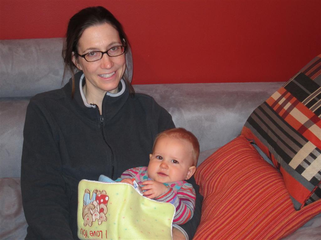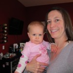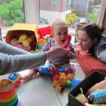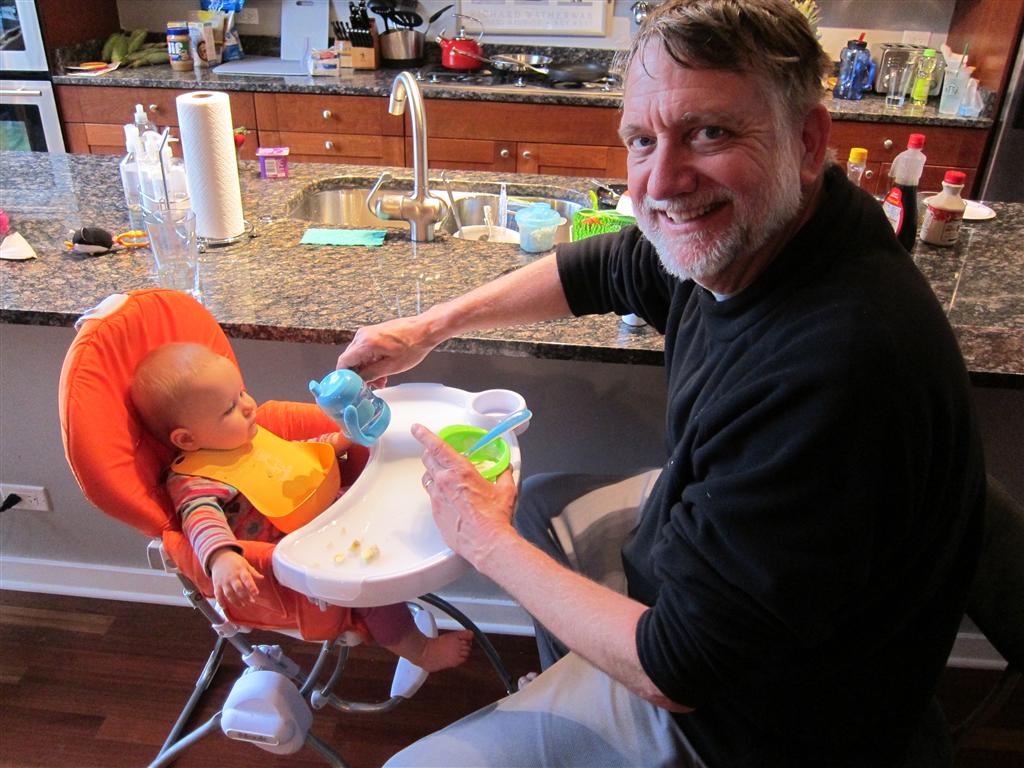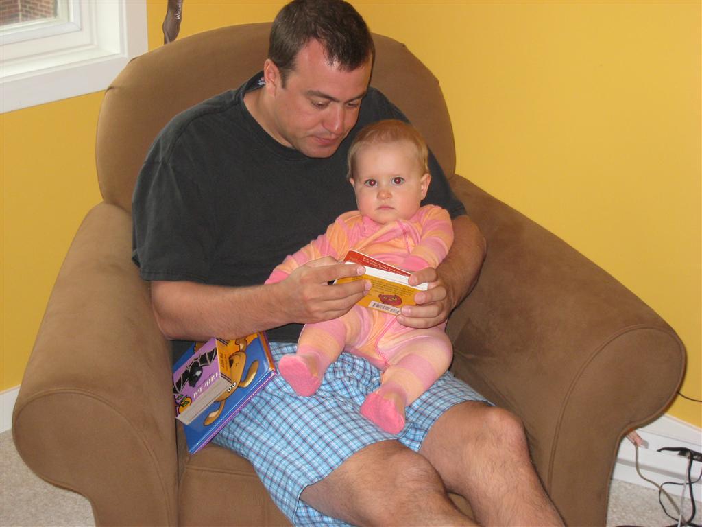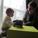 It was a fun packed week with lots of visitors at Eleanor’s house.  Early in the week, we were practicing our standing and crawling.  Zapa has to be increasingly on her toes to as Eleanor’s reach and quickness both increase.  Papa and Mimi arrived on thursday night, and Eleanor had lots of fun playing with them all weekend.  There were lots of smiles, lots of meals, and lots of standing.   Unfortunately, the weather didn’t cooperate, so we didn’t get outside much.  In fact, Dad had to cook the burgers and shish kabobs under cover of an umbrella on Sunday, when Uncle B, Breanne, Tia and Jay came over.   As if all that excitement wasn’t enough, a new tooth also popped through this week, a bottom tooth on the left side, tooth number seven in all.  On the sad side, Eleanor had her first painful diaper rash this week as well – which put a little damper on Saturday’s fun – poor thing.