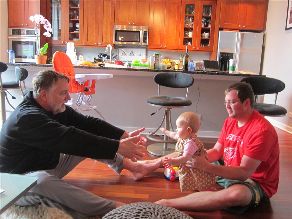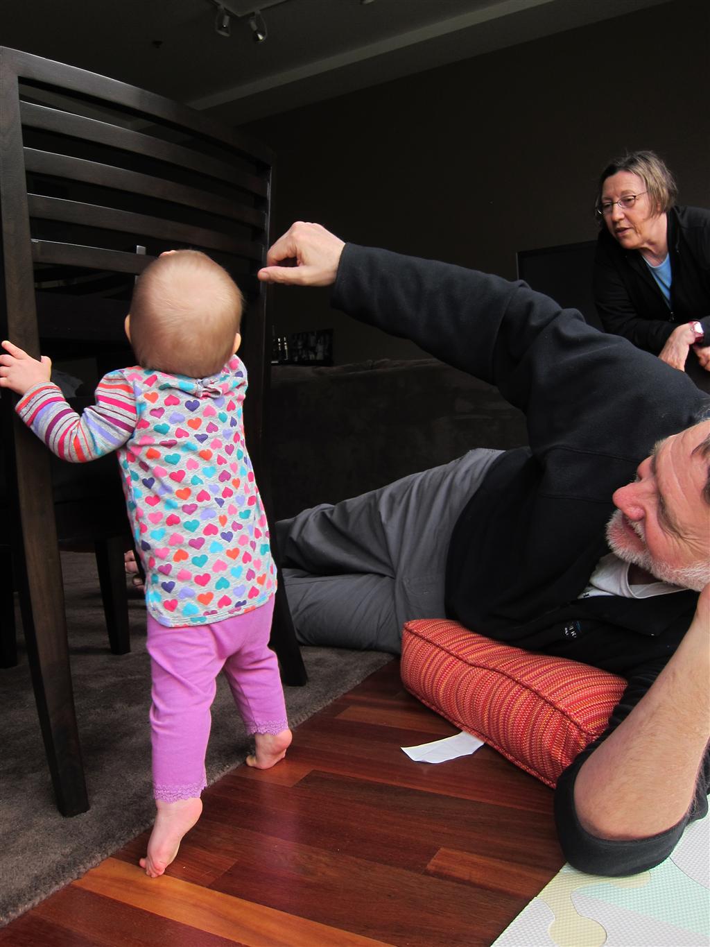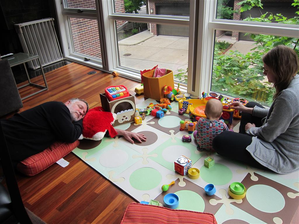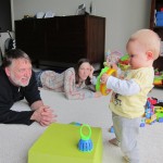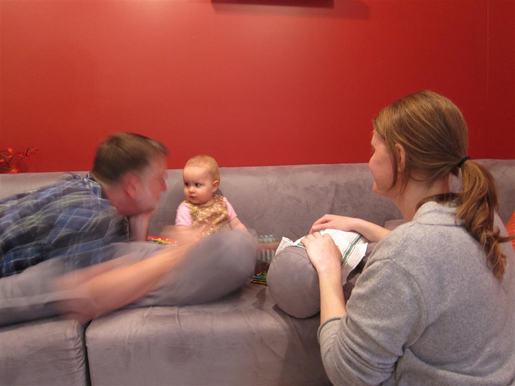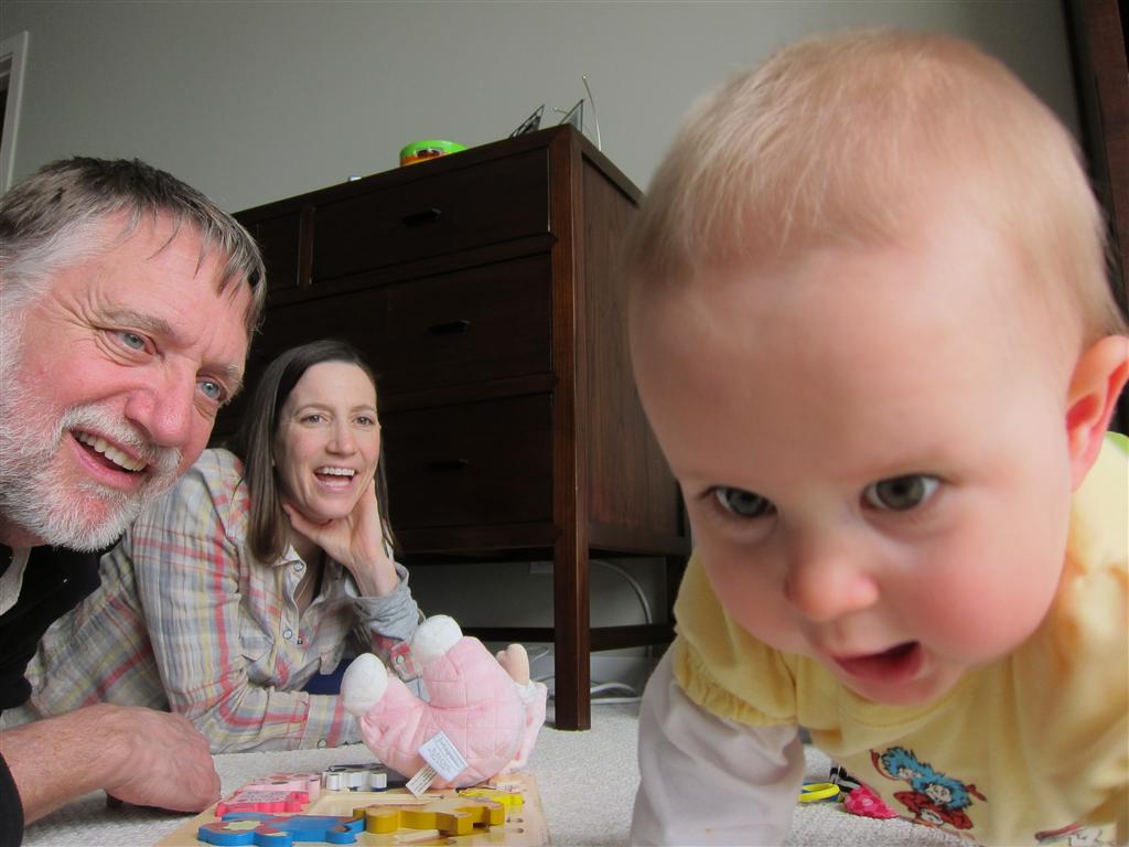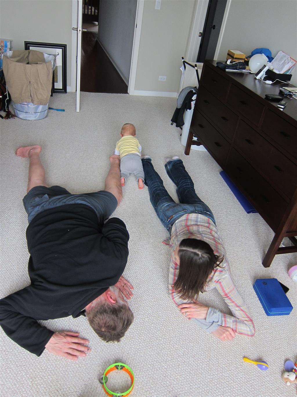 2. I love the one of baby crawling away while mommy and gramps are laying on the floor!