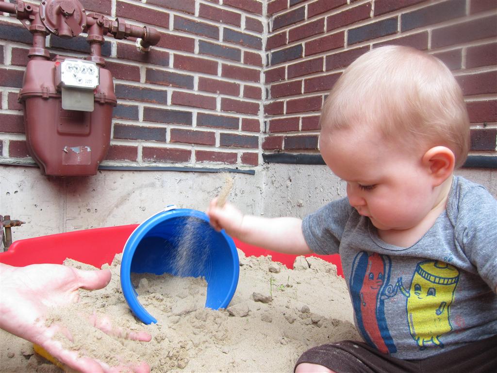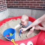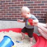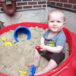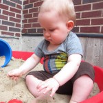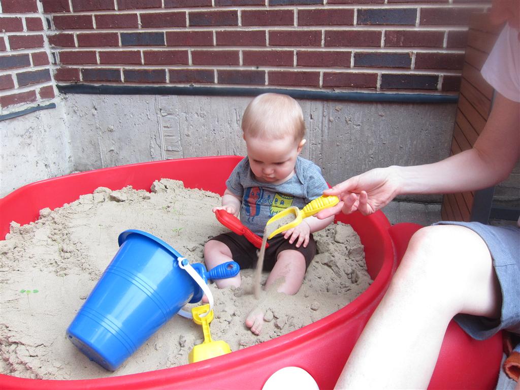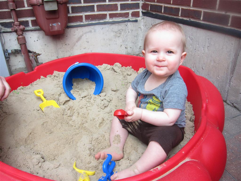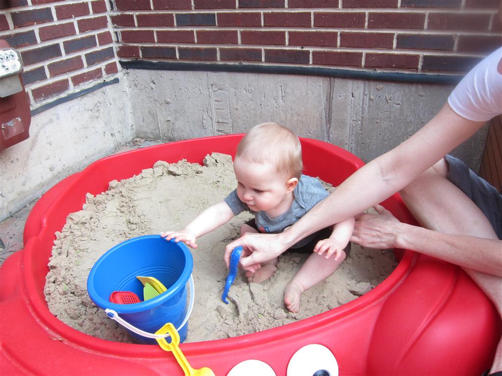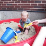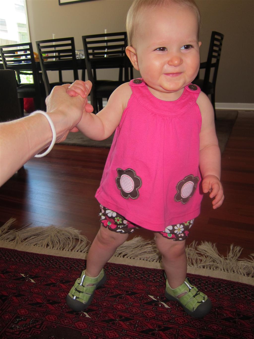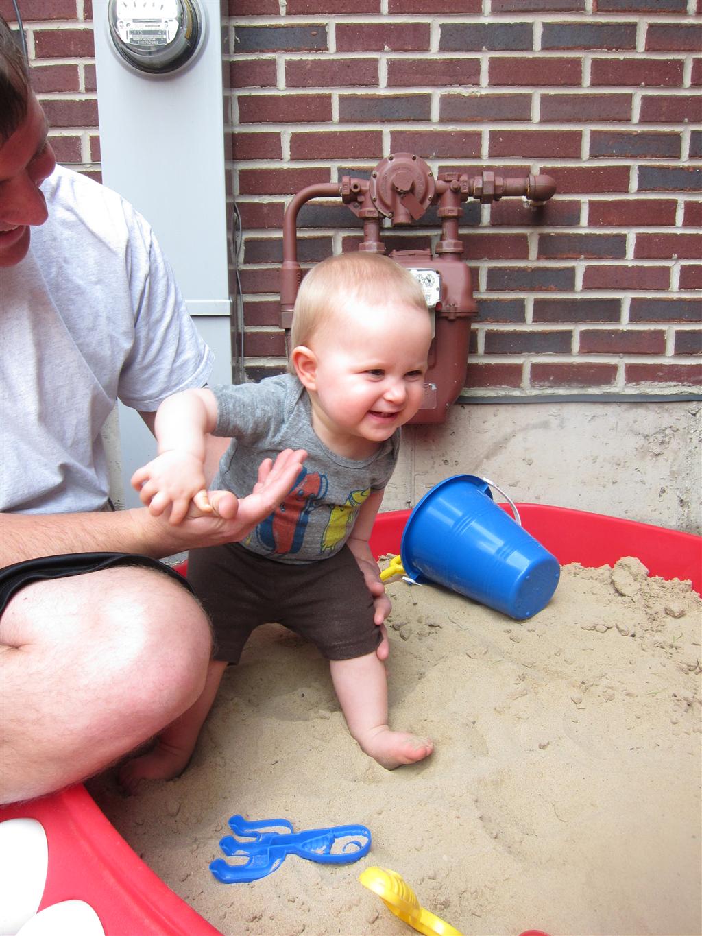 After several delays for bad weather, Eleanor finally got to try out her sandbox this week. She was a bit tentative at first, but eventually got the hang of it. She liked the sand pouring through the sieve shovel, and then running her own hand through the sand. She gave her hand quite a stare when she lifted it back out of the sand and there was still sand stuck on it! Eleanor also enjoyed hitting the town this week in her new Keen sandals – maybe next week we can get a picture of her and dad in matching Keens.