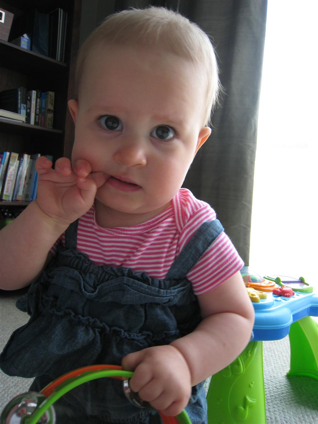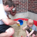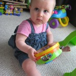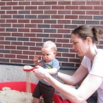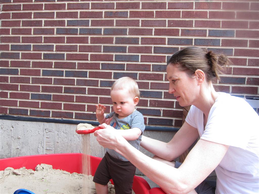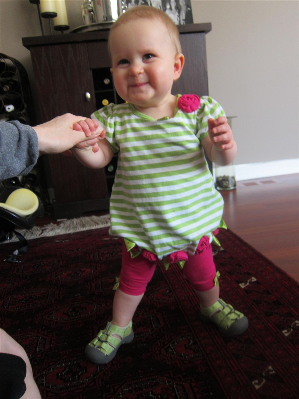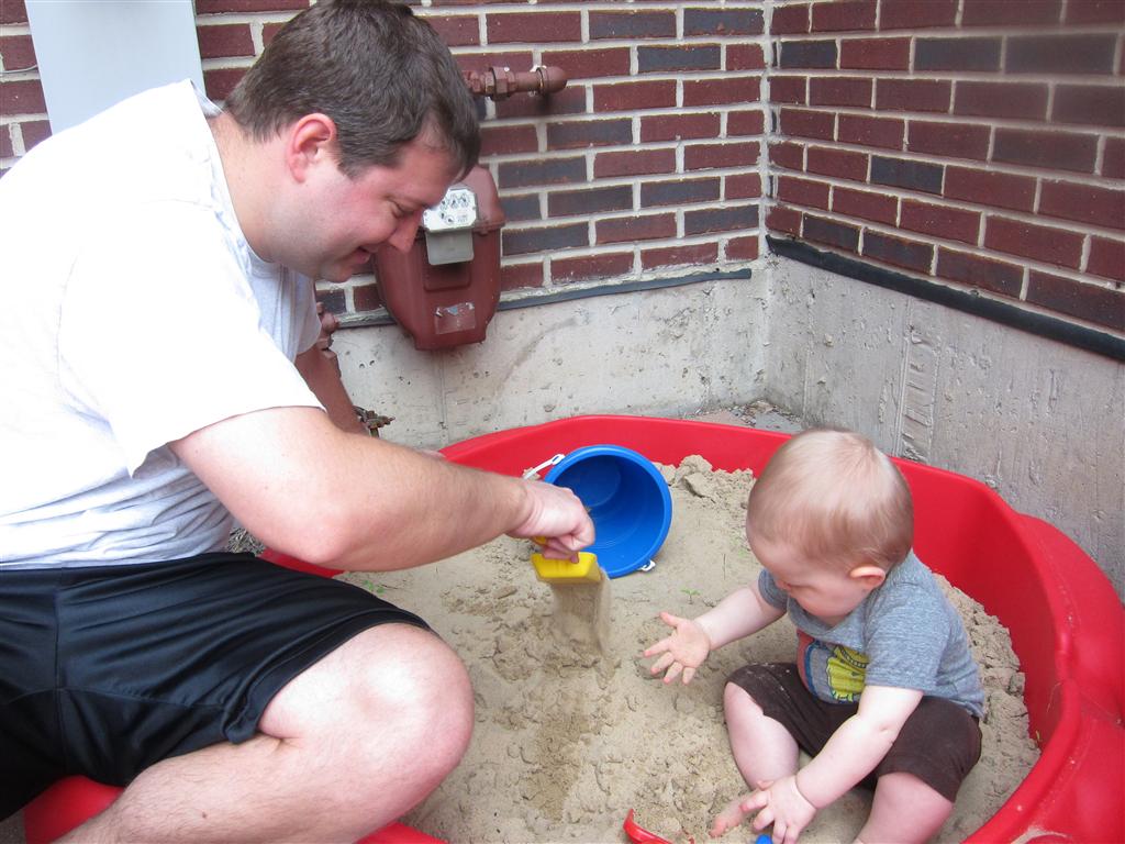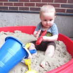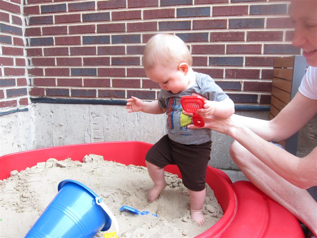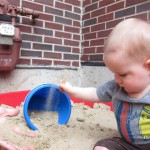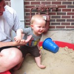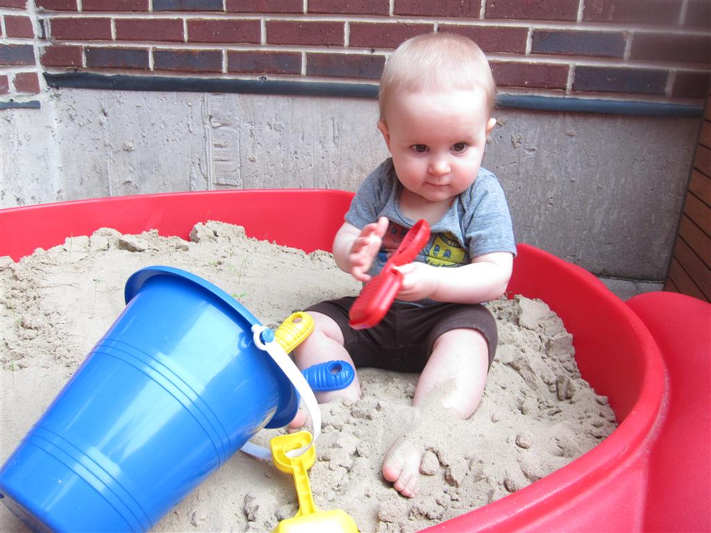 After several delays for bad weather, Eleanor finally got to try out her sandbox this week. She was a bit tentative at first, but eventually got the hang of it. She liked the sand pouring through the sieve shovel, and then running her own hand through the sand. She gave her hand quite a stare when she lifted it back out of the sand and there was still sand stuck on it! Eleanor also enjoyed hitting the town this week in her new Keen sandals – maybe next week we can get a picture of her and dad in matching Keens.
