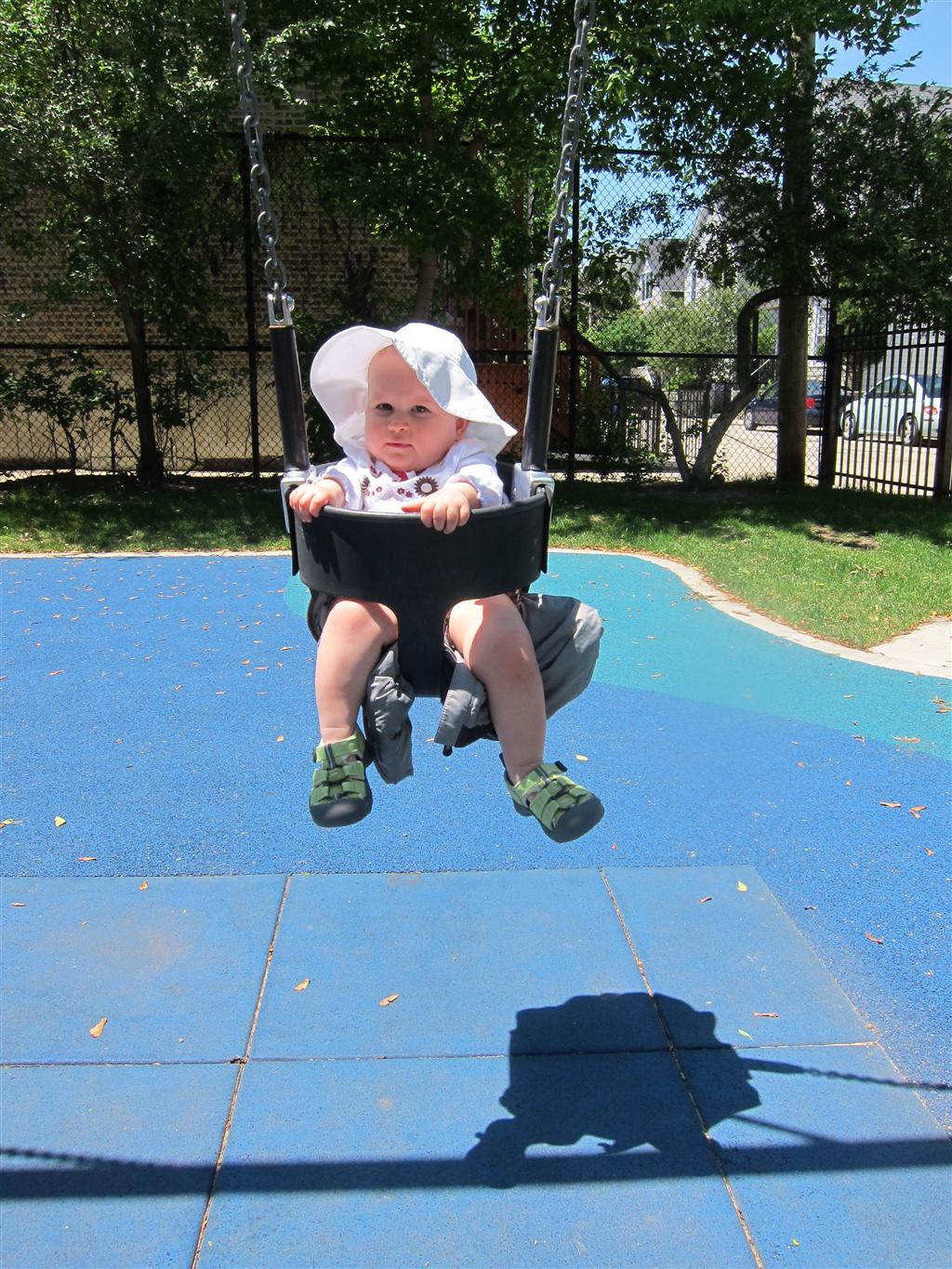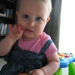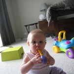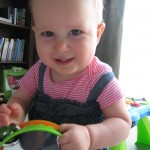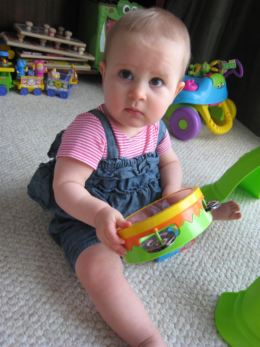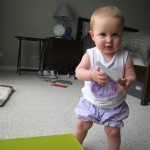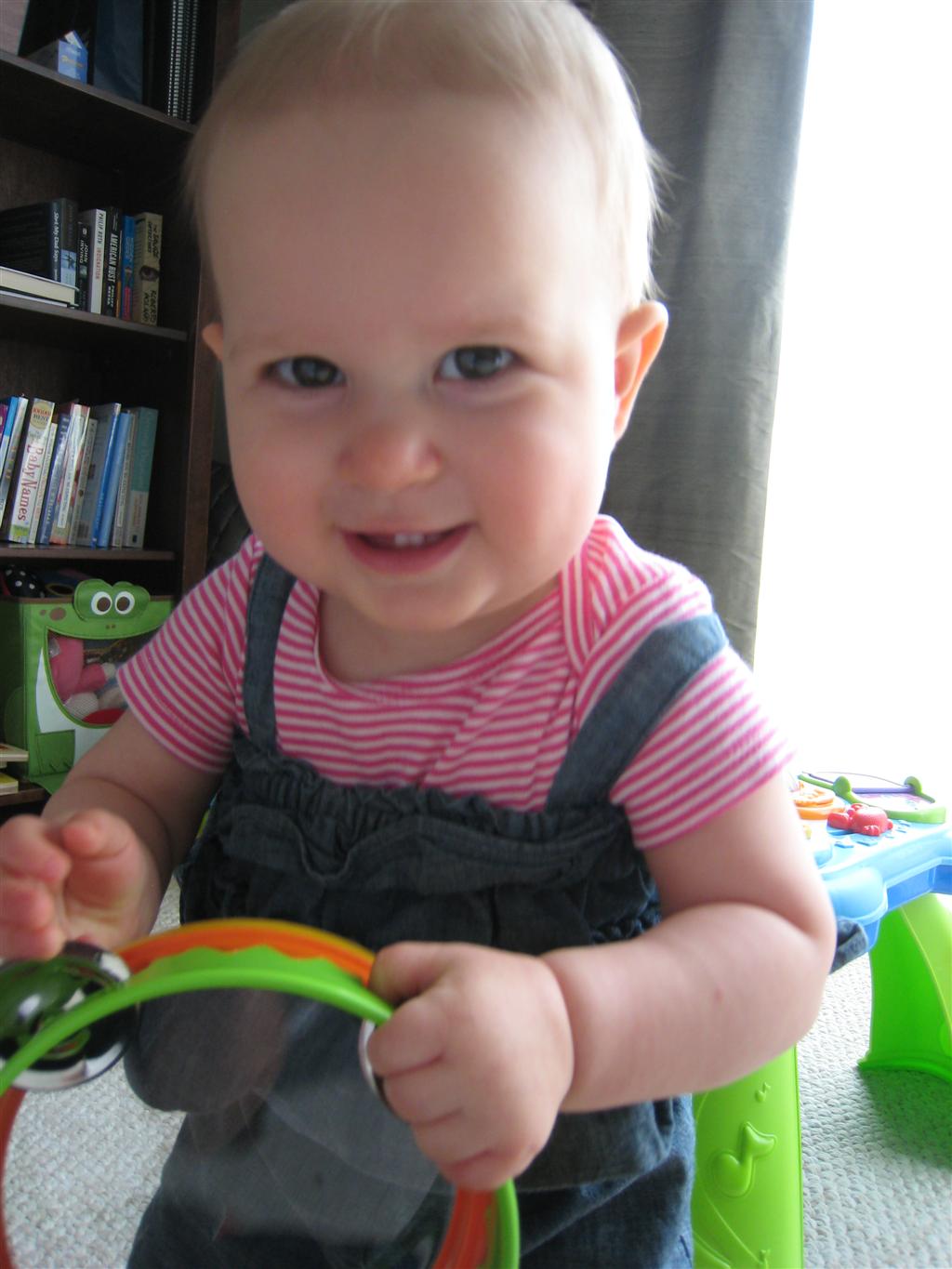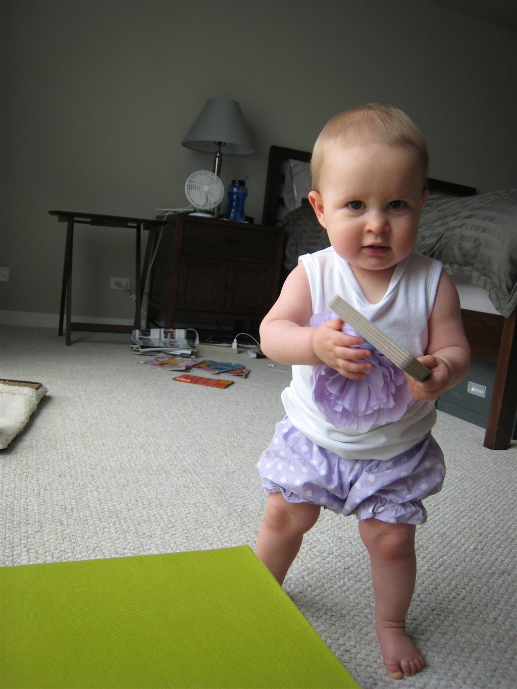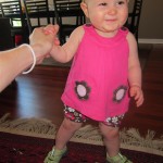 After several delays for bad weather, Eleanor finally got to try out her sandbox this week. She was a bit tentative at first, but eventually got the hang of it. She liked the sand pouring through the sieve shovel, and then running her own hand through the sand. She gave her hand quite a stare when she lifted it back out of the sand and there was still sand stuck on it! Eleanor also enjoyed hitting the town this week in her new Keen sandals – maybe next week we can get a picture of her and dad in matching Keens.