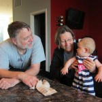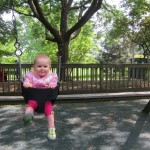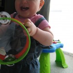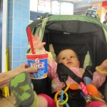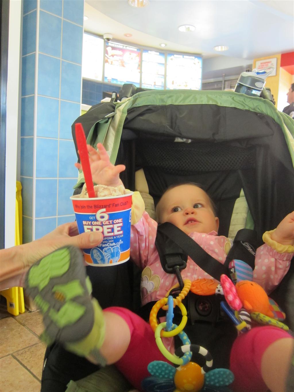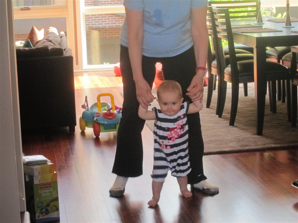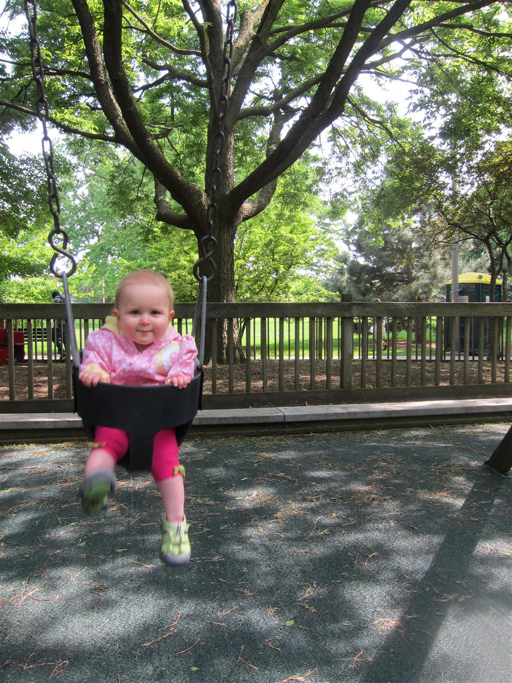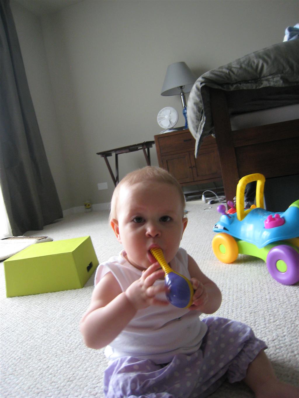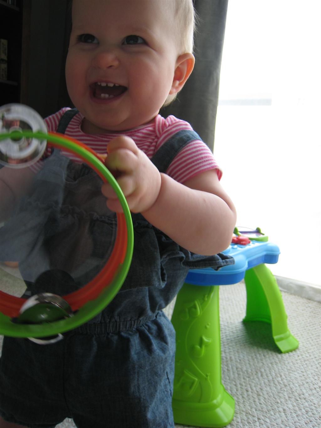 After several delays for bad weather, Eleanor finally got to try out her sandbox this week. She was a bit tentative at first, but eventually got the hang of it. She liked the sand pouring through the sieve shovel, and then running her own hand through the sand. She gave her hand quite a stare when she lifted it back out of the sand and there was still sand stuck on it! Eleanor also enjoyed hitting the town this week in her new Keen sandals – maybe next week we can get a picture of her and dad in matching Keens.