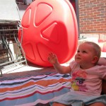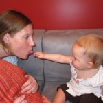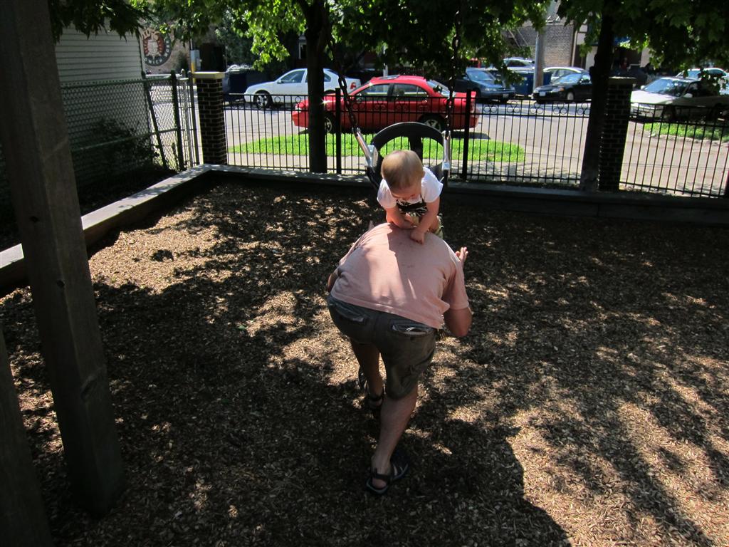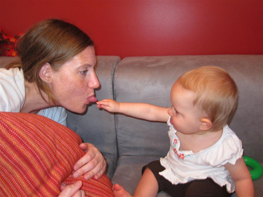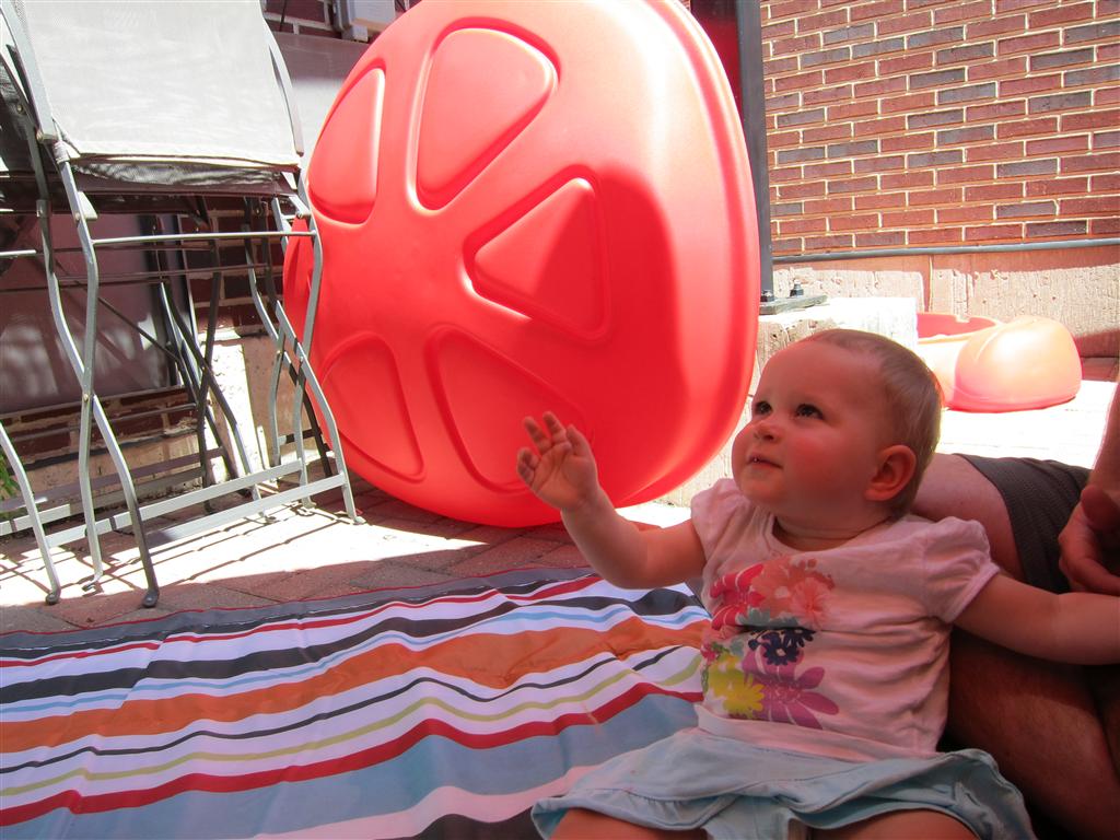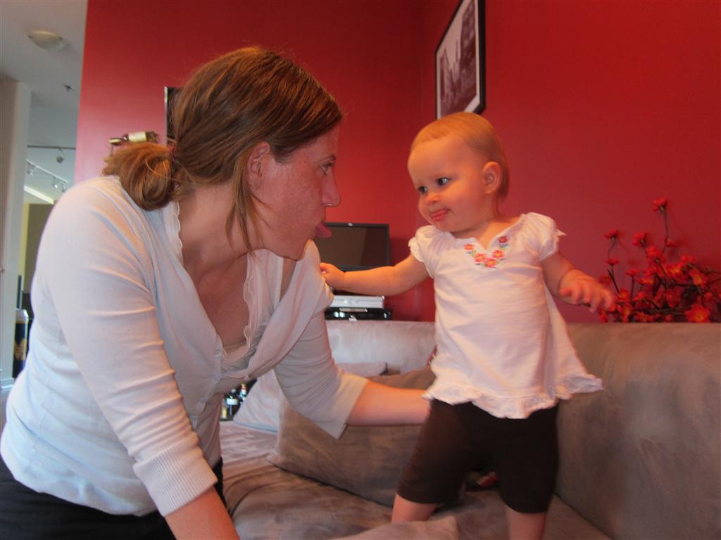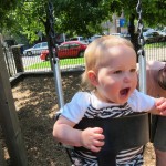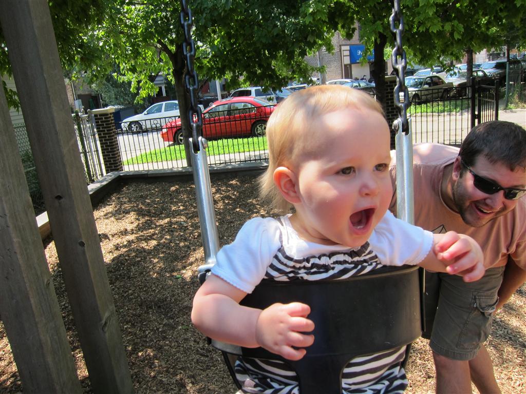Eleanor had a slow, relaxing week this week, sandwiched between her flurry of visitors this past month, and her big birthday celebration next week. She ate a lot of mac and cheese, did a bunch of swinging, played in the sand box, and watched bubbles. I tried all weekend to get a video of her doing her bleeble-bleeble with her fingers and lips, but ended up just videoing a bunch of adults doing it :) She has perfected a new noise-object association, this time with a stuffed monkey. She does a fairly good impression of the “Ahh-ahh” part of Amy’s “Oohh-oohh ahhh-ahhh” monkey noise when she sees it. A few firsts this week: