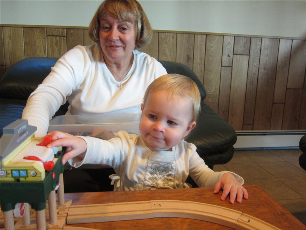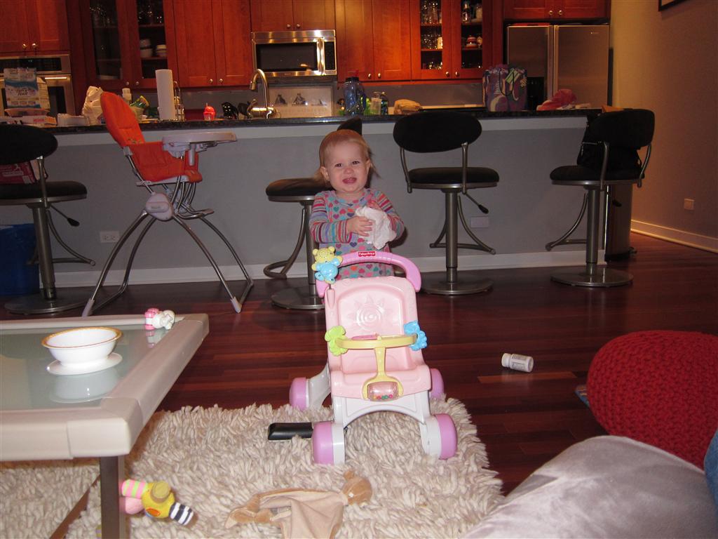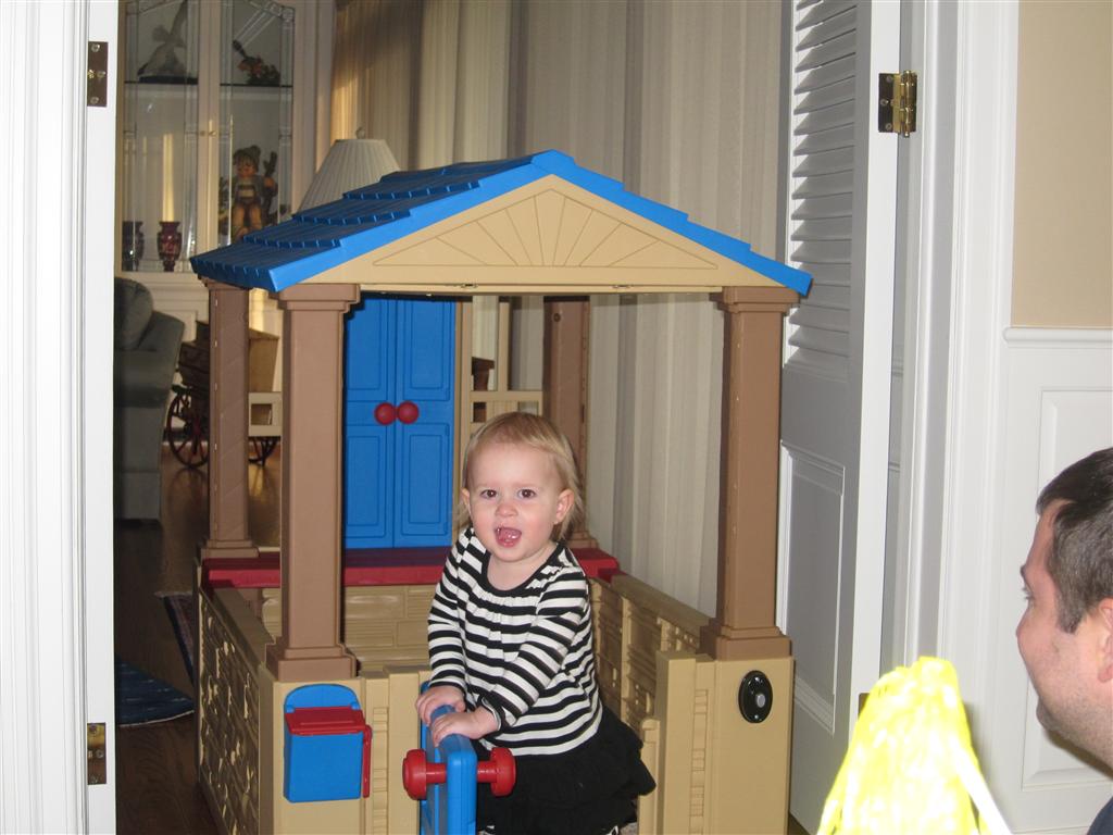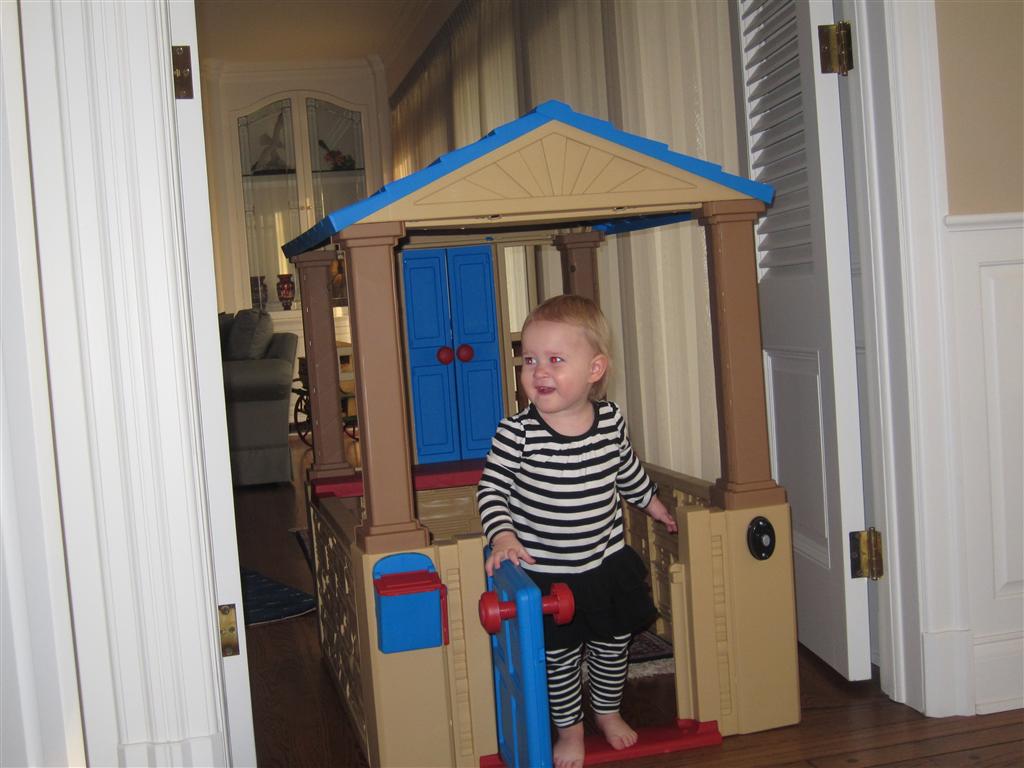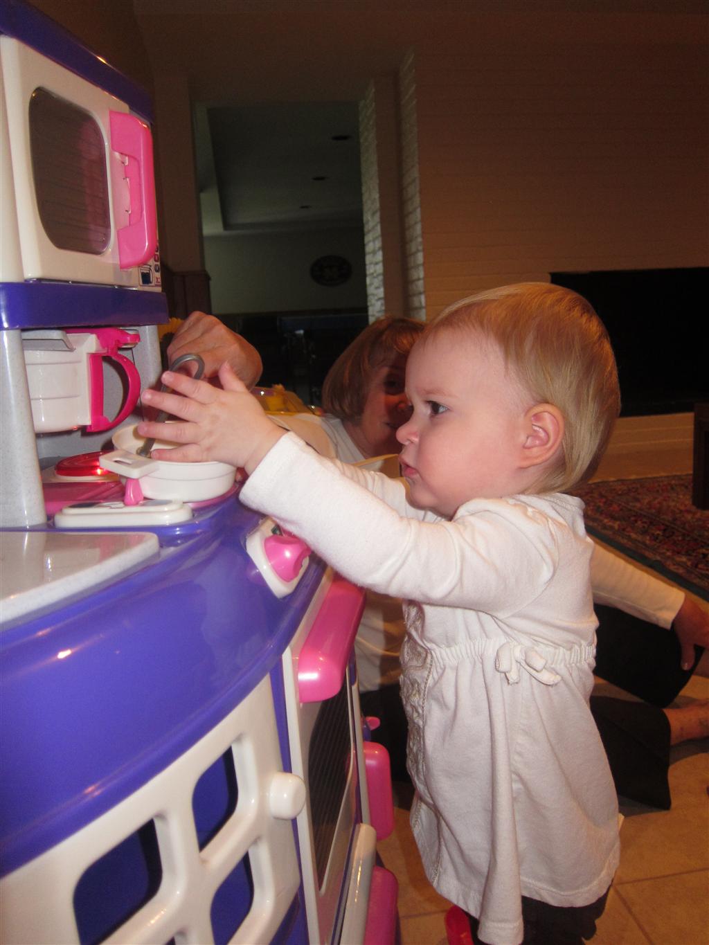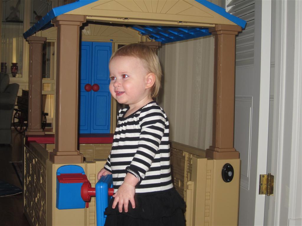 Eleanor celebrated Thanksgiving at Great Grandma’s house, and had fun hanging out with all of her Cousins, Aunts, Uncles, and Grandparents. She was able to participate in Thanksgiving dinner for the first time, but didn’t love any of the items that she tried – not even the mac and cheese. I think she was just confused at the whole thing. She did, however, like the red velvet cake that she ate off of Mama’s plate when she wasn’t looking. She sang her “Duet” just before grace at Thanksgiving dinner, and everyone was very impressed. The Thanksgiving fun was bookended with Papa and Mimi before, and Grandma and Grandpa after. Grandma and Grandpa’s house had lots of new fun things to do, with her favorite being turning lights on and off, followed by playing in the play house, and then playing trains.