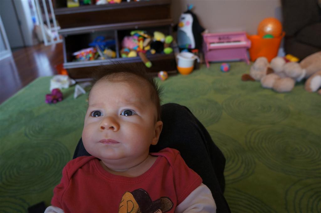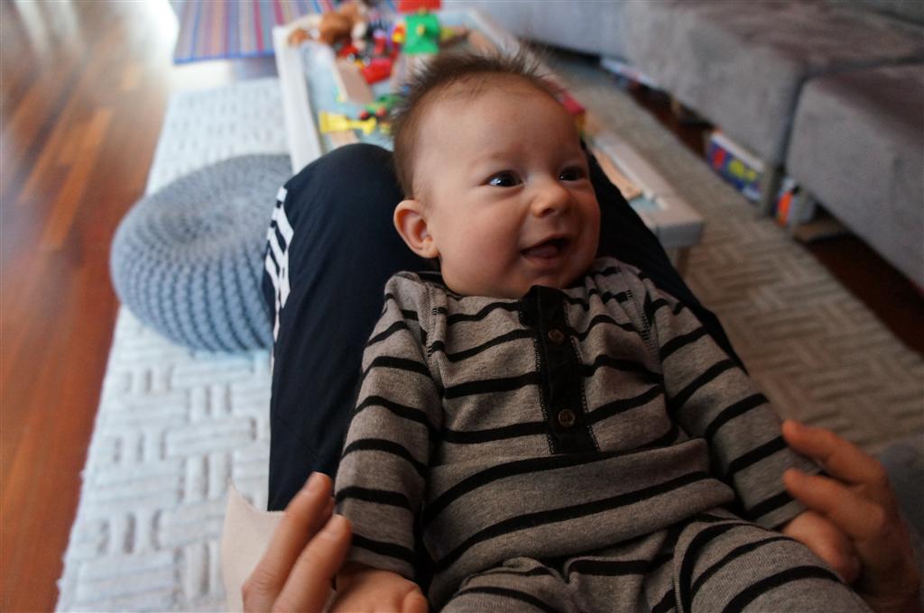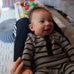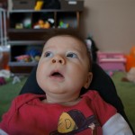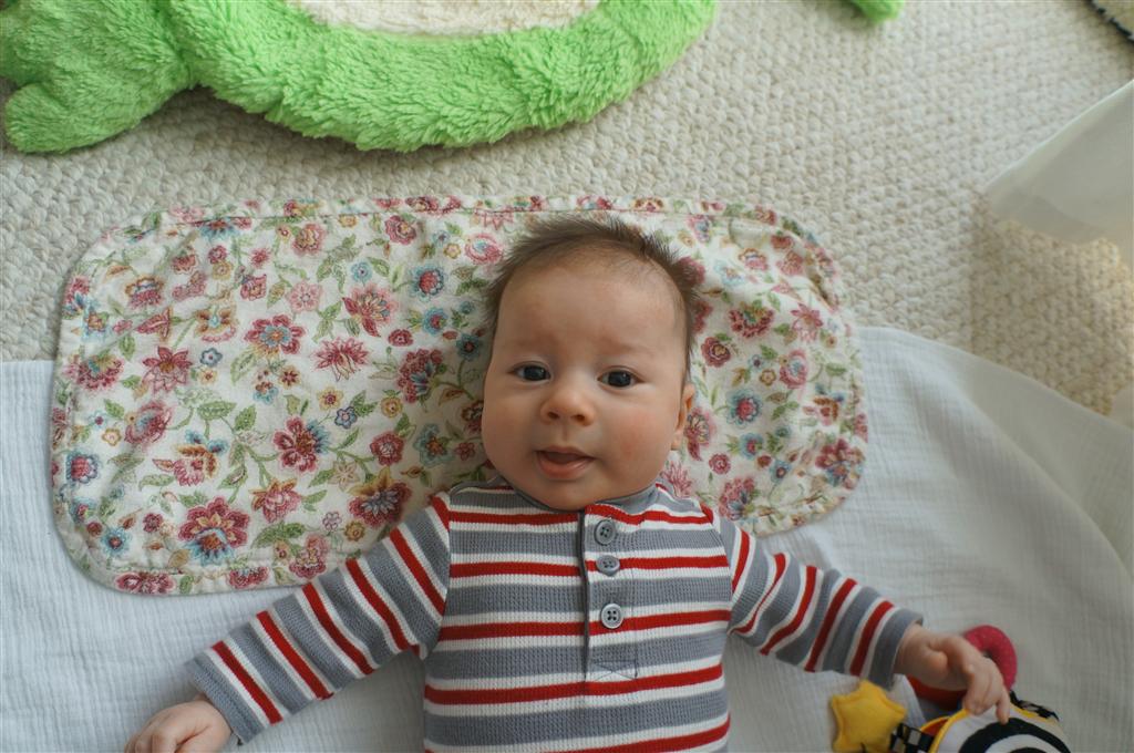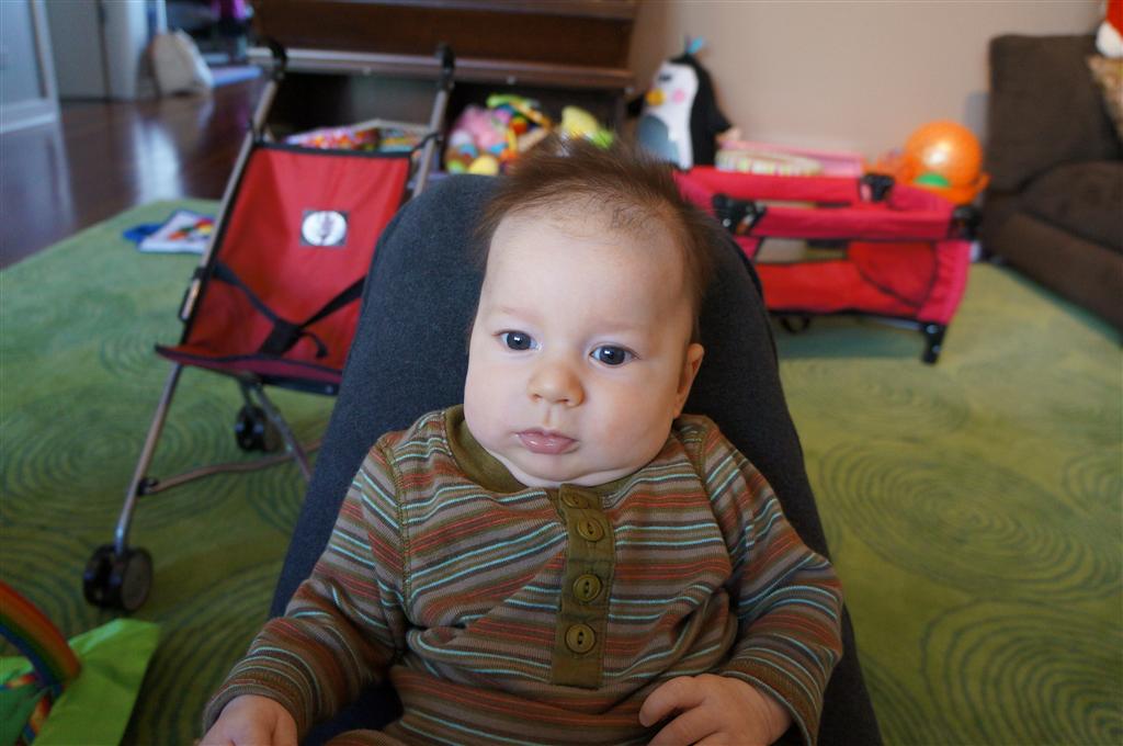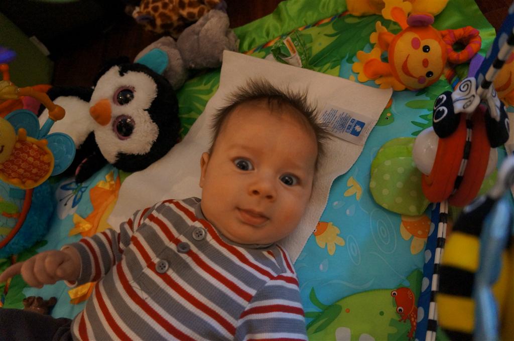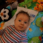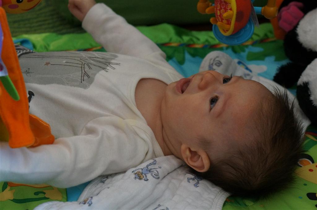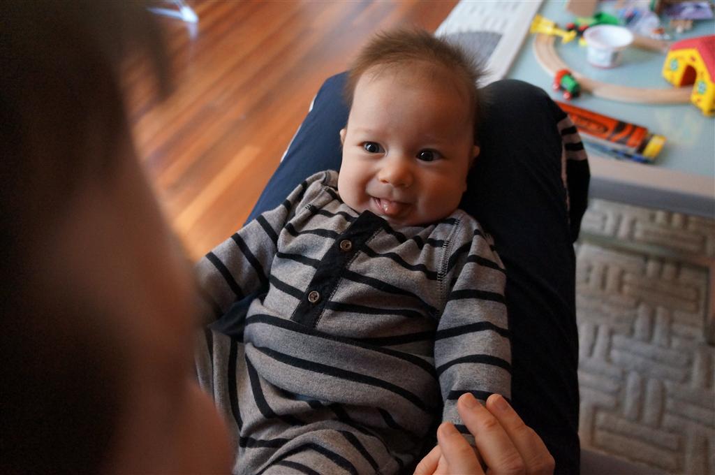 Not to be outdone, Henry is maturing before our eyes as well. Smiles are much more common now, and he has even started to make some happy noises – not quite giggles yet, but definitely the precursor to giggling. It won’t be long and we’ll have full out giggles – and probably some rolling over too. He had some good half rolls this week, as well as a couple times holding a toy in his hand. He hasn’t started reaching out for toys yet, but he is doing more grabbing with his fingers when you hold his hands.