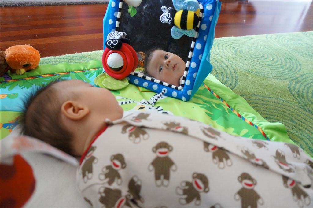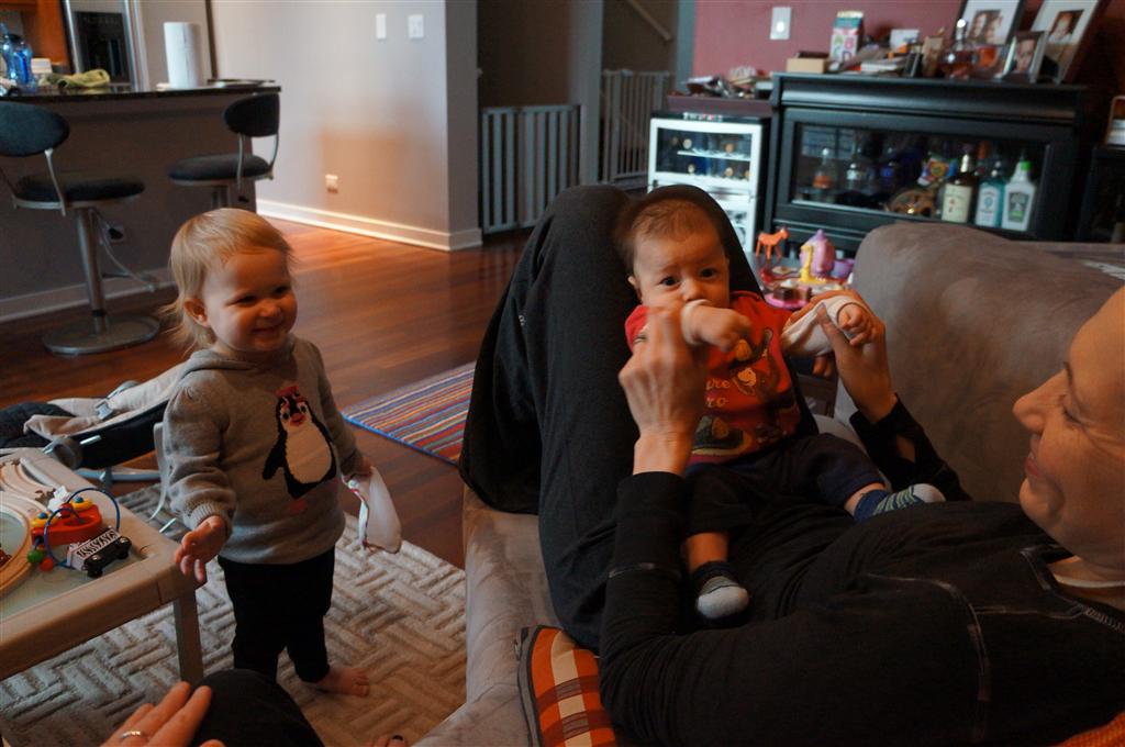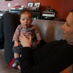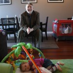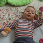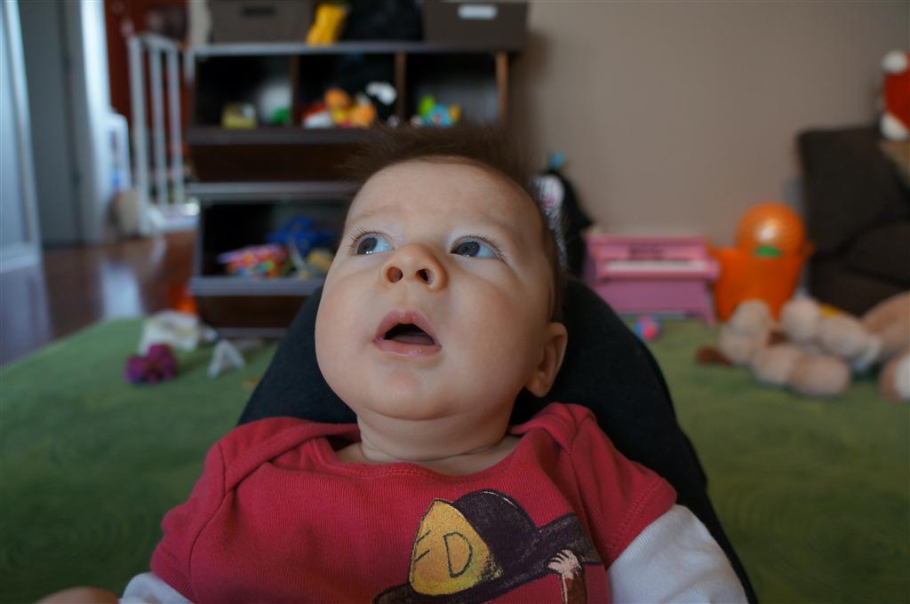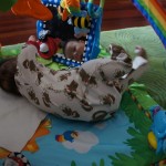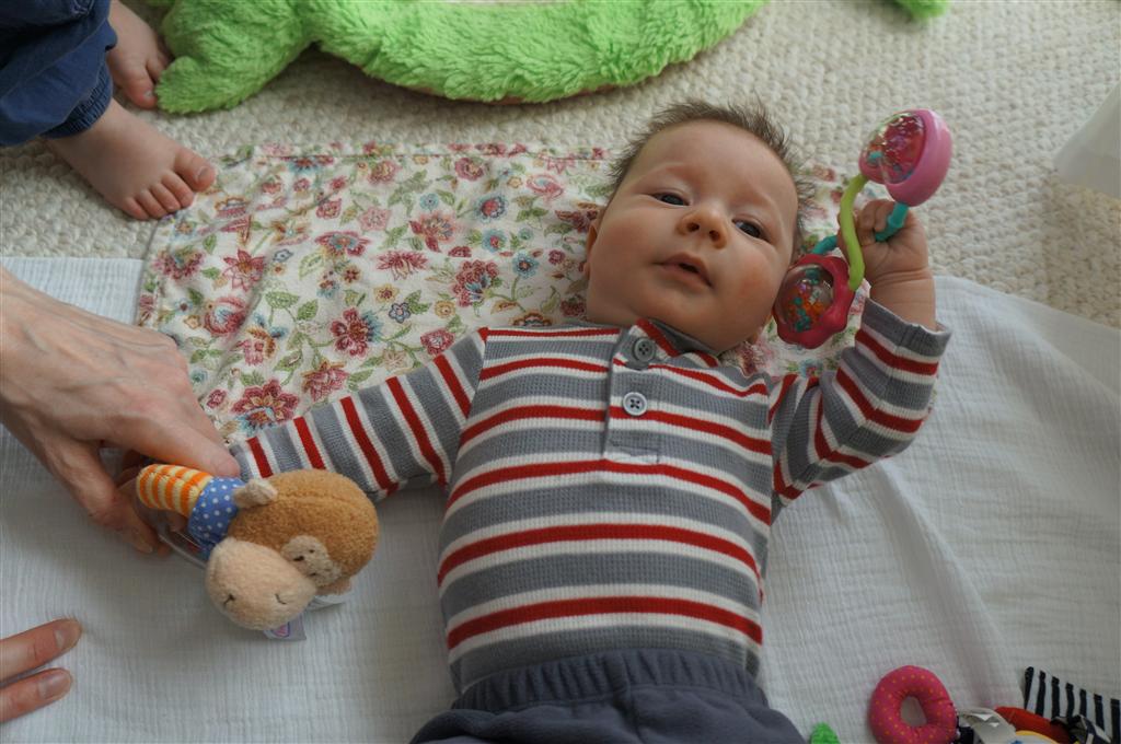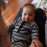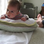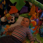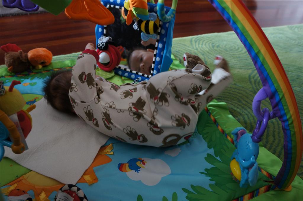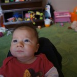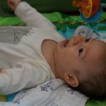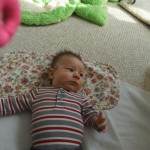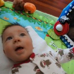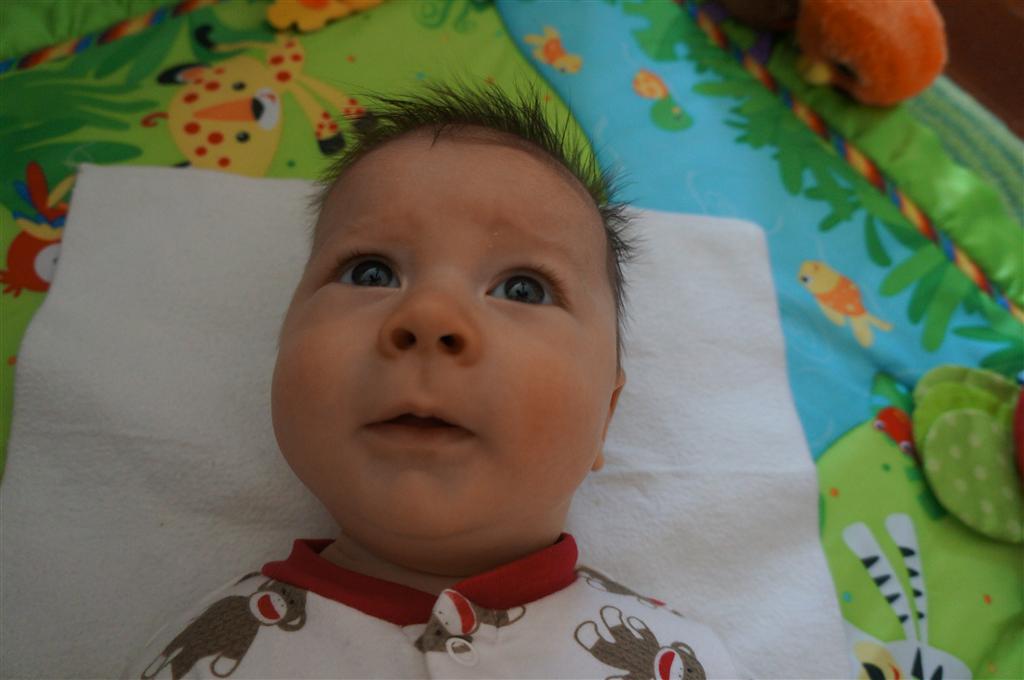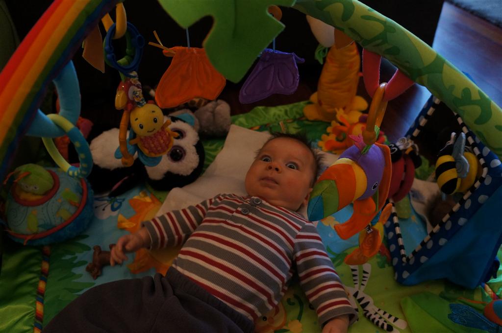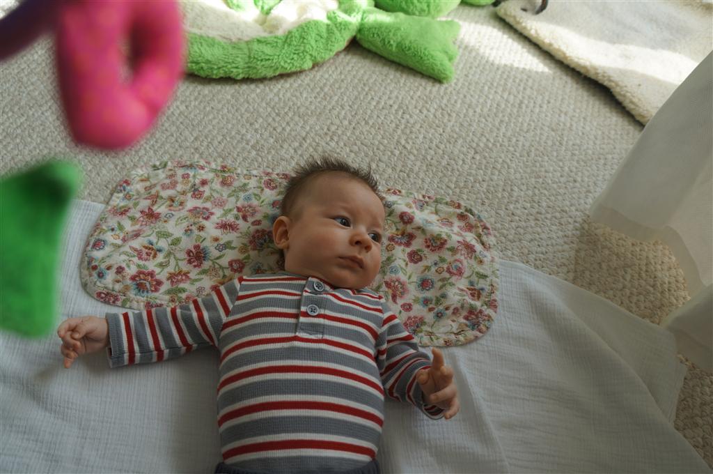 Not to be outdone, Henry is maturing before our eyes as well. Smiles are much more common now, and he has even started to make some happy noises – not quite giggles yet, but definitely the precursor to giggling. It won’t be long and we’ll have full out giggles – and probably some rolling over too. He had some good half rolls this week, as well as a couple times holding a toy in his hand. He hasn’t started reaching out for toys yet, but he is doing more grabbing with his fingers when you hold his hands.