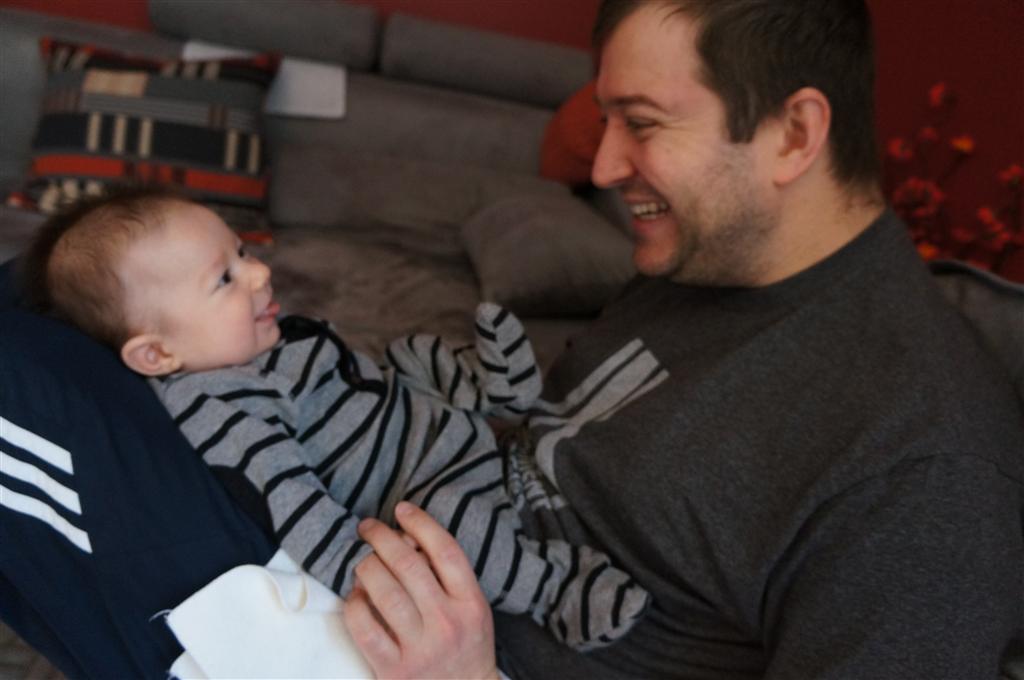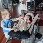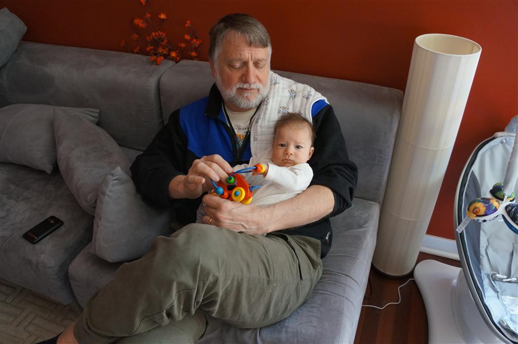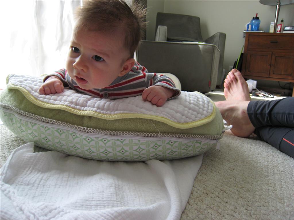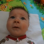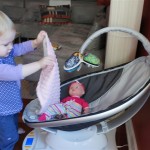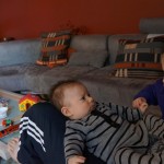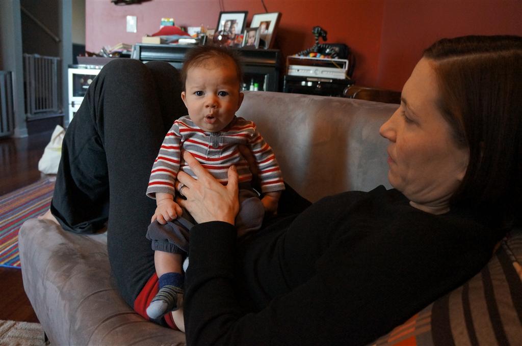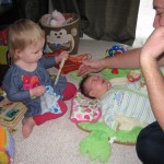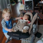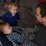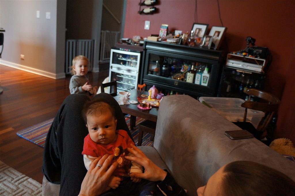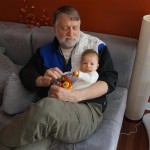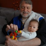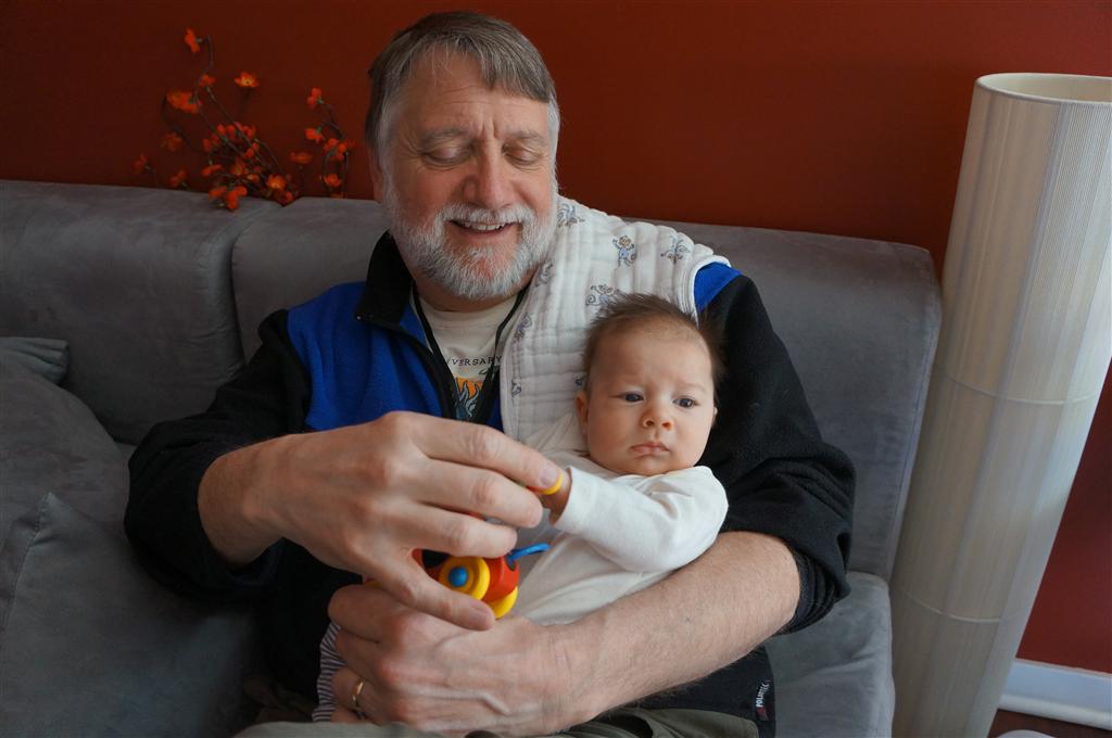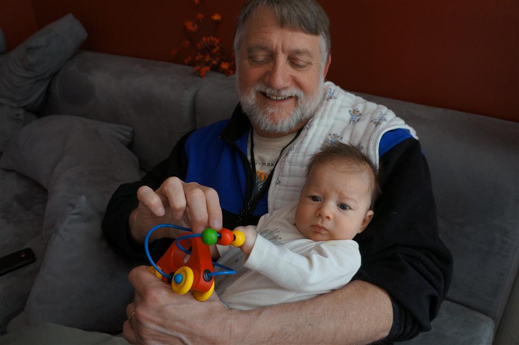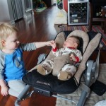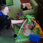 Not to be outdone, Henry is maturing before our eyes as well. Smiles are much more common now, and he has even started to make some happy noises – not quite giggles yet, but definitely the precursor to giggling. It won’t be long and we’ll have full out giggles – and probably some rolling over too. He had some good half rolls this week, as well as a couple times holding a toy in his hand. He hasn’t started reaching out for toys yet, but he is doing more grabbing with his fingers when you hold his hands.