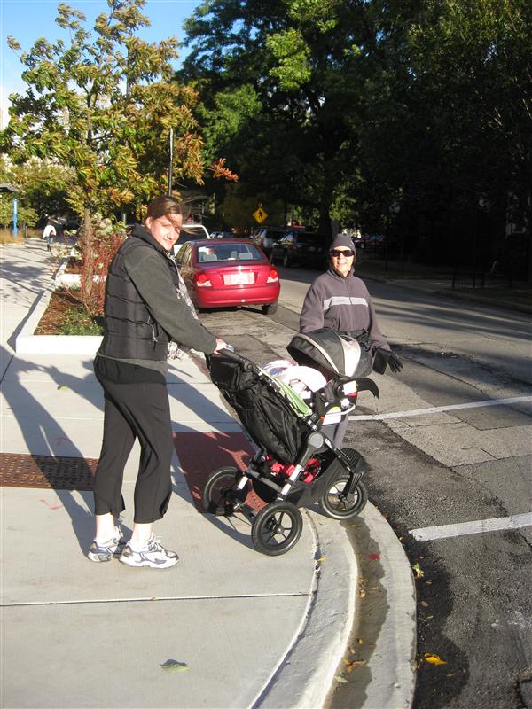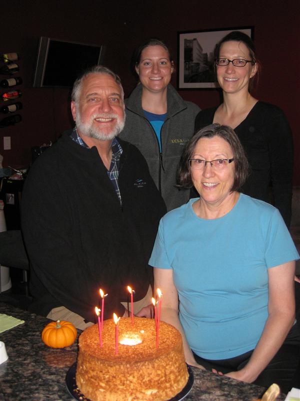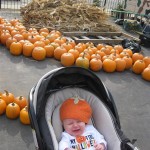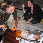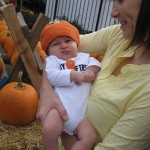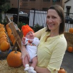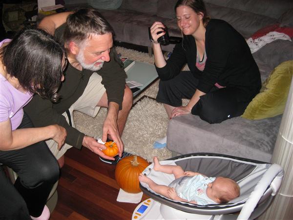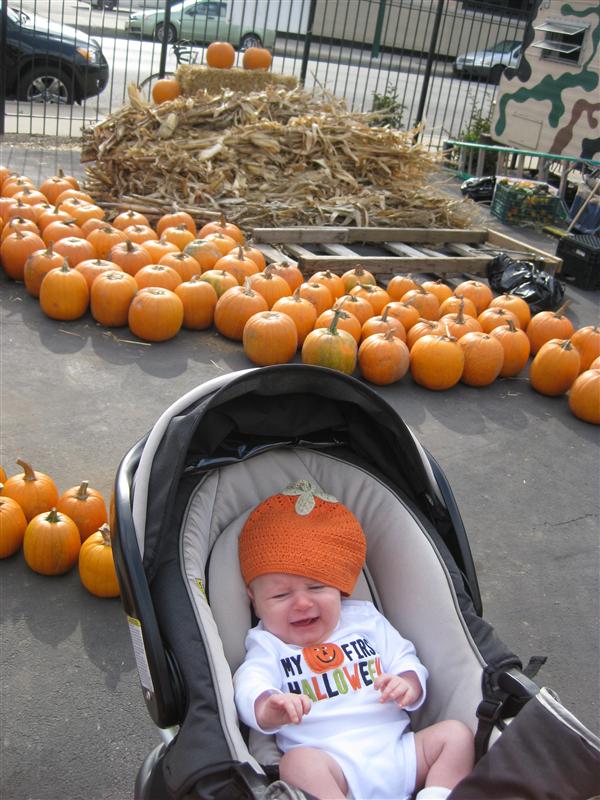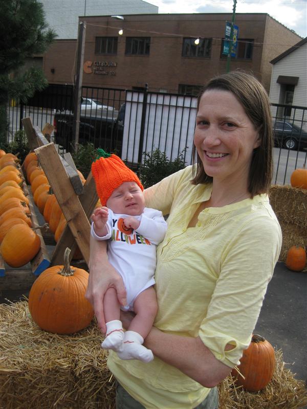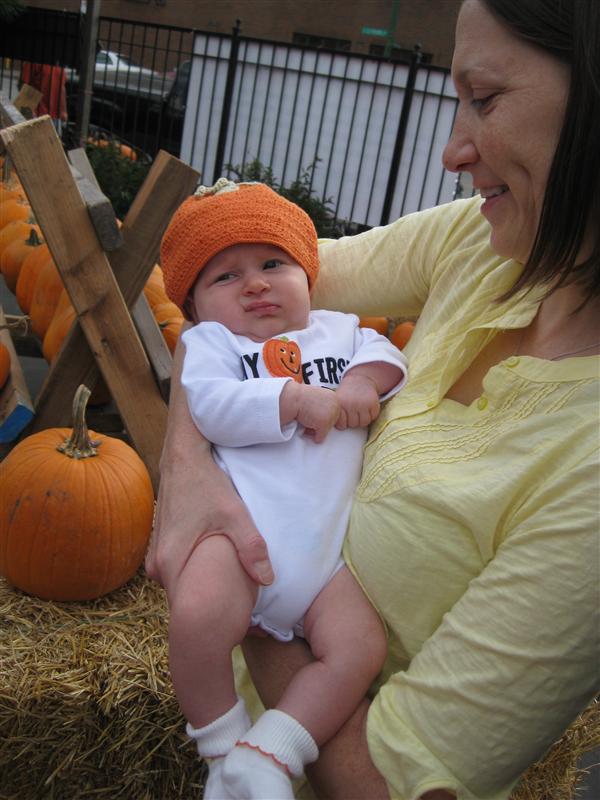 It’s been a really fun week with Ellie. She is really starting to smile a lot, each day she seems to have more fun during playtime than the last. We had a super fun weekend with Papa John and Mimi Sheri! They each got to feed her a bottle, and we took lots of fall walks. Friday everyone took a trip to the local pumpkin patch (or the next best thing in the city, pumpkins in a parking lot :) ). Saturday we relaxed, had lots of play time, and celebrated a joint birthday for both Mamski and Papski. Ellie was so worn out from all the weekend fun that she fell asleep on me during the Lions game and then set a new sleep record Sunday night with 9 hours of continuous sleep!