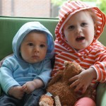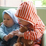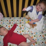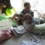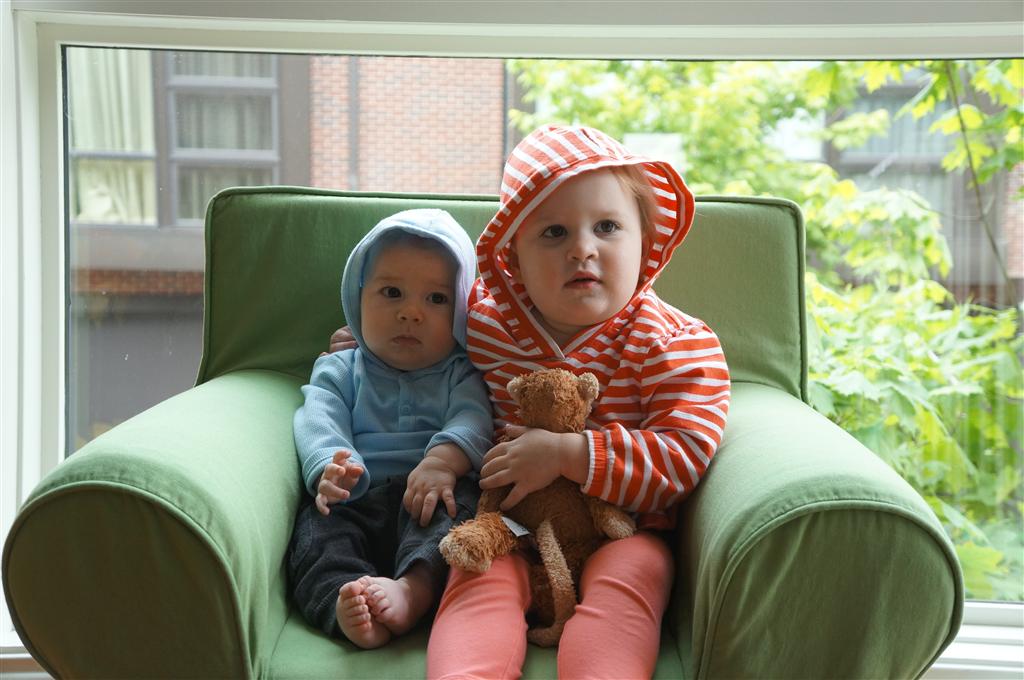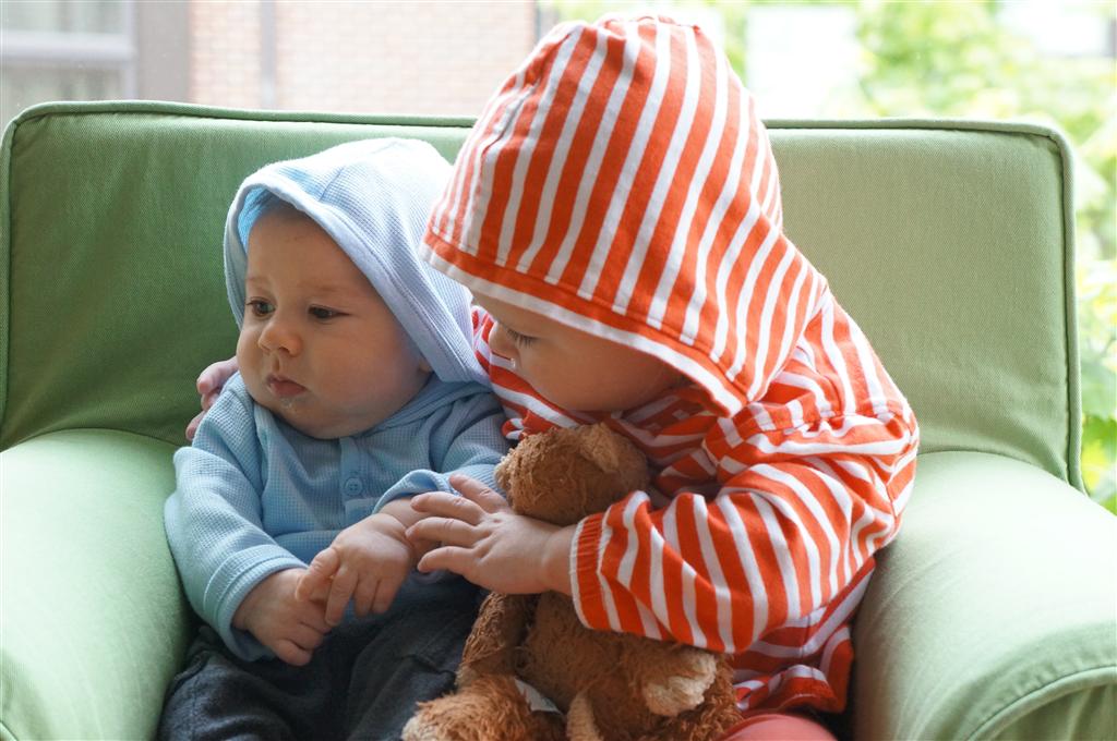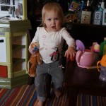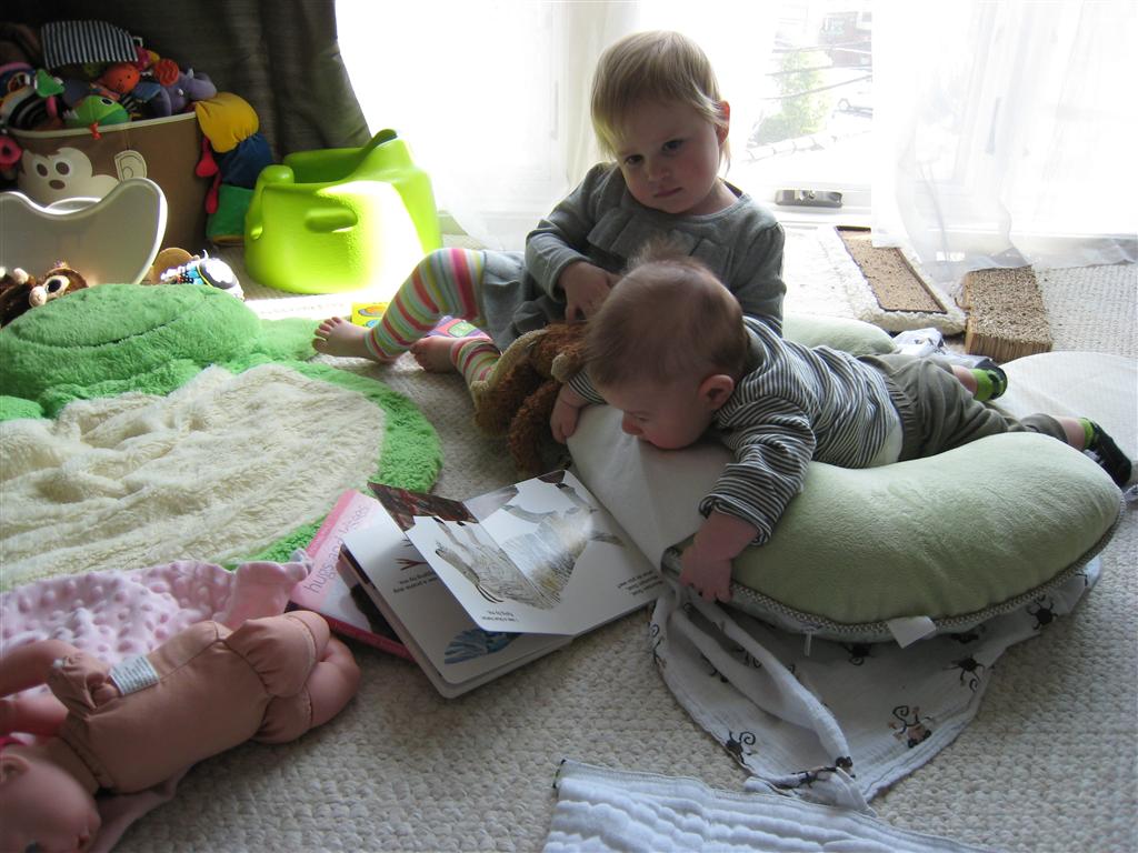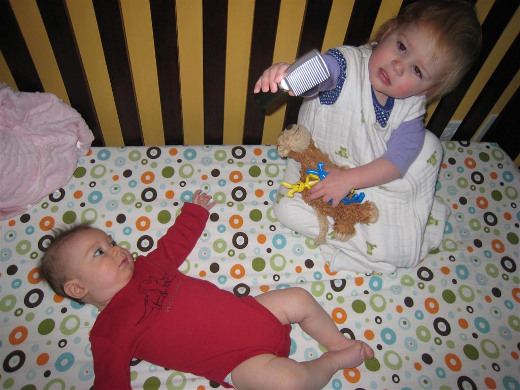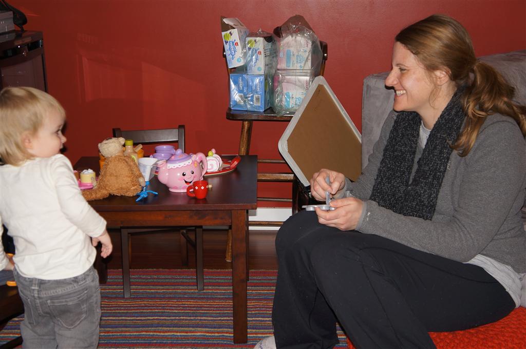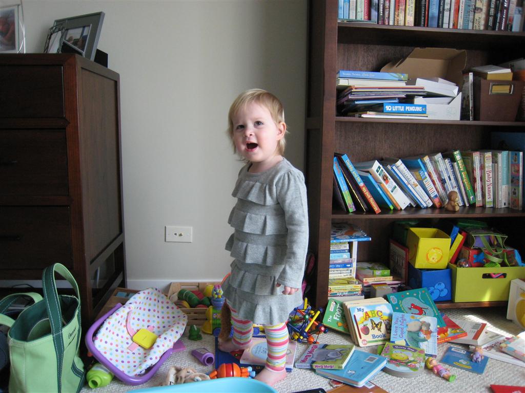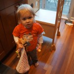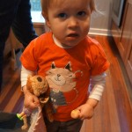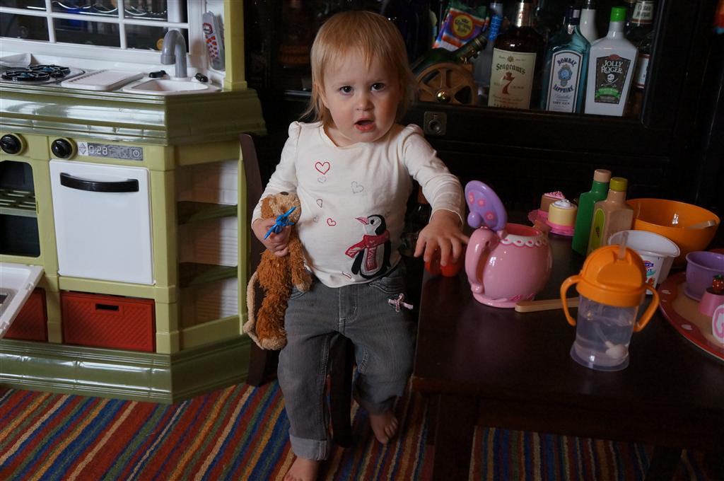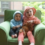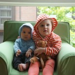 Eleanor has been very excited about wearing barrettes in her hair this week – she usually request a two, one blue and one orange. We actually don’t have an orange one, so we use a gold one and she doesn’t seem to mind. I think colors have a bit of a floating definition for her still. She also had her first pony tail this week! It’s been a long time coming, but her hair is finally long enough for a little tail. On Saturday, both of the kids and Mom happened to be wearing shirts with hoodies on them – so I donned a hoodie of my own and we took a silly little family hoodie picture. Later that day, I caught Eleanor carrying the tripod over to the play rug. She had set Monkey up in the Eleanor chair and was getting ready to take his picture :) She is quite the observer – anything that Mom or Dad do with either her or Henry she ends up recreating with Monkey. She is also a riot to listen to babble – at first it sounds like gibberish, but if you really focus, you realize that she is actually using real words. I’ve caught her singing songs as well as narrating the current situation. She also knows a number of her books – I test her by stopping mid page and more often than not (especially with Cat in the Hat) she fills in the correct word.
