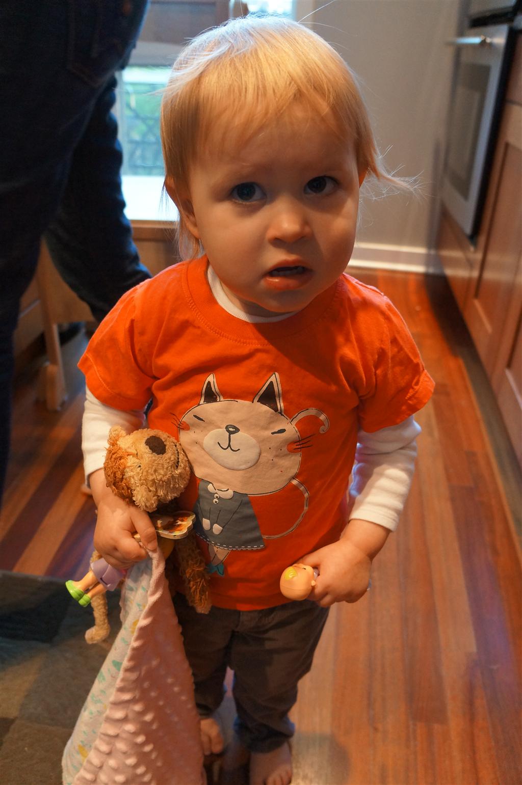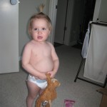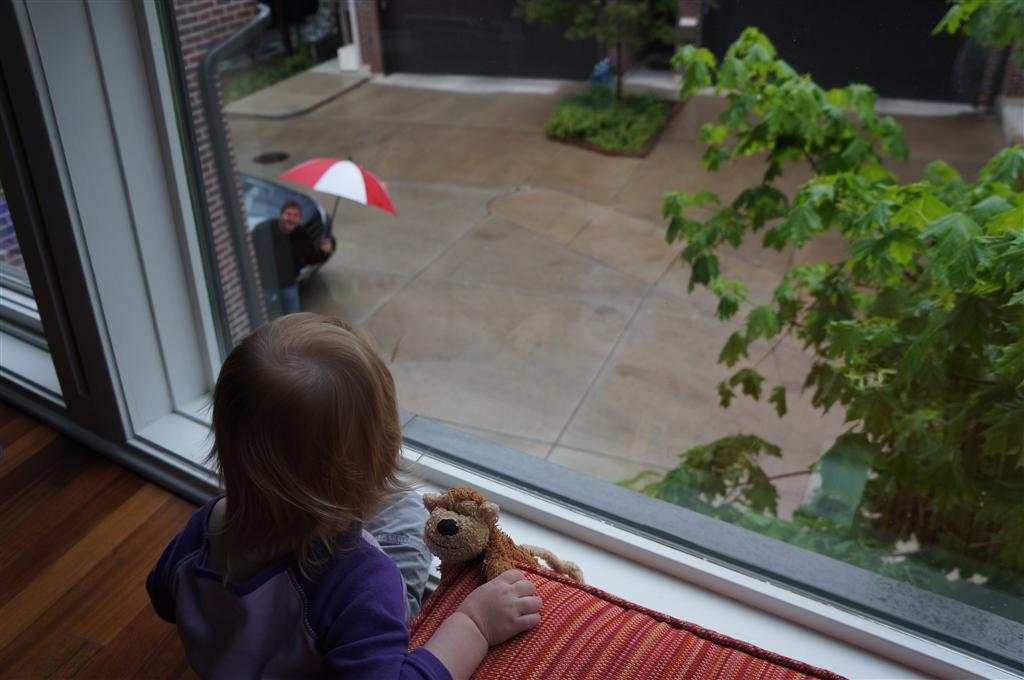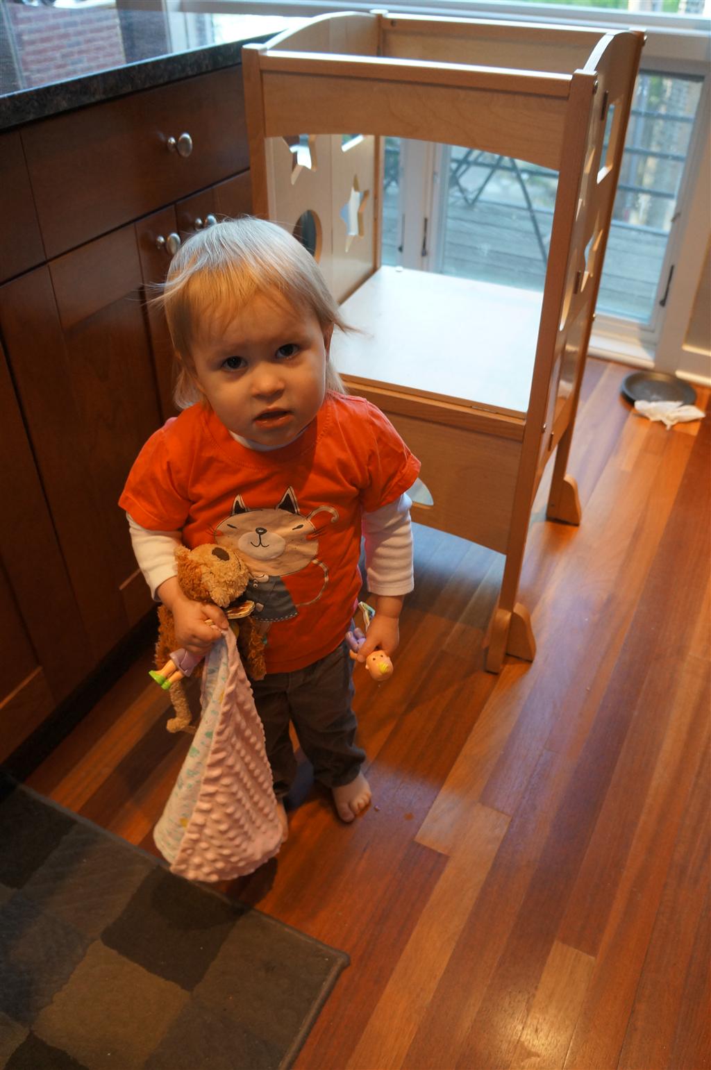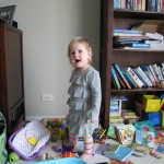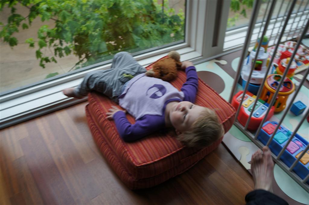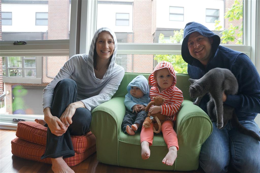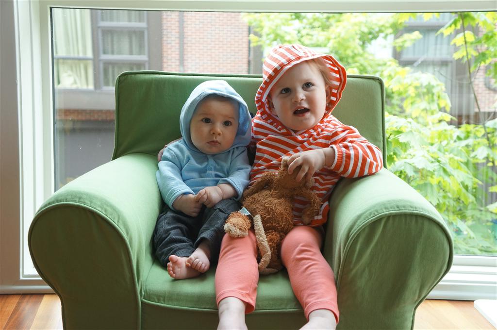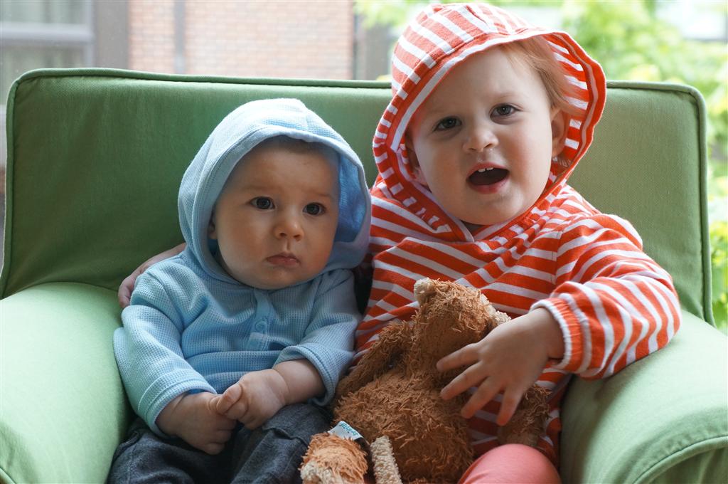 Eleanor has been very excited about wearing barrettes in her hair this week – she usually request a two, one blue and one orange. We actually don’t have an orange one, so we use a gold one and she doesn’t seem to mind. I think colors have a bit of a floating definition for her still. She also had her first pony tail this week! It’s been a long time coming, but her hair is finally long enough for a little tail. On Saturday, both of the kids and Mom happened to be wearing shirts with hoodies on them – so I donned a hoodie of my own and we took a silly little family hoodie picture. Later that day, I caught Eleanor carrying the tripod over to the play rug. She had set Monkey up in the Eleanor chair and was getting ready to take his picture :) She is quite the observer – anything that Mom or Dad do with either her or Henry she ends up recreating with Monkey. She is also a riot to listen to babble – at first it sounds like gibberish, but if you really focus, you realize that she is actually using real words. I’ve caught her singing songs as well as narrating the current situation. She also knows a number of her books – I test her by stopping mid page and more often than not (especially with Cat in the Hat) she fills in the correct word.