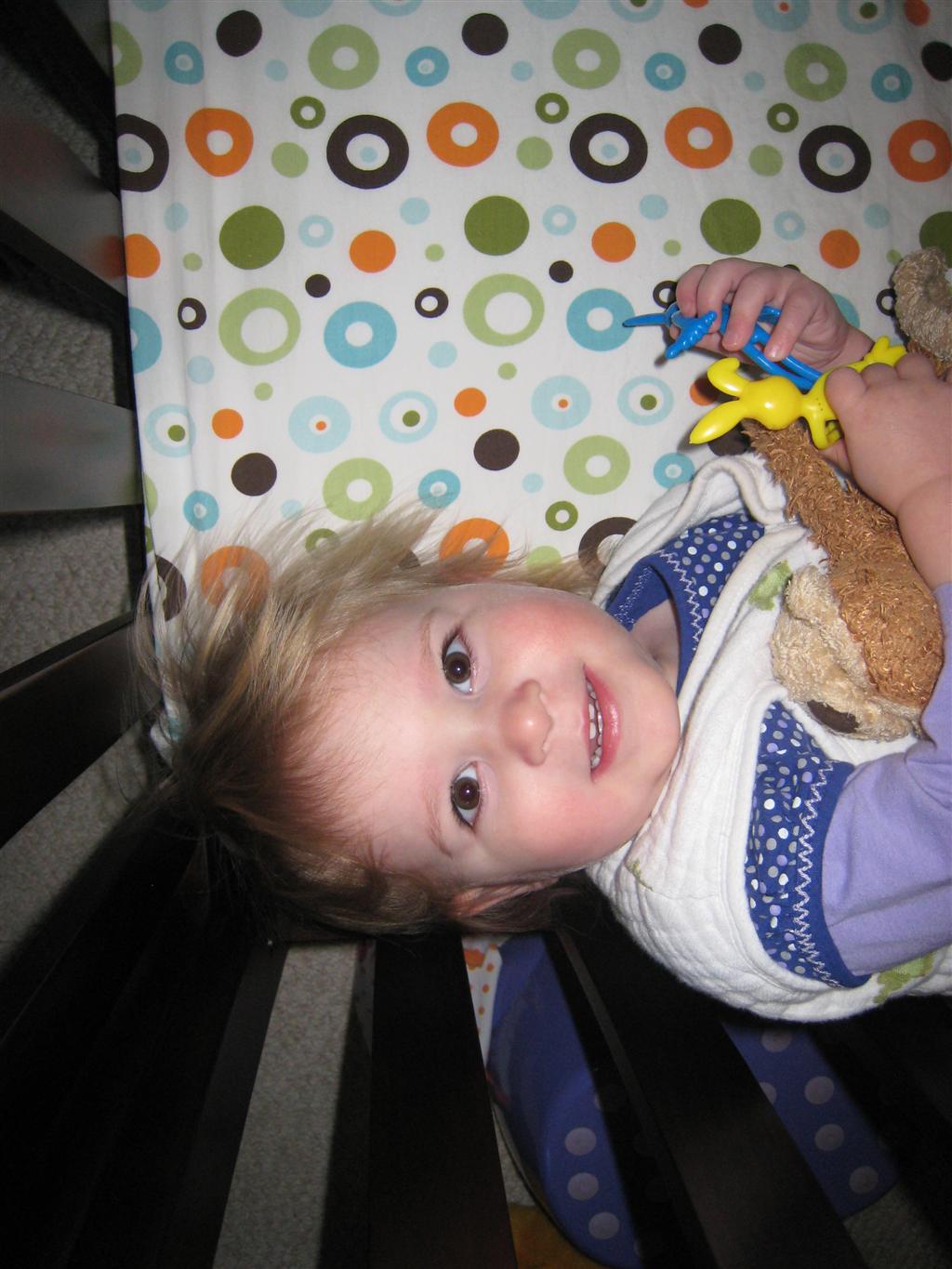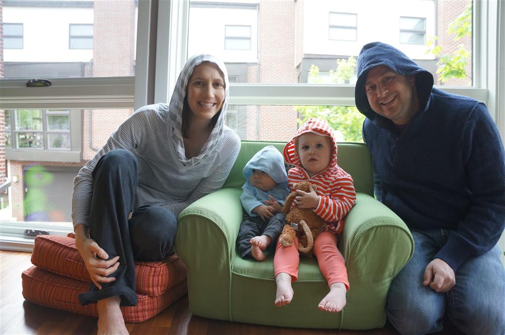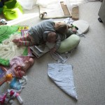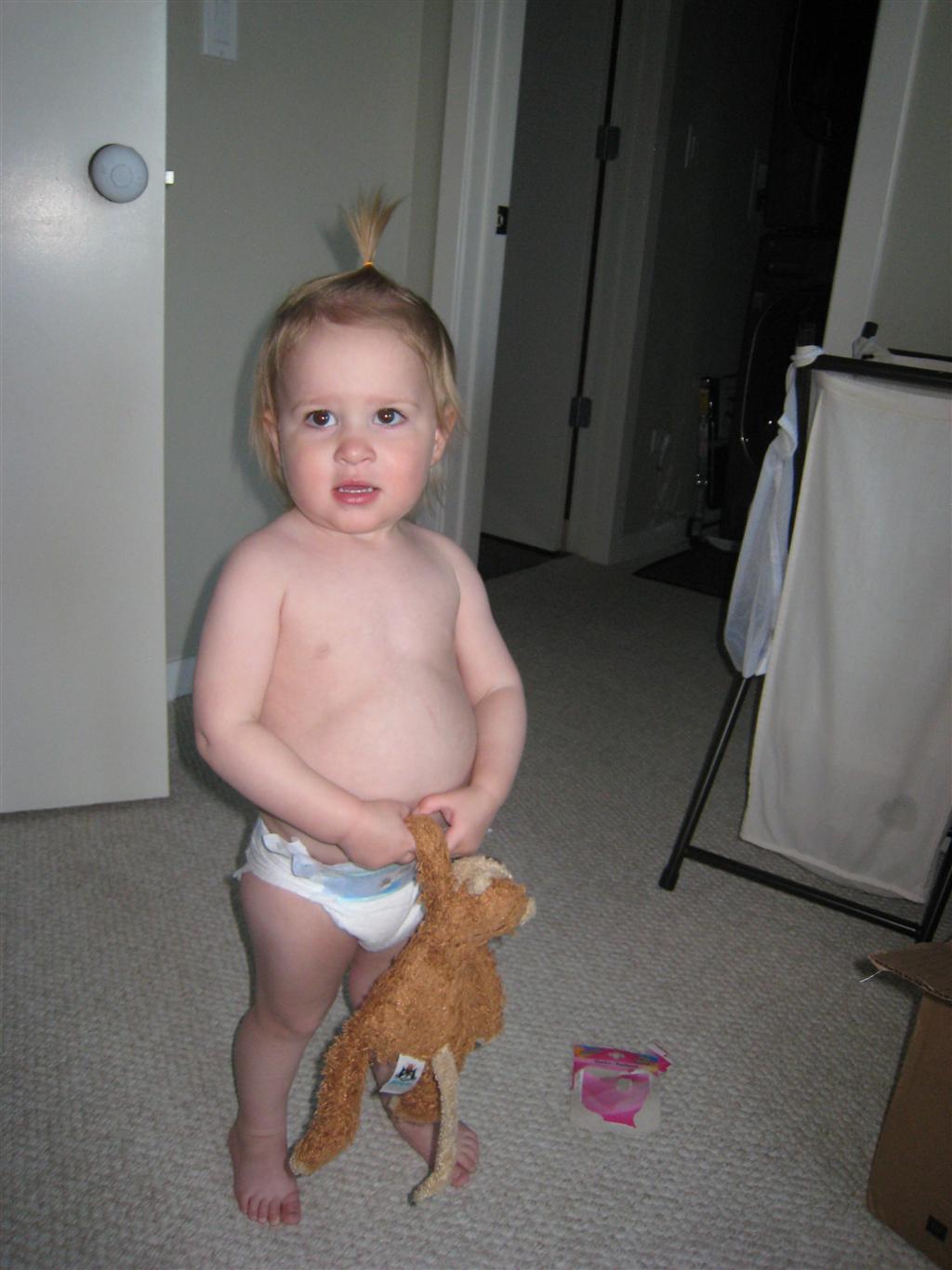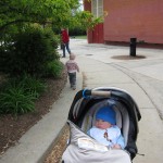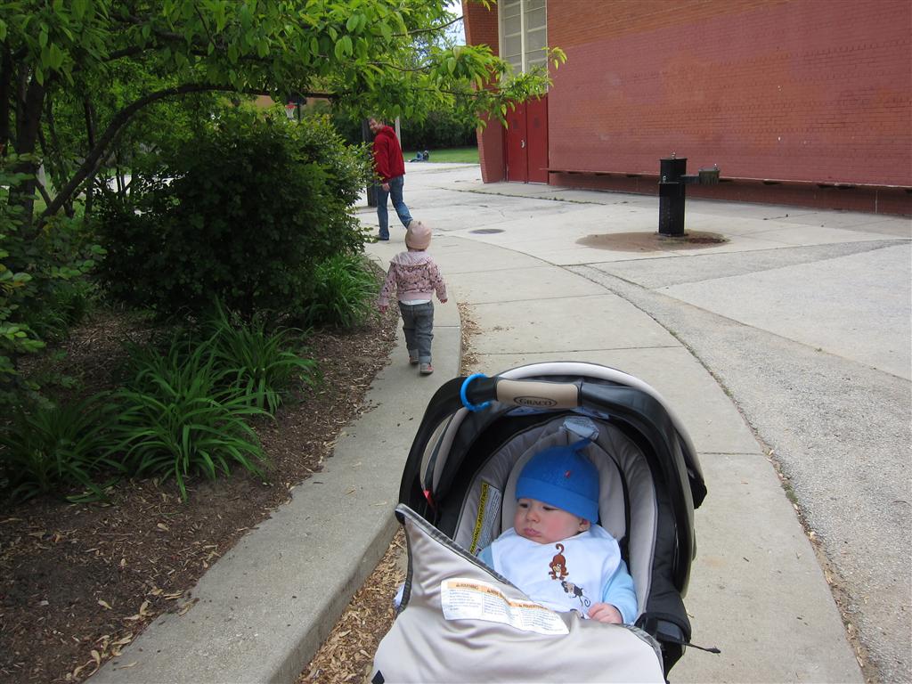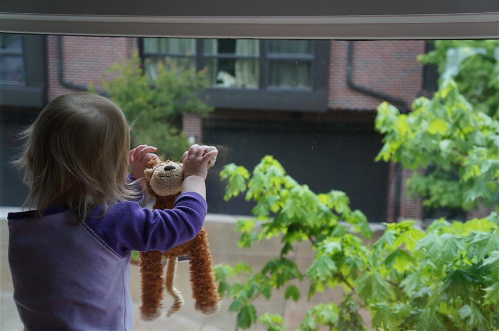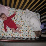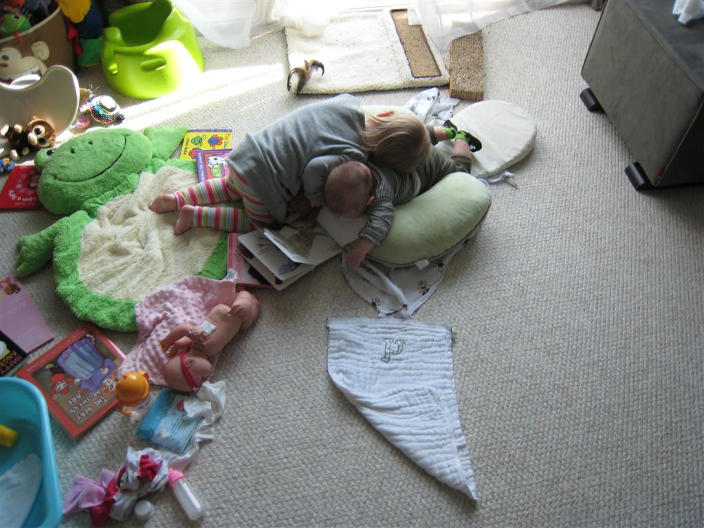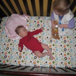 Eleanor has been very excited about wearing barrettes in her hair this week – she usually request a two, one blue and one orange. We actually don’t have an orange one, so we use a gold one and she doesn’t seem to mind. I think colors have a bit of a floating definition for her still. She also had her first pony tail this week! It’s been a long time coming, but her hair is finally long enough for a little tail. On Saturday, both of the kids and Mom happened to be wearing shirts with hoodies on them – so I donned a hoodie of my own and we took a silly little family hoodie picture. Later that day, I caught Eleanor carrying the tripod over to the play rug. She had set Monkey up in the Eleanor chair and was getting ready to take his picture :) She is quite the observer – anything that Mom or Dad do with either her or Henry she ends up recreating with Monkey. She is also a riot to listen to babble – at first it sounds like gibberish, but if you really focus, you realize that she is actually using real words. I’ve caught her singing songs as well as narrating the current situation. She also knows a number of her books – I test her by stopping mid page and more often than not (especially with Cat in the Hat) she fills in the correct word.