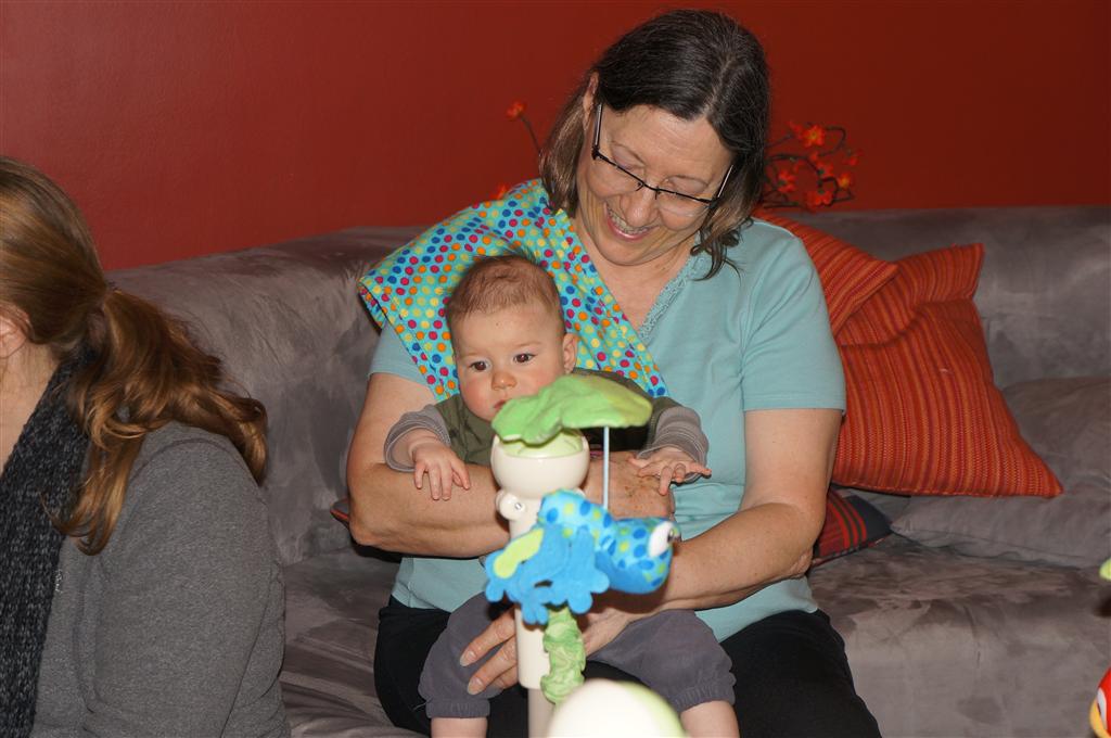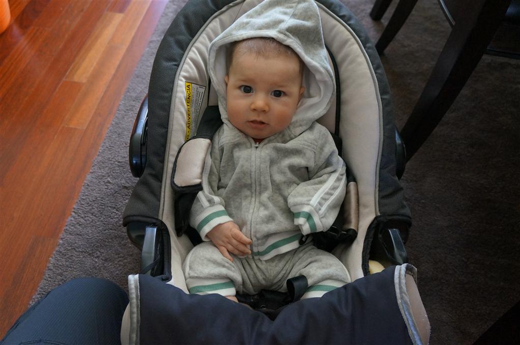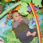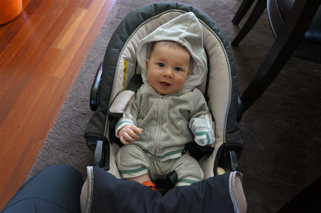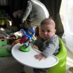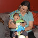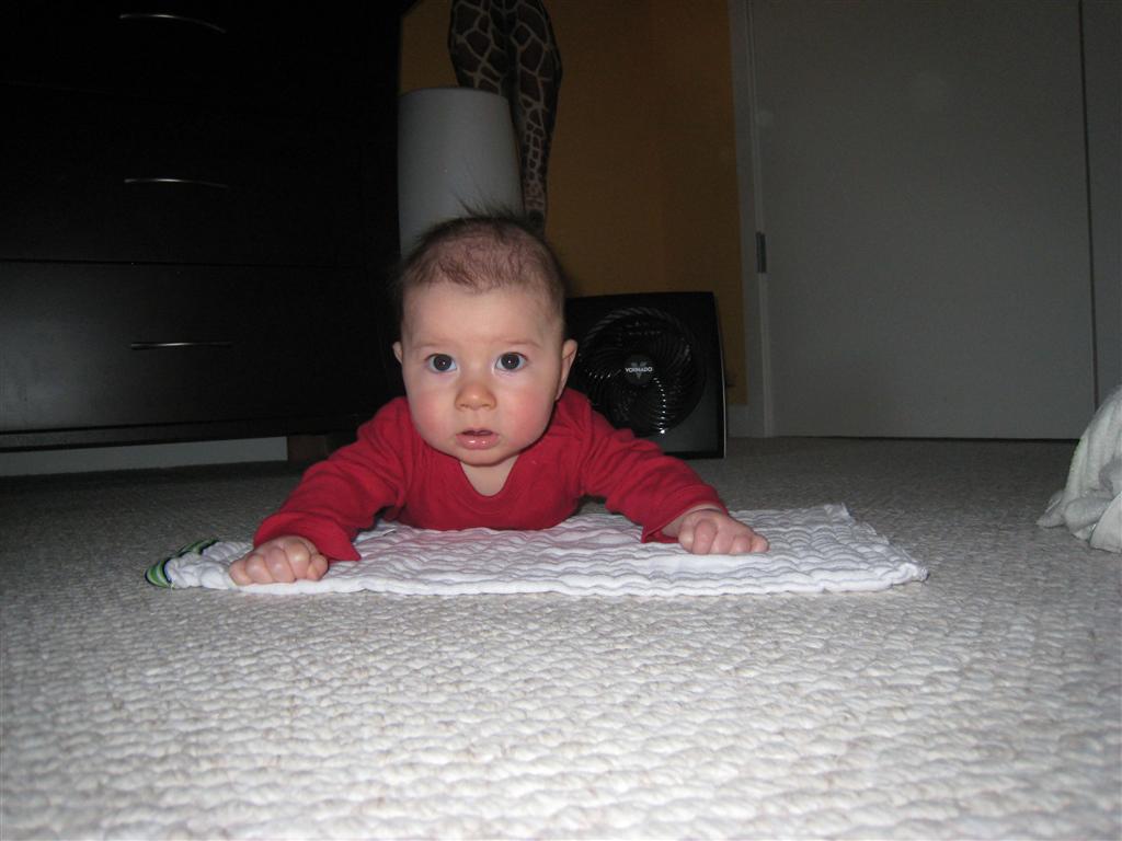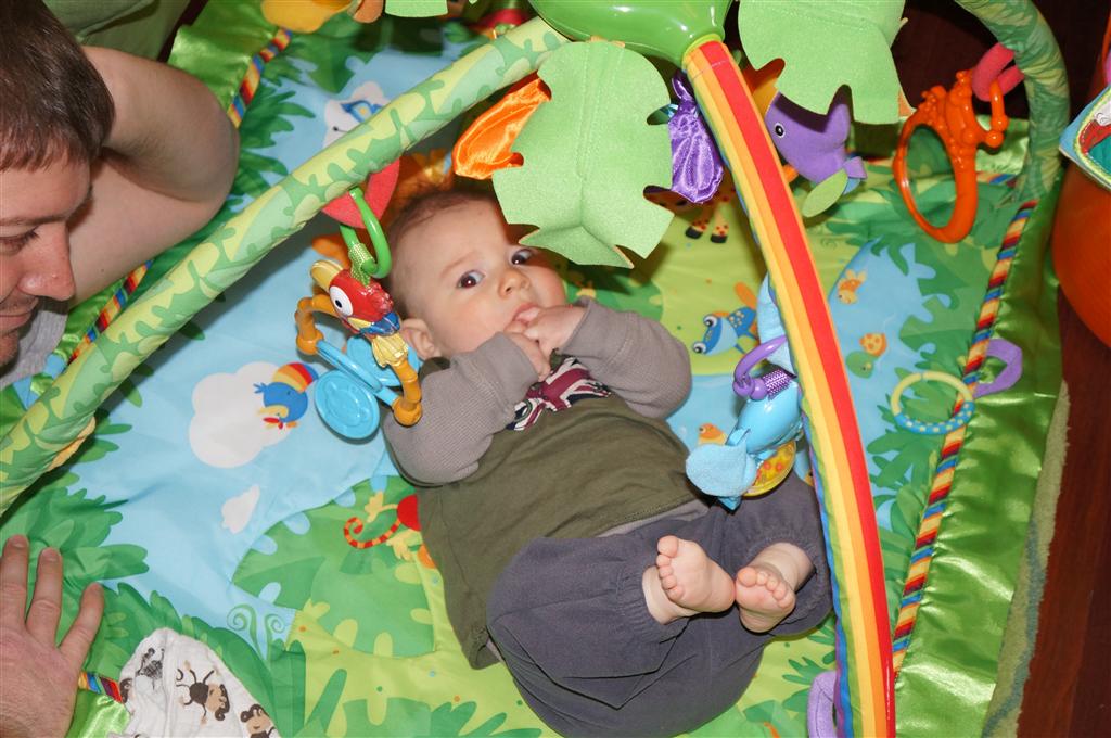 This week Henry gained his first tooth! It is just barely popping through on the backside of his gums, so we don’t have a photo yet, but hopefully next week! Unfortunately, I think the tooth has put him in a bad mood – he was a bit fussy all week. He has also been working on his rolling over – he still can’t quite do it without being propped up, but he is getting closer.