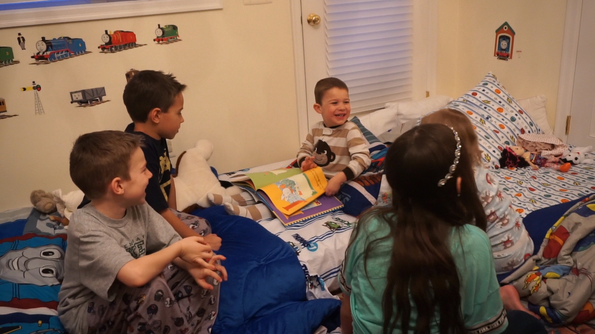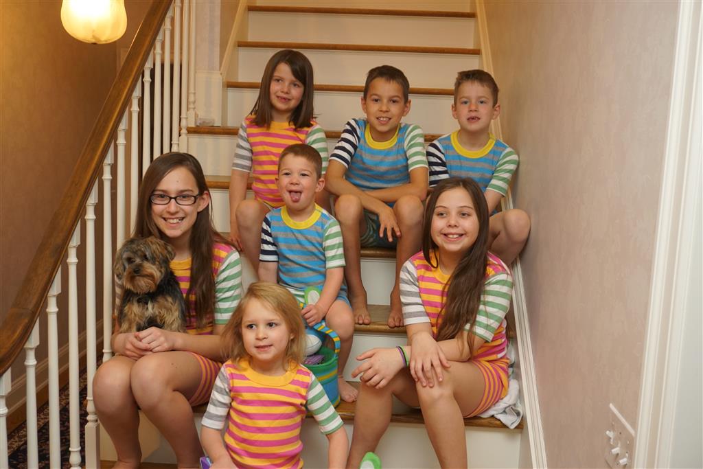 Henry and Eleanor celebrated Easter this week with lots of fun at Grandma and Grandpa’s house. Mackenzie, Jack, Ben, Mahlia, Brooke and Buddy all joined in on the fun. There were new sleeping arrangements, and both Henry and Eleanor were thrilled with their new sheets. I asked Eleanor, “How is your rocket ship bed, is…