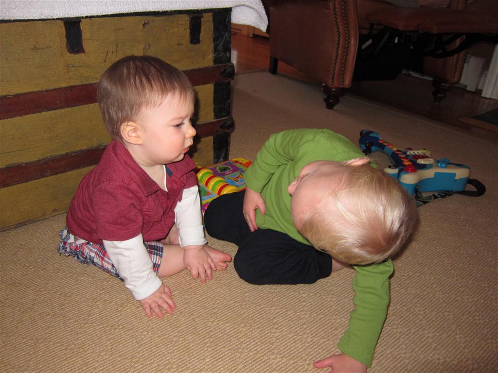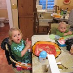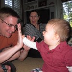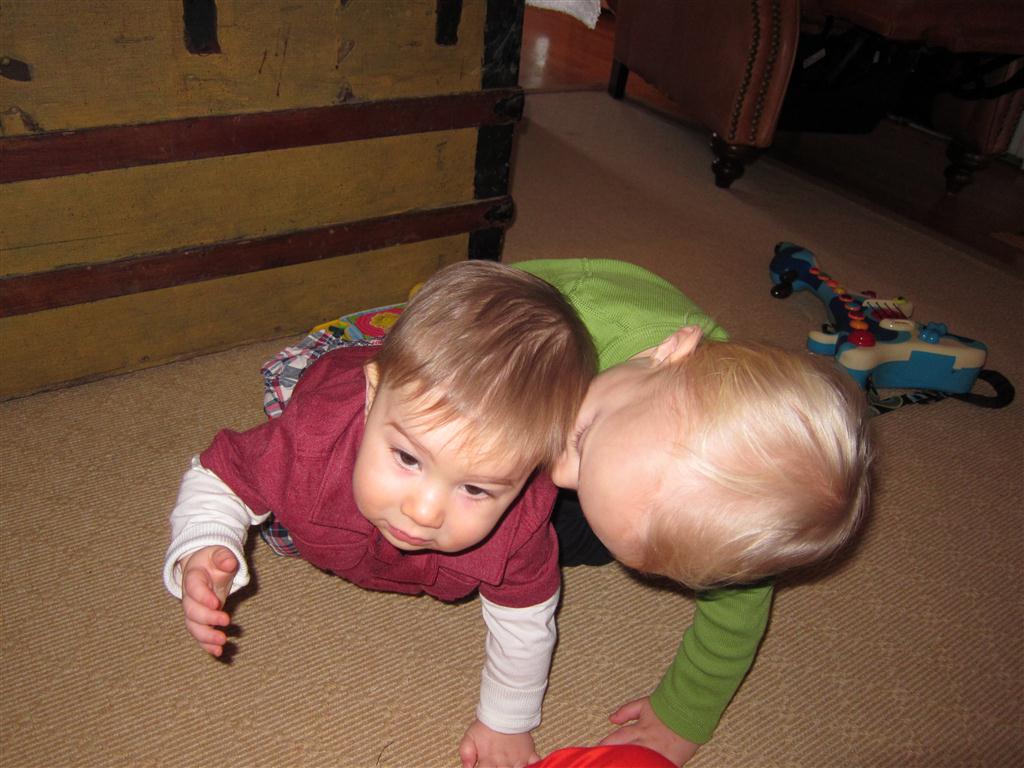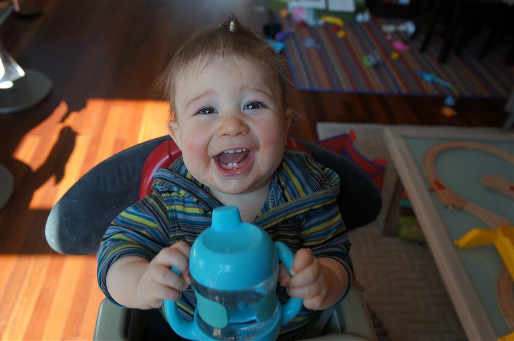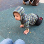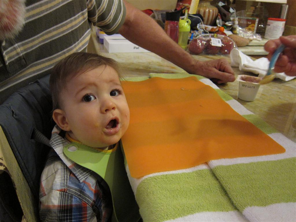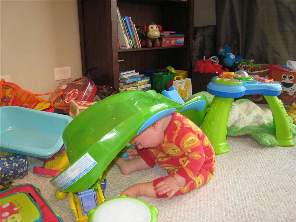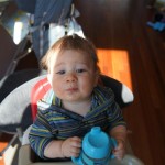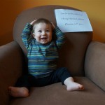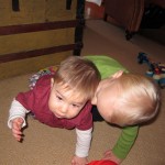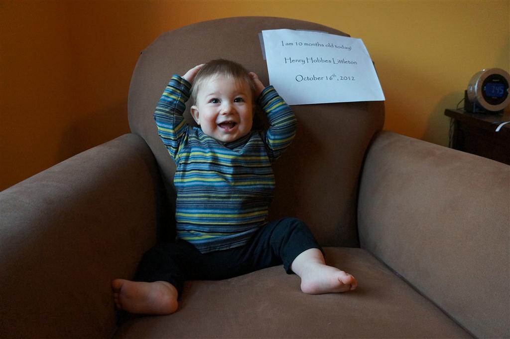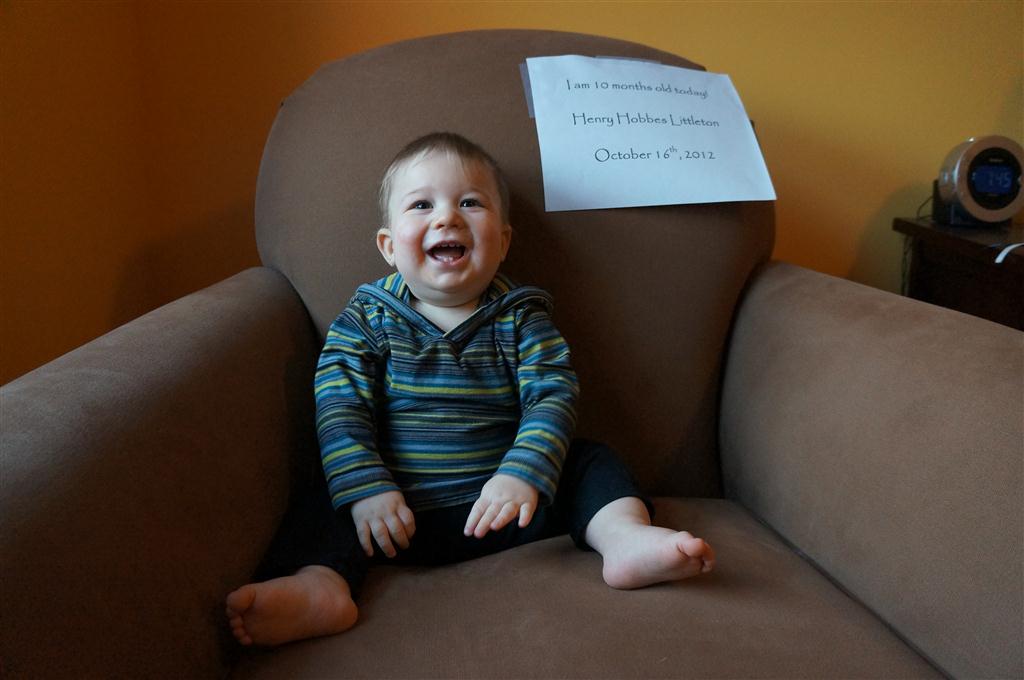 This week, Henry decided it was time to get up and go. On Monday he was scooting just a little bit, and experimenting with the idea, and by Tuesday he was up to full speed. Mom and Dad were thrilled with his new trick – although we did find it a bit ironic that he started moving along just days before we head out for a vacation in a non baby-proofed house. It also perfectly coincided with his 10 month birthday. He has also been working on eating table foods, and is making lots of progress. He now eats waffles, strawberries and oatmeal with Eleanor at breakfast, and mac and cheese with her at lunch.