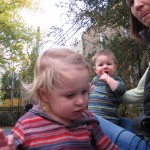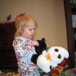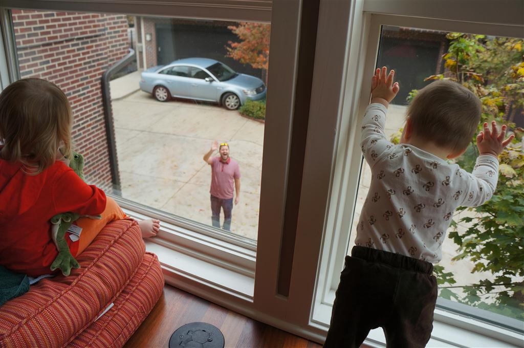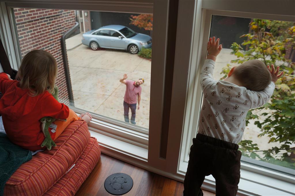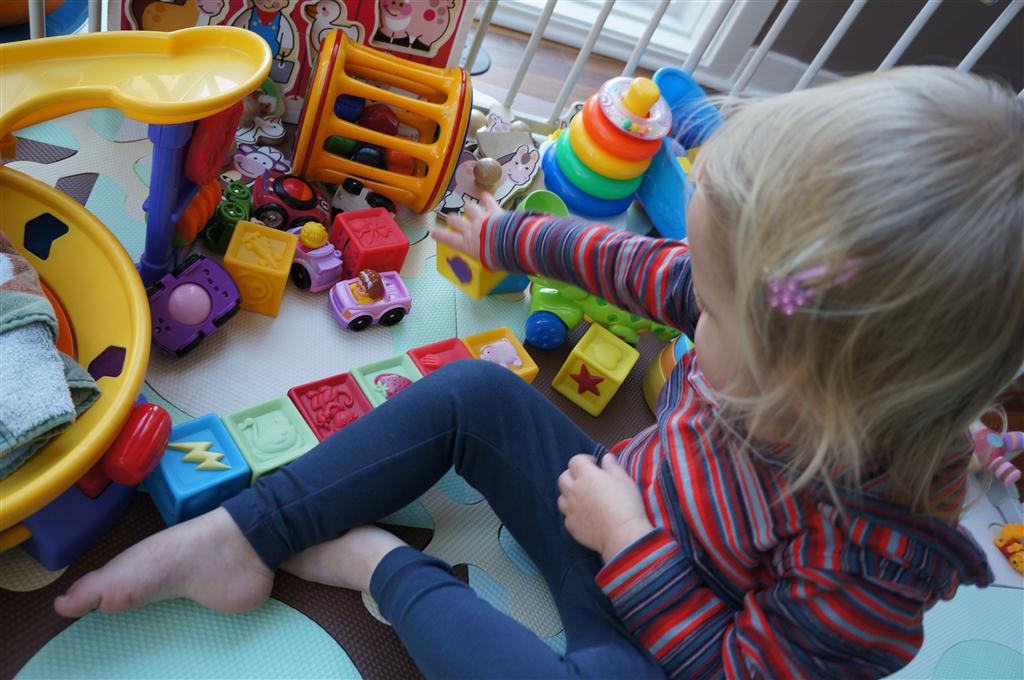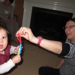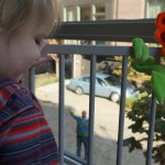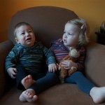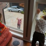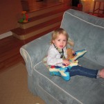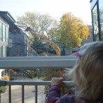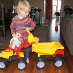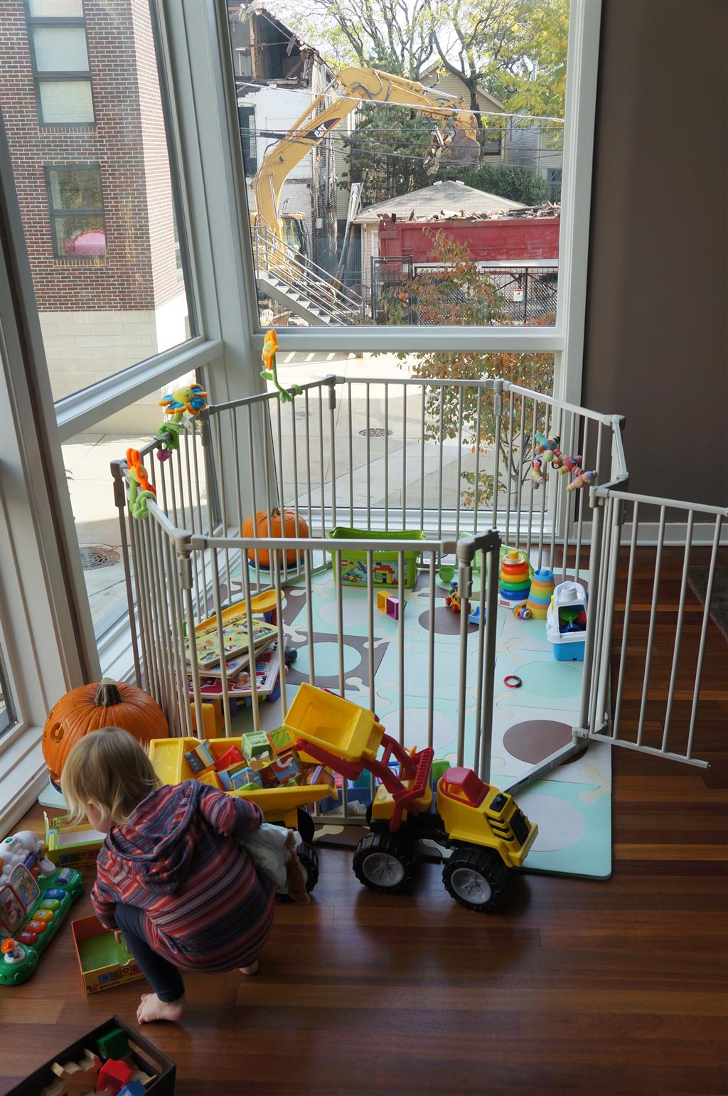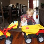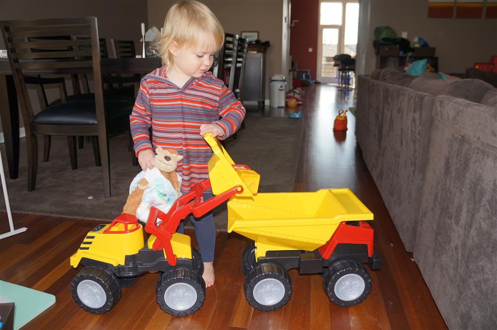 Eleanor had fun this week watching them demolish a house across the alley. They took down the carriage house using a front loader and dump truck which she could see from our front window, and inspired her to get out her front loader and dump truck and do some coordinated play. Mom snapped some great photos that are just screaming for the Eleanor inspired caption “Match”.