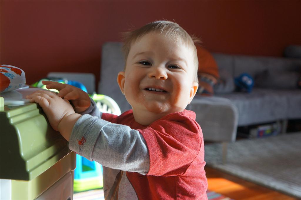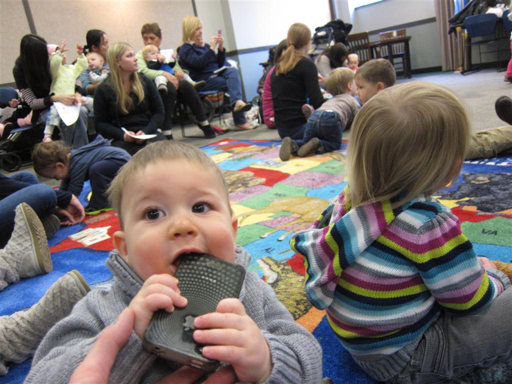 Henry turned 11 months old this week! He has really been enjoying his mobility, and Eleanor continues to be surprised that suddenly things are no longer out of his reach. These days Henry seems to be most interested in whatever Eleanor is doing. He took his first trip to the library this week for story time – The Hungry Caterpillar. After the story, Eleanor, Henry and Mom went across the street for lunch at Starbucks. He has also been working on doing the slide – he went down a couple times all by himself at the park – and was very impressed with himself afterwards. We finished up the week with breakfast at Whole Foods on Sunday, and Henry joined in on the food for the first time, enjoying pancakes, strawberries and oatmeal.