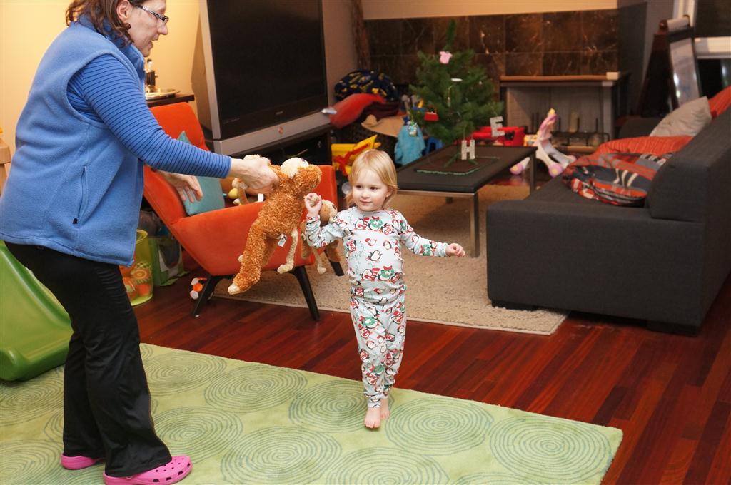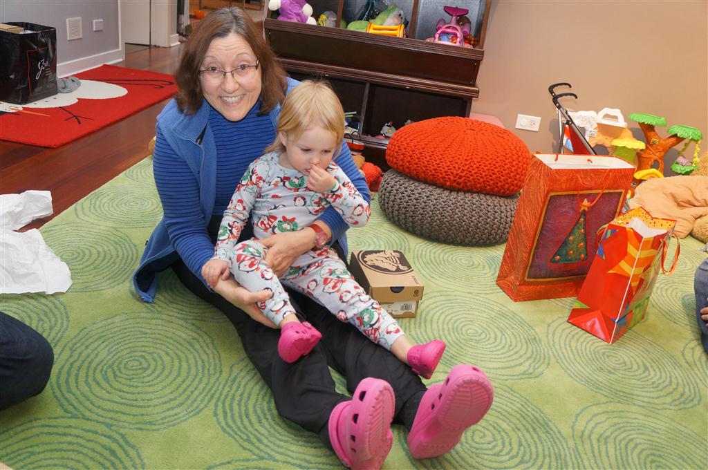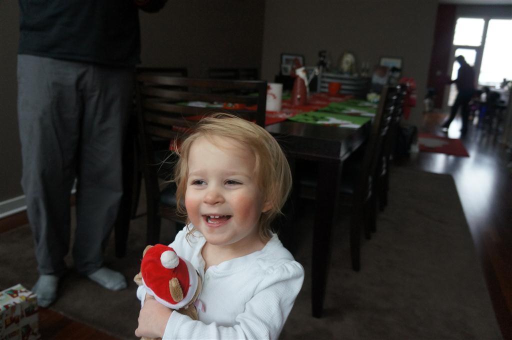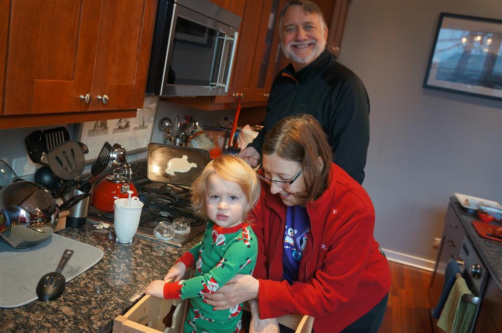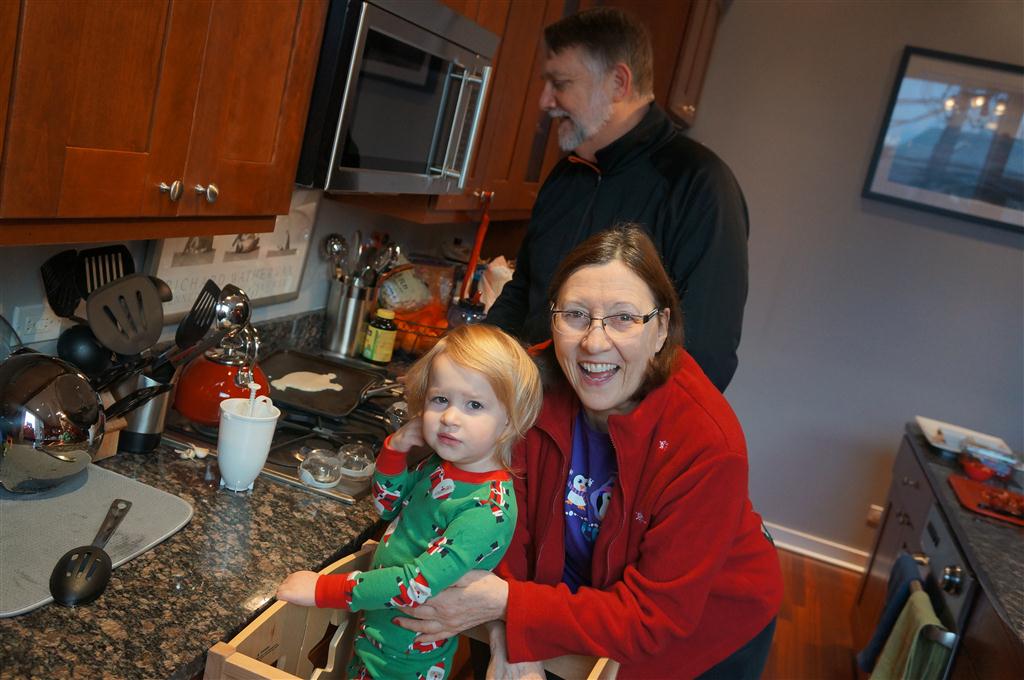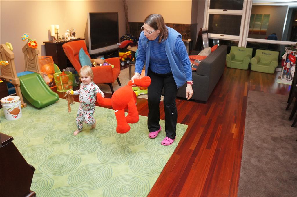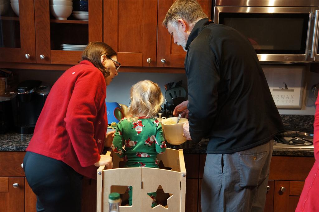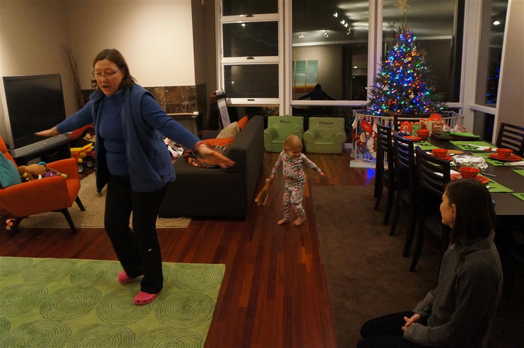 Eleanor did a lot of cooking this week, helping Mom to make a crockpot lasagna and Mimi and Papa to make pancakes for Christmas breakfast. We also got a bit of snow on Christmas morning, and Eleanor loved going outside and playing in it. She loved watching snowballs hit the ground, and also shoveling snow into the storm drains. We got her set up with a hockey stick and she was off doing her own shoveling. Poor Henry was napping at the time so he missed the snow fun.