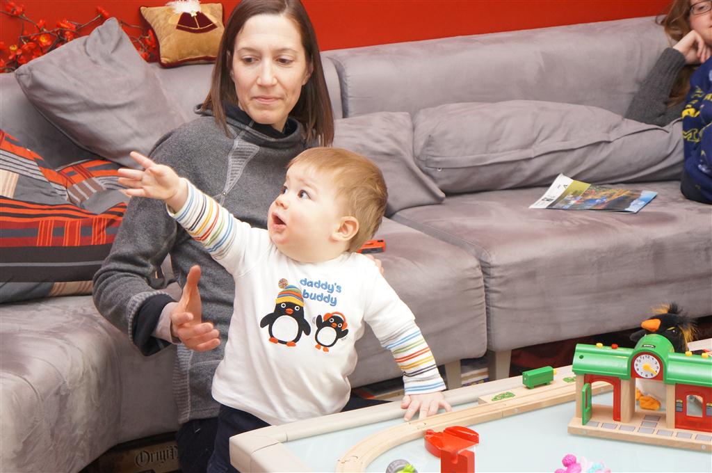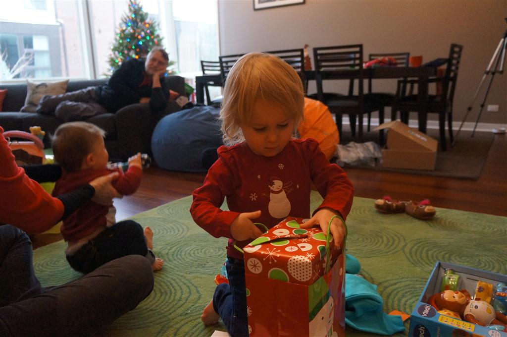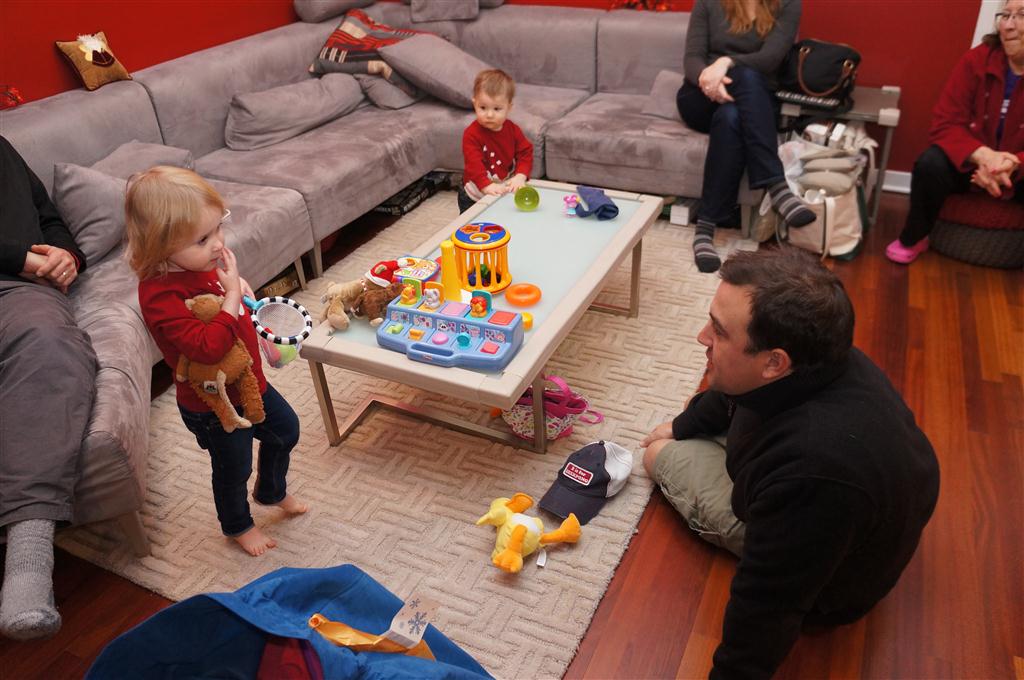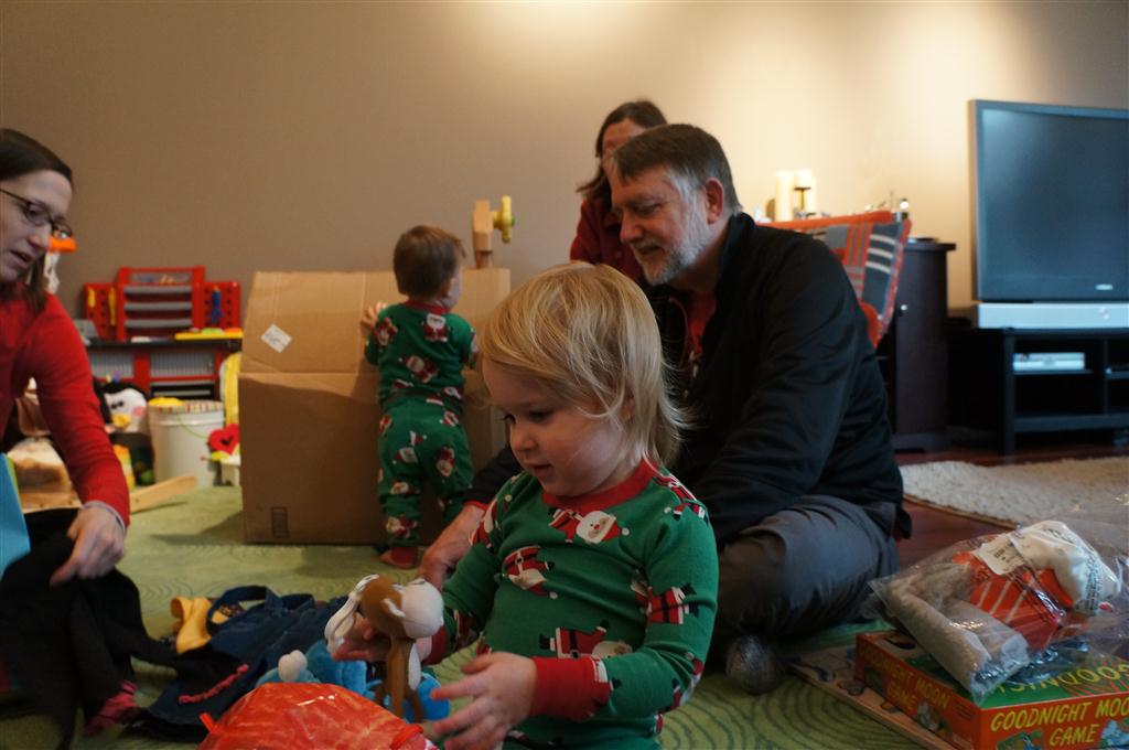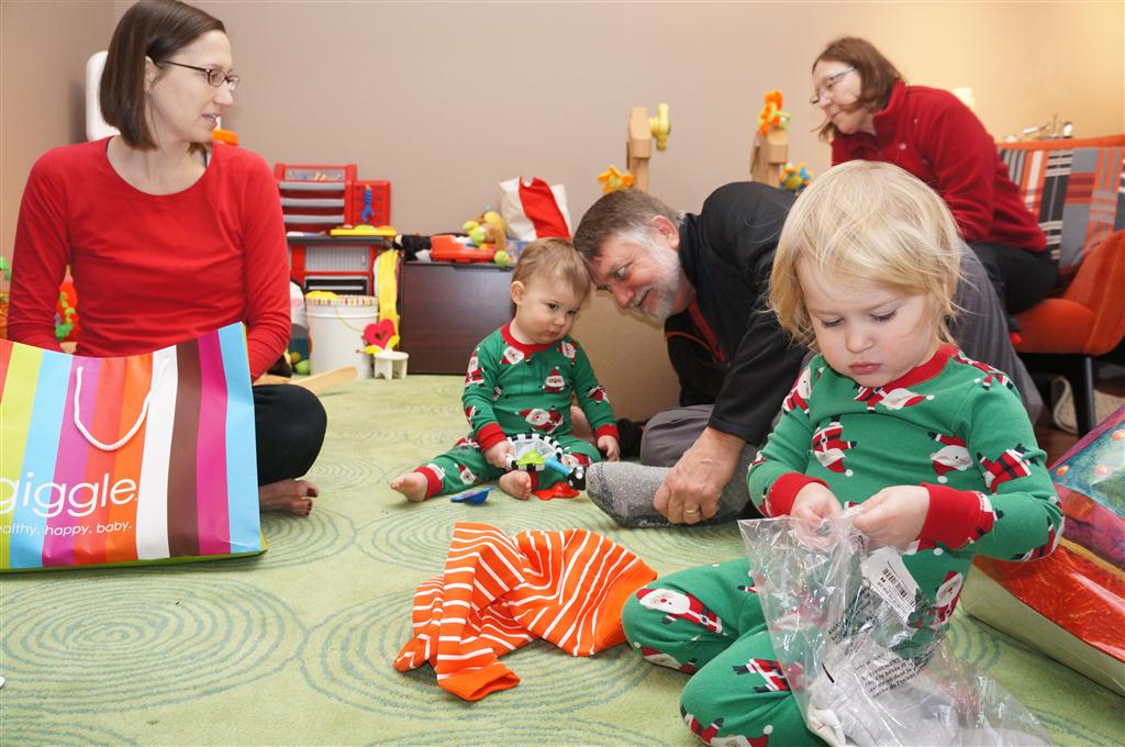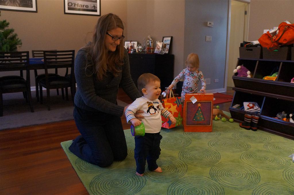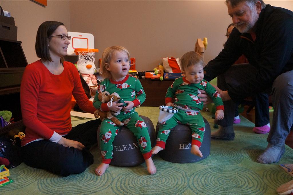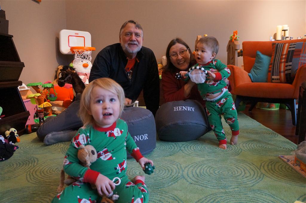 Henry and Eleanor had a blast celebrating Christmas with Mimi, Papa, Lala, Uncle B and Breanne. We started off the week with a trip to the train exhibit at the botanical gardens, and a trip to the doctor for Henry’s one year checkup (all is well :) ). Then Mimi and Papa arrived for lots of days of play. We also had a fun visit from our friends Anna and Jackie – who both really liked the caterpillar tunnel.