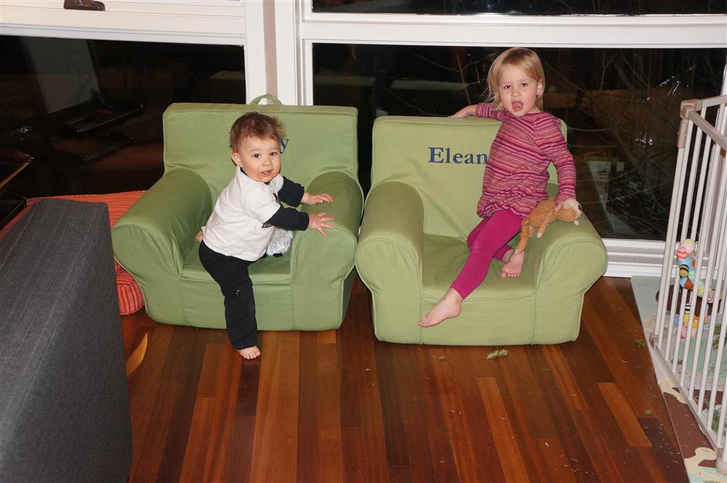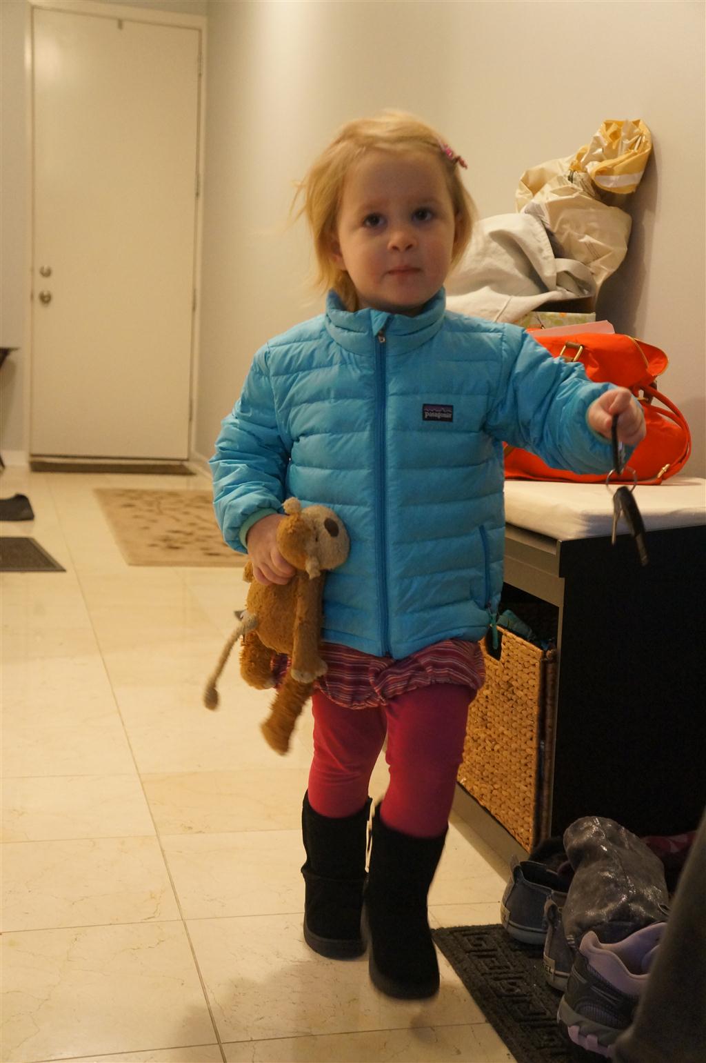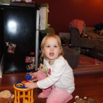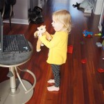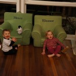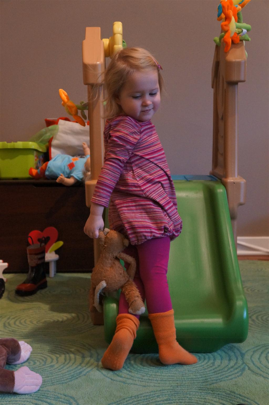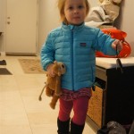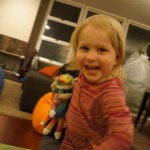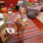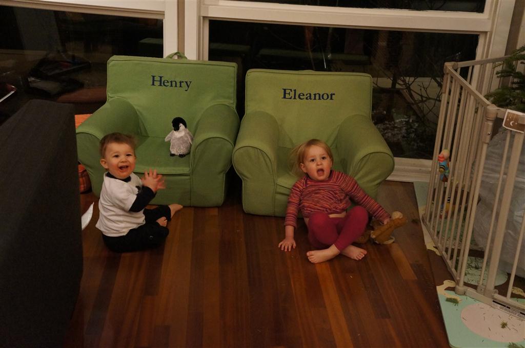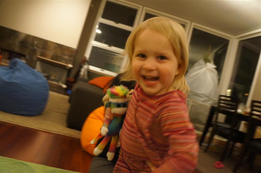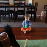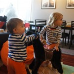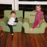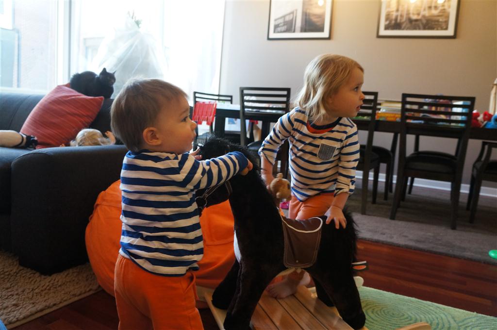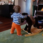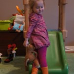 Eleanor picked out both her outfit and Henry’s outfit on Friday, bright orange pants and blue and white striped shirts. They looked like a pair of jailbirds, especially when they were riding the rocking horse. On Thursday, Eleanor went for a trial run at preschool. She only stayed for an hour or so, and Mom was there the whole time. Next week she will go for a half day all by herself! Oh yeah – Monkey got a “bath” this week two, all new and fluffy. For those of you counting at home, this marks the third incarnation of Monkey.