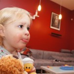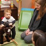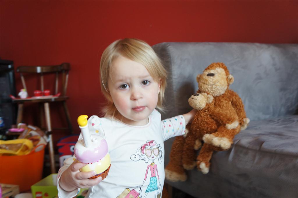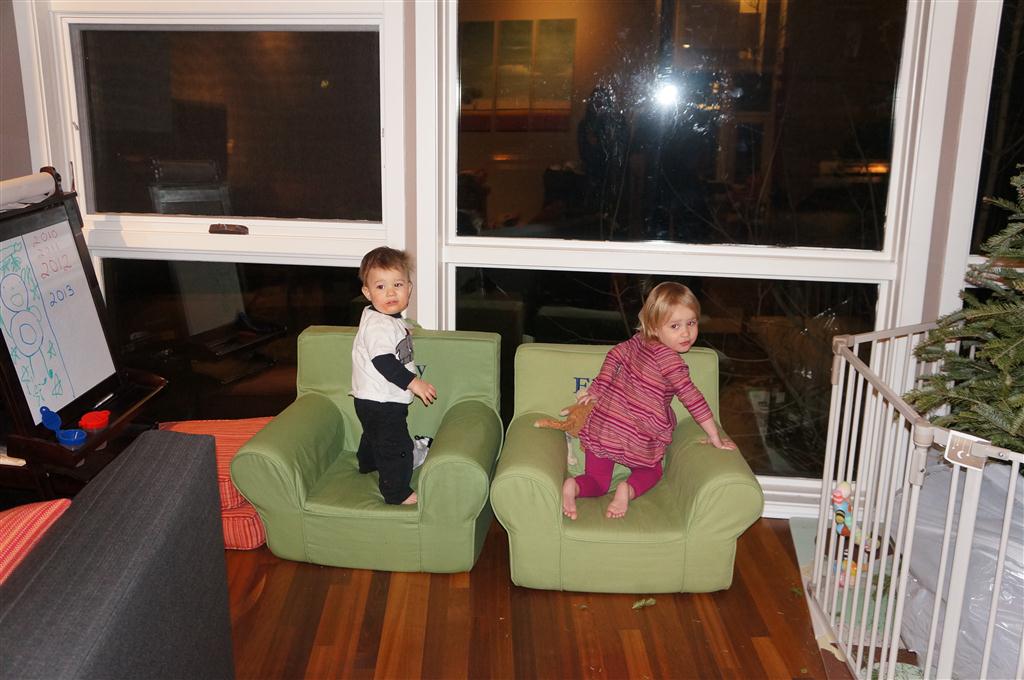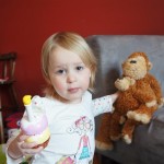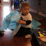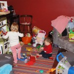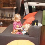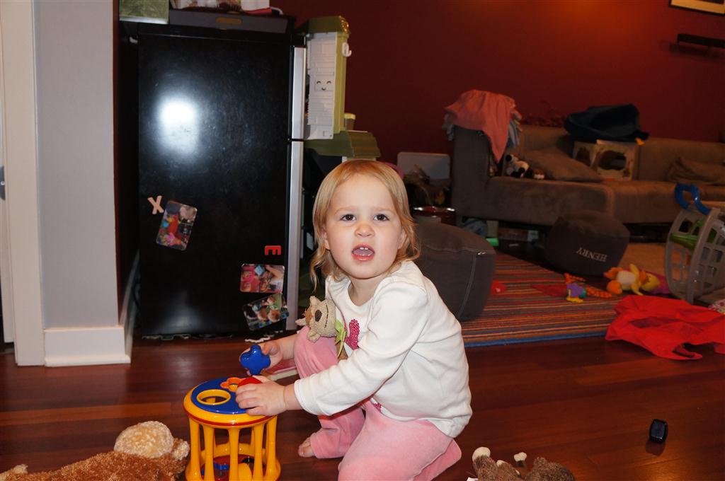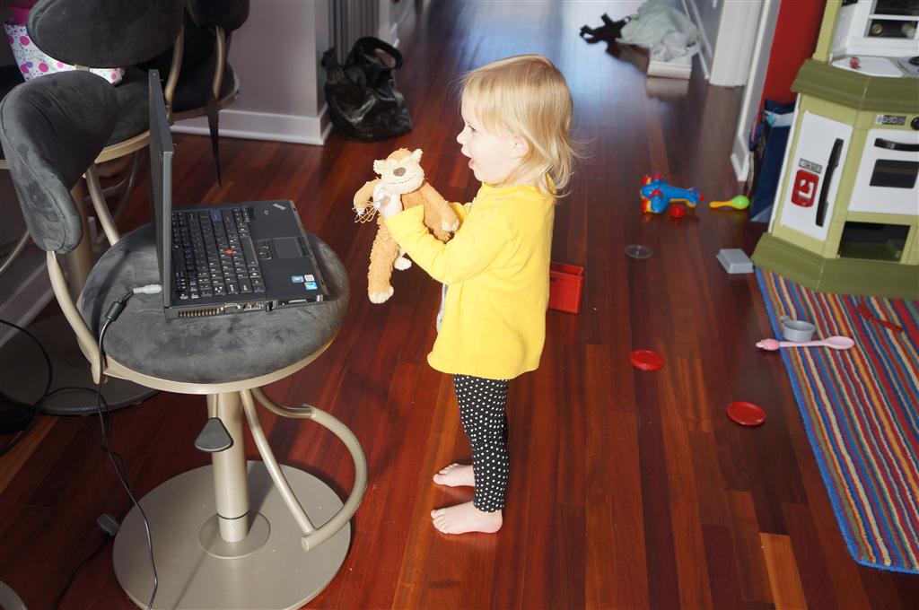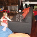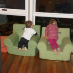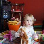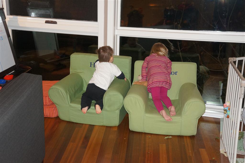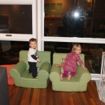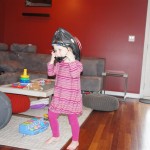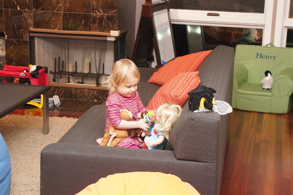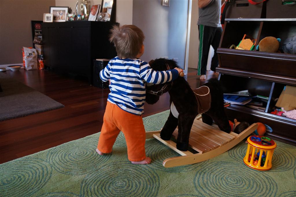 Eleanor picked out both her outfit and Henry’s outfit on Friday, bright orange pants and blue and white striped shirts. They looked like a pair of jailbirds, especially when they were riding the rocking horse. On Thursday, Eleanor went for a trial run at preschool. She only stayed for an hour or so, and Mom was there the whole time. Next week she will go for a half day all by herself! Oh yeah – Monkey got a “bath” this week two, all new and fluffy. For those of you counting at home, this marks the third incarnation of Monkey.