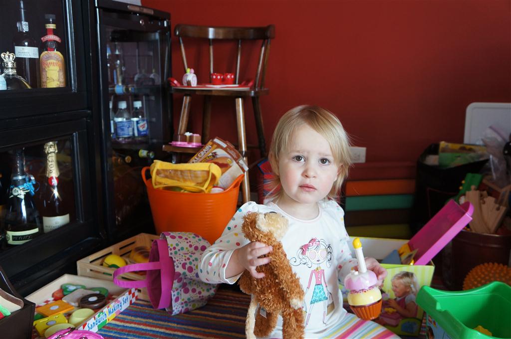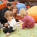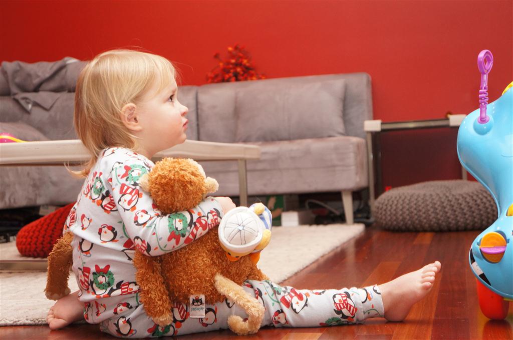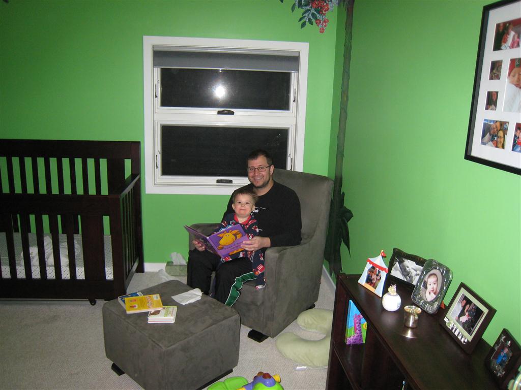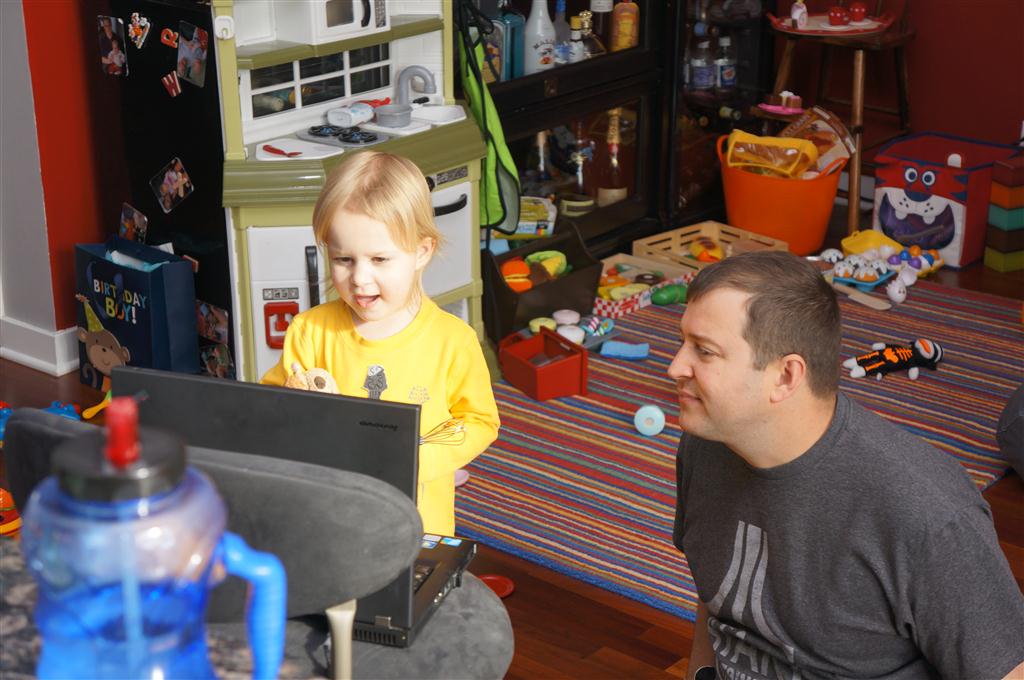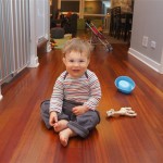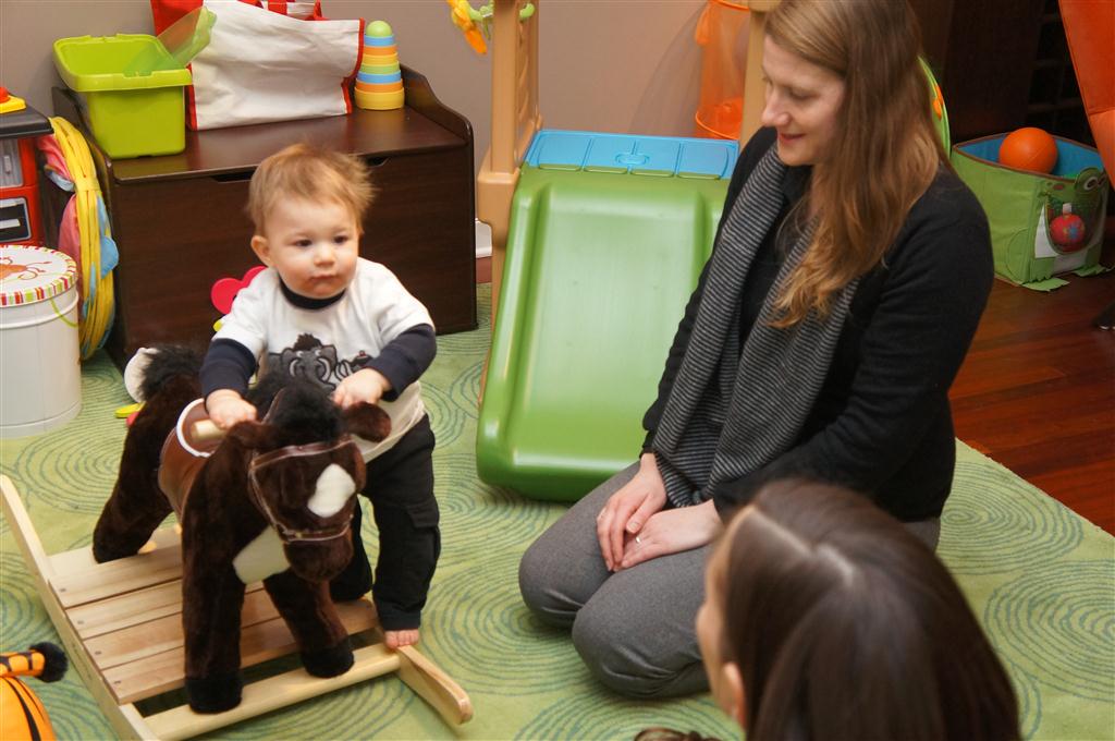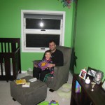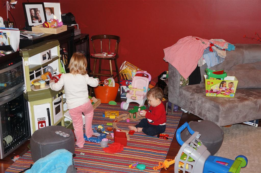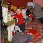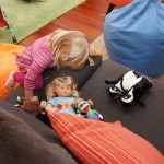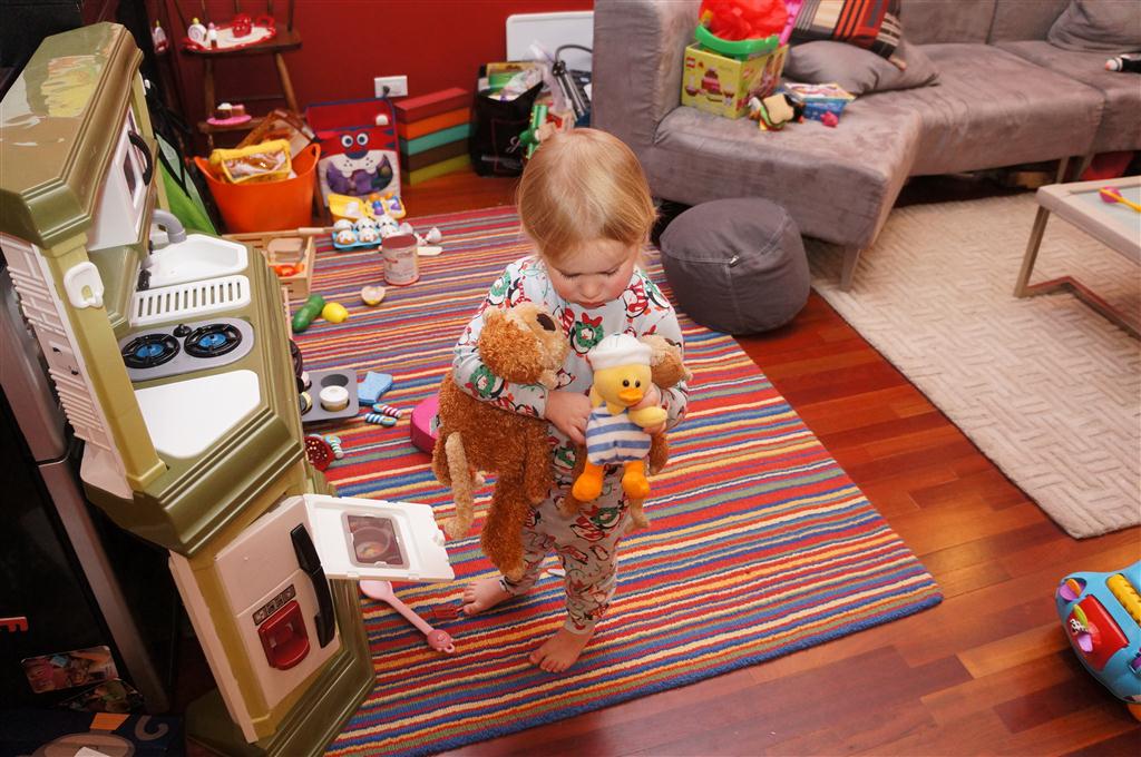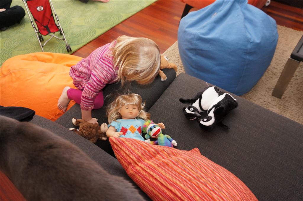 Eleanor picked out both her outfit and Henry’s outfit on Friday, bright orange pants and blue and white striped shirts. They looked like a pair of jailbirds, especially when they were riding the rocking horse. On Thursday, Eleanor went for a trial run at preschool. She only stayed for an hour or so, and Mom was there the whole time. Next week she will go for a half day all by herself! Oh yeah – Monkey got a “bath” this week two, all new and fluffy. For those of you counting at home, this marks the third incarnation of Monkey.