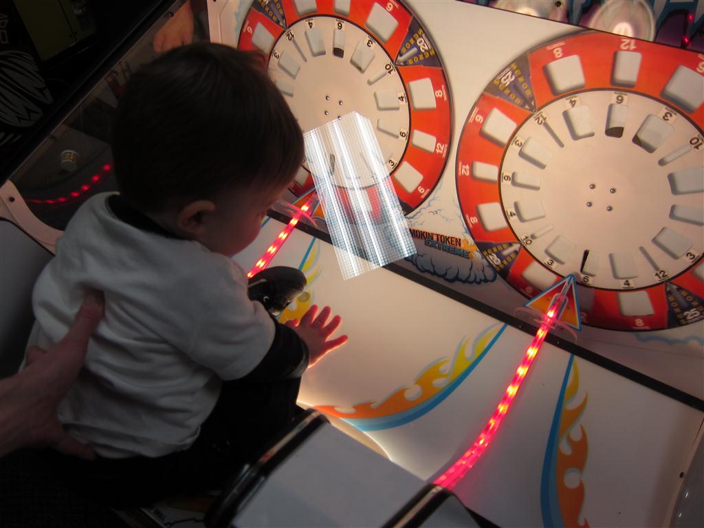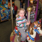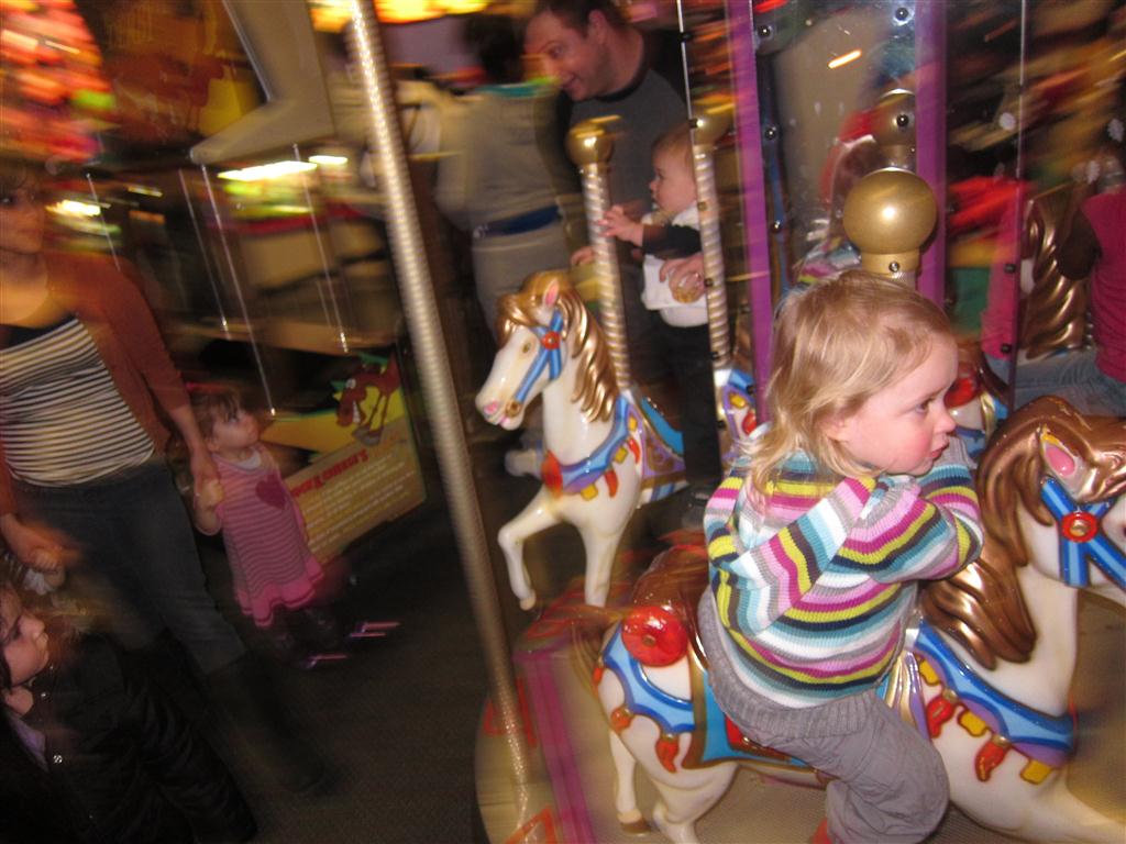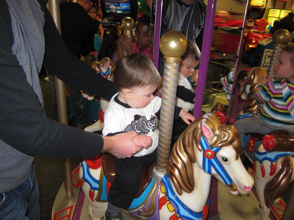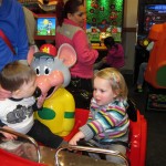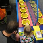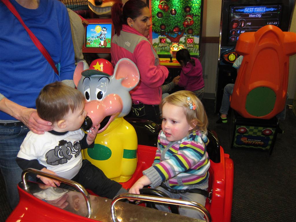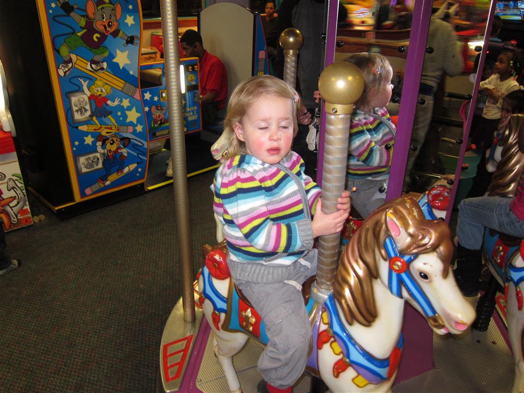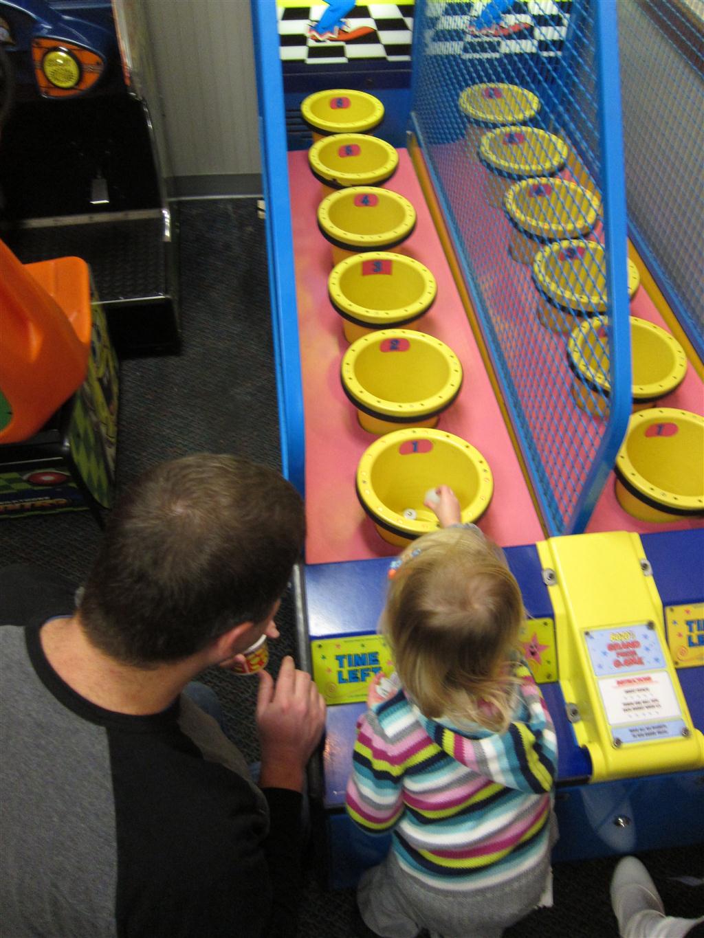 Eleanor had fun this week going to her first birthday party at “Chuck E. Cheese”! She was a bit in awe of all the craziness at first, but she quickly got into the games, and loved putting the coins into the machines and then getting her winning tickets out. Her favorite game was a bucket toss where you got 6 ping pong balls and then got points by throwing them into a bucket. She went for the 1 point bucket each time, which was close enough that she could just lean over and drop the balls in :) . At the end, we counted up our tickets and headed over to the prize station. We had 31 tickets (most kids were showing up with 500+), so I showed Eleanor the 10 point bucket (the lowest one) and the 20 point bucket and told her she could pick one of each. She was very sweet – she quickly picked a green rubber bug and a red plastic Chuck E. Cheese head whistle, and then patiently waited with me while we got the prizes. Eleanor was thrilled with the prizes, and talked about them all the way home when we let her play with them for a few minutes before heading off to bed.