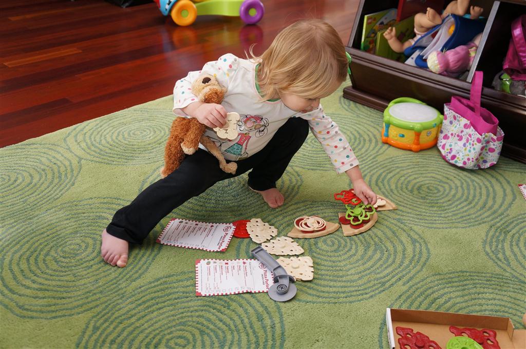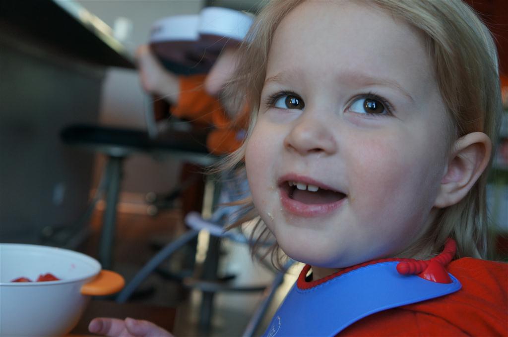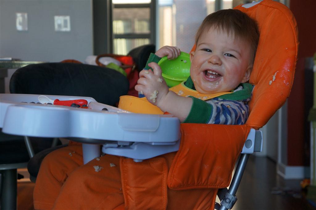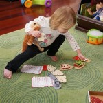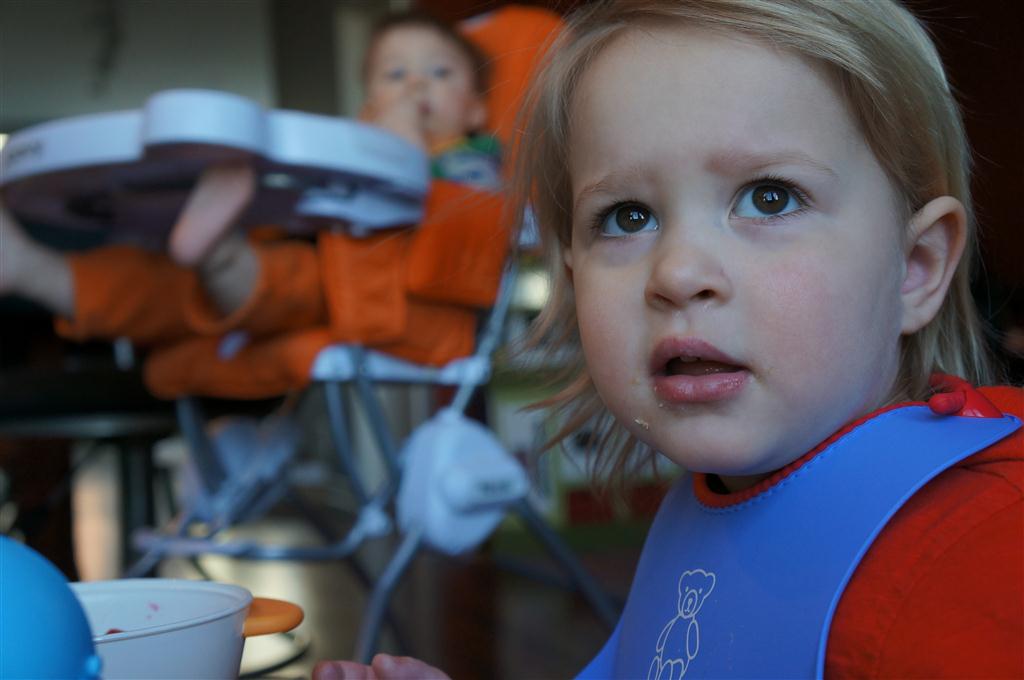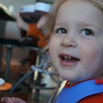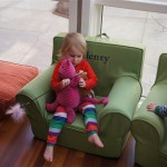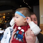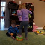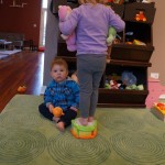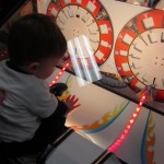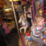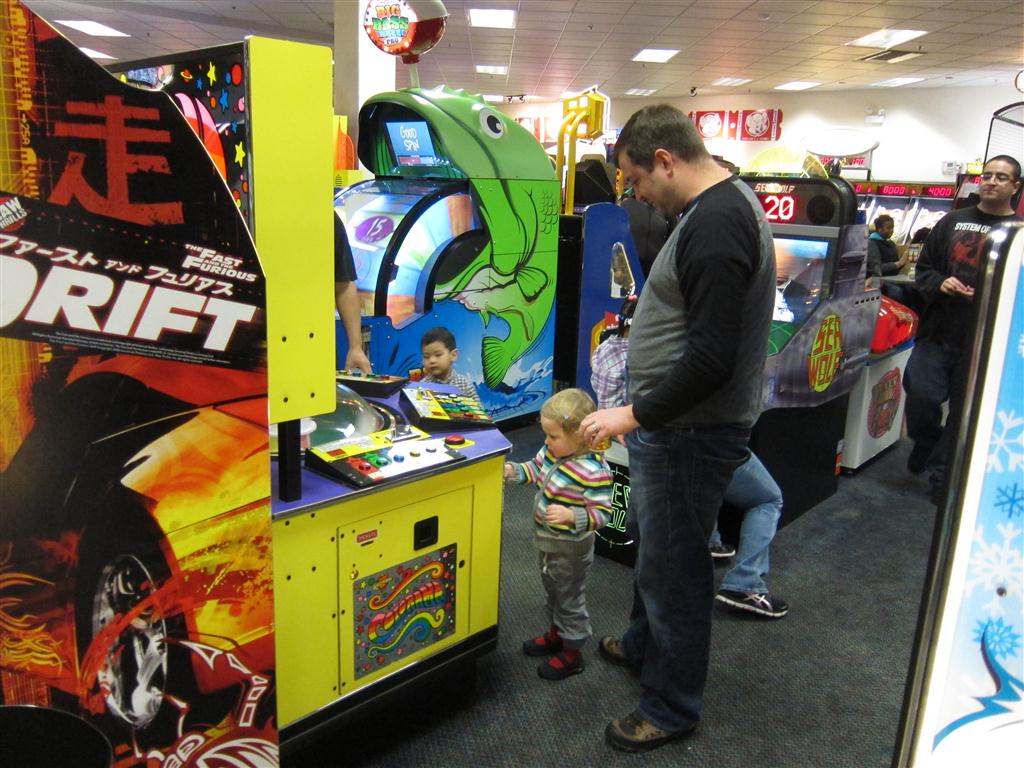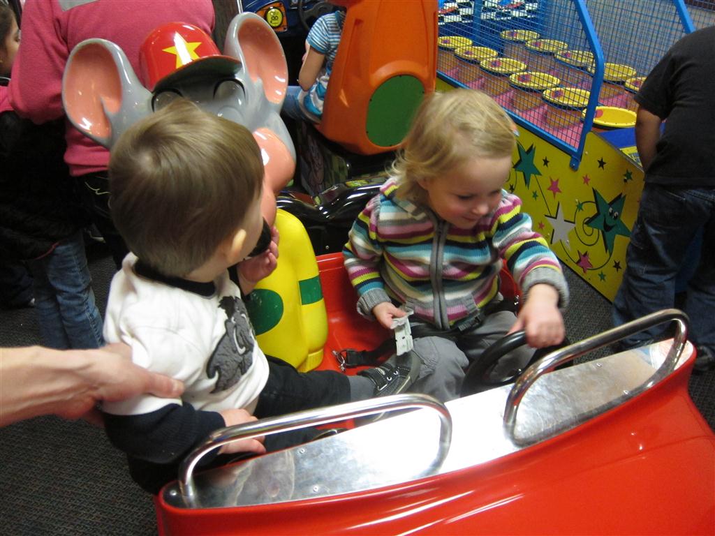 Eleanor had fun this week going to her first birthday party at “Chuck E. Cheese”! She was a bit in awe of all the craziness at first, but she quickly got into the games, and loved putting the coins into the machines and then getting her winning tickets out. Her favorite game was a bucket toss where you got 6 ping pong balls and then got points by throwing them into a bucket. She went for the 1 point bucket each time, which was close enough that she could just lean over and drop the balls in :) . At the end, we counted up our tickets and headed over to the prize station. We had 31 tickets (most kids were showing up with 500+), so I showed Eleanor the 10 point bucket (the lowest one) and the 20 point bucket and told her she could pick one of each. She was very sweet – she quickly picked a green rubber bug and a red plastic Chuck E. Cheese head whistle, and then patiently waited with me while we got the prizes. Eleanor was thrilled with the prizes, and talked about them all the way home when we let her play with them for a few minutes before heading off to bed.