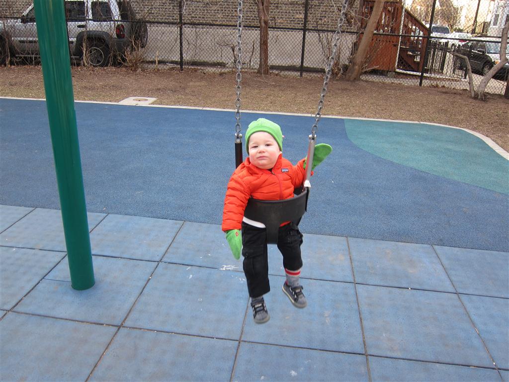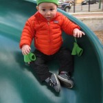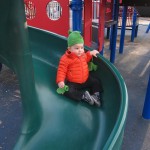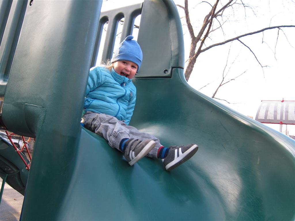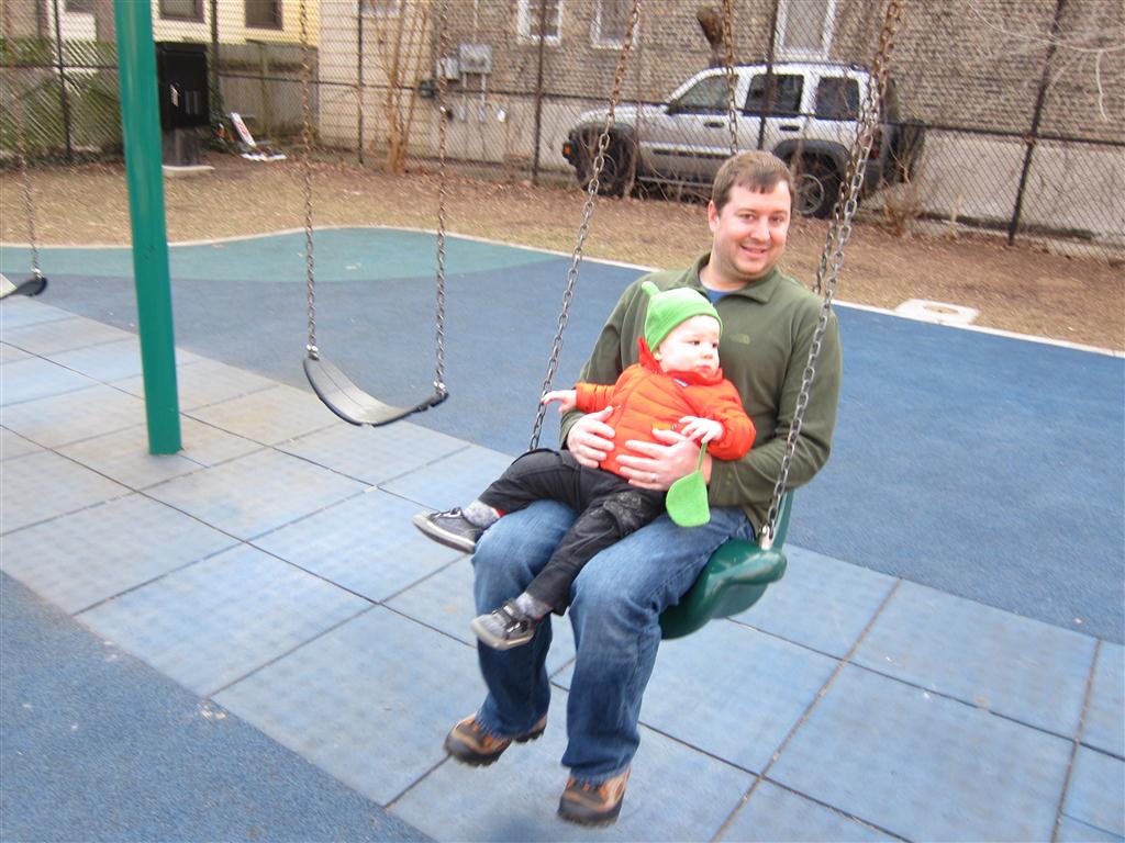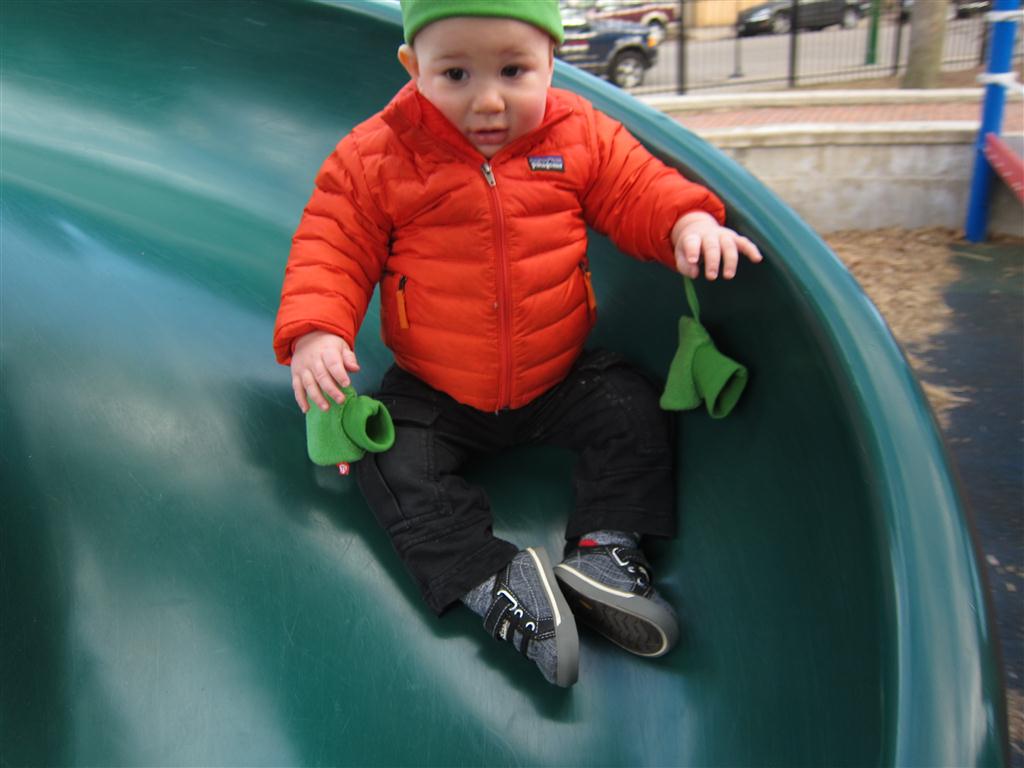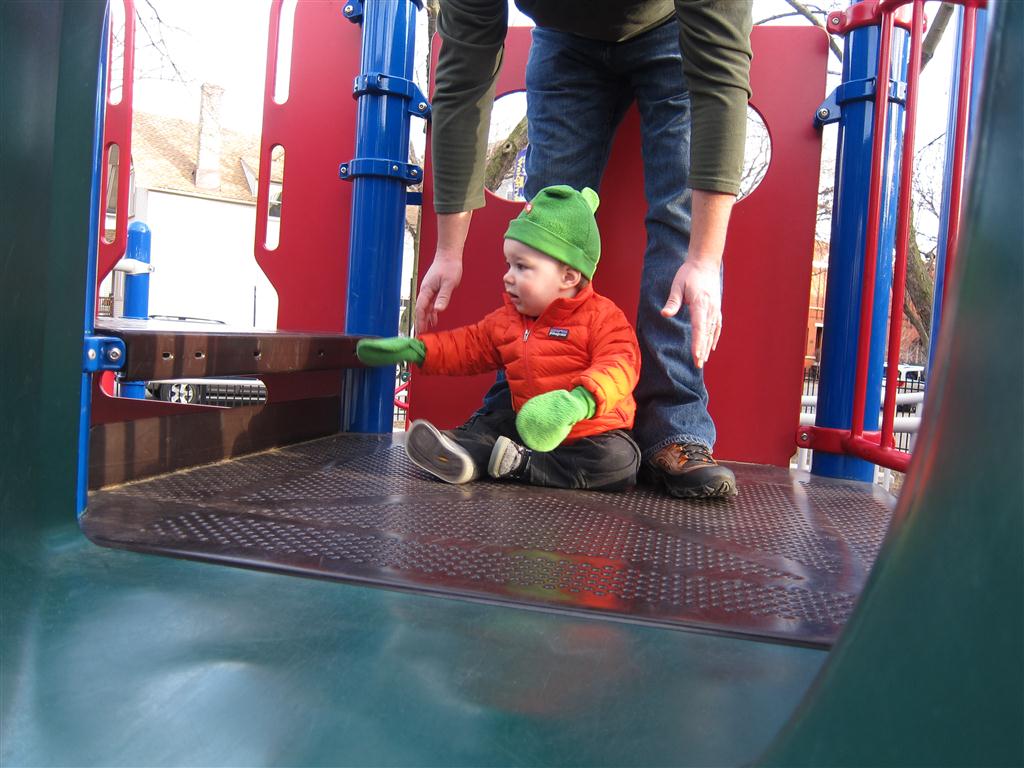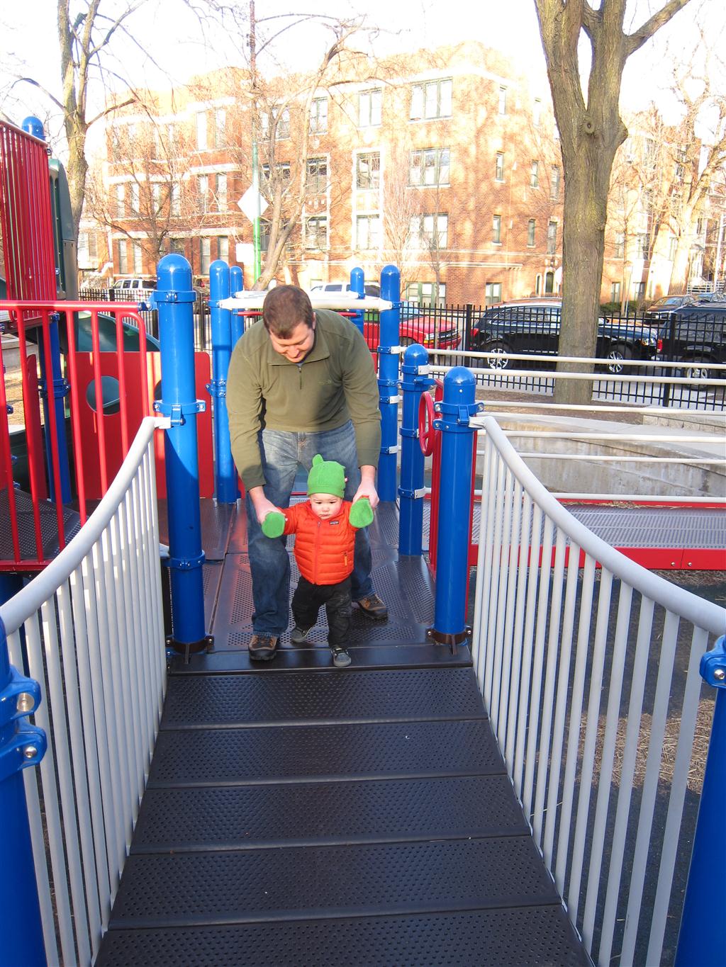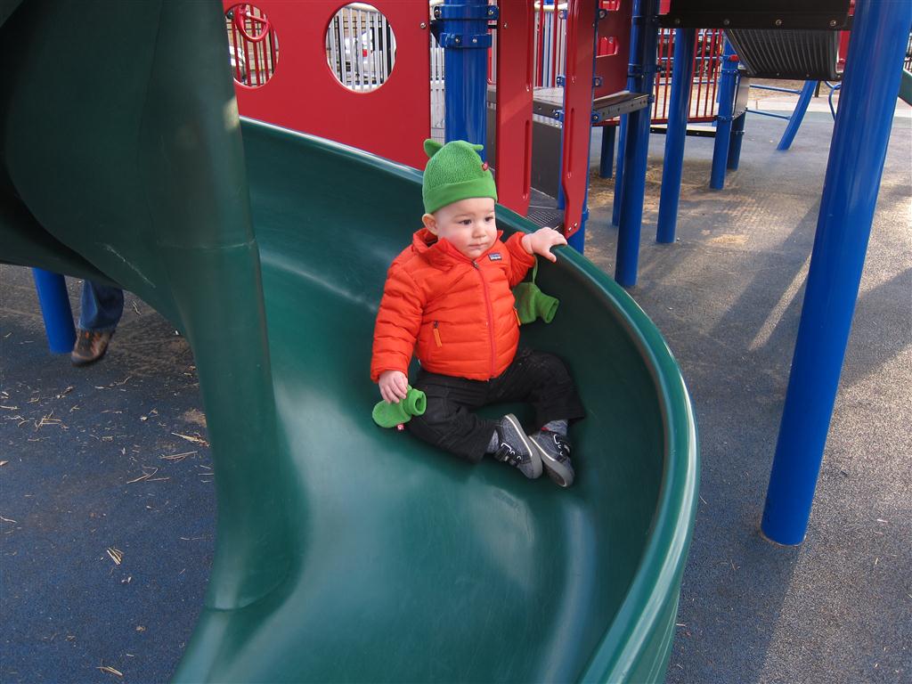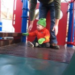Henry finally got to find out what all the fun is about at the park. He has been working on his walking all week, and can now cover quite a bit of distance, and a few times has covered the entire length of the house. So, when we got some unseasonably warm weather this weekend, we headed out to the park and he was able to walk around. It is the first time he has been at the park since he started walking, and you could see the excitement in his face. First, he walked over to the slide and did that a few times, then he headed for the swings with a detour to the rocking horses on the way. His favorite part was climbing up the stairs and steering the big ships wheel.