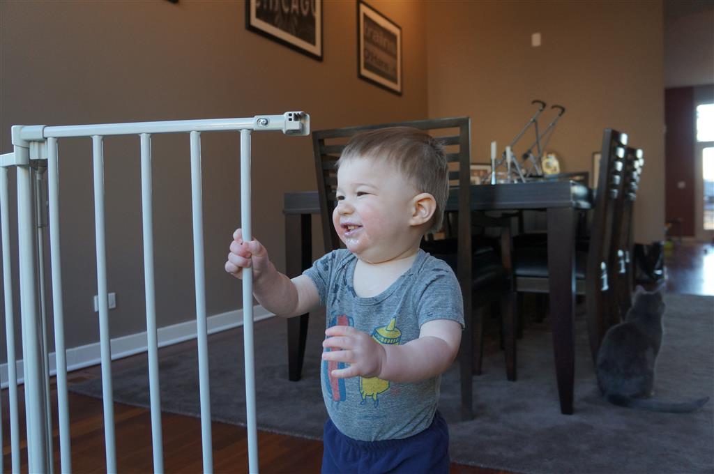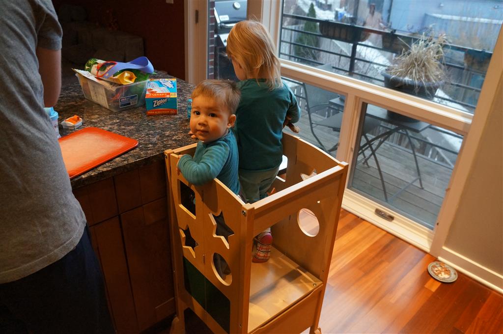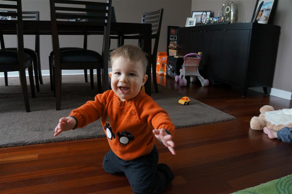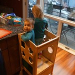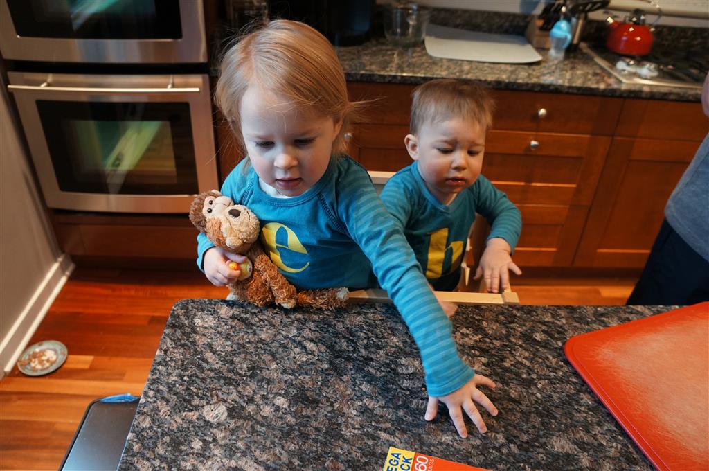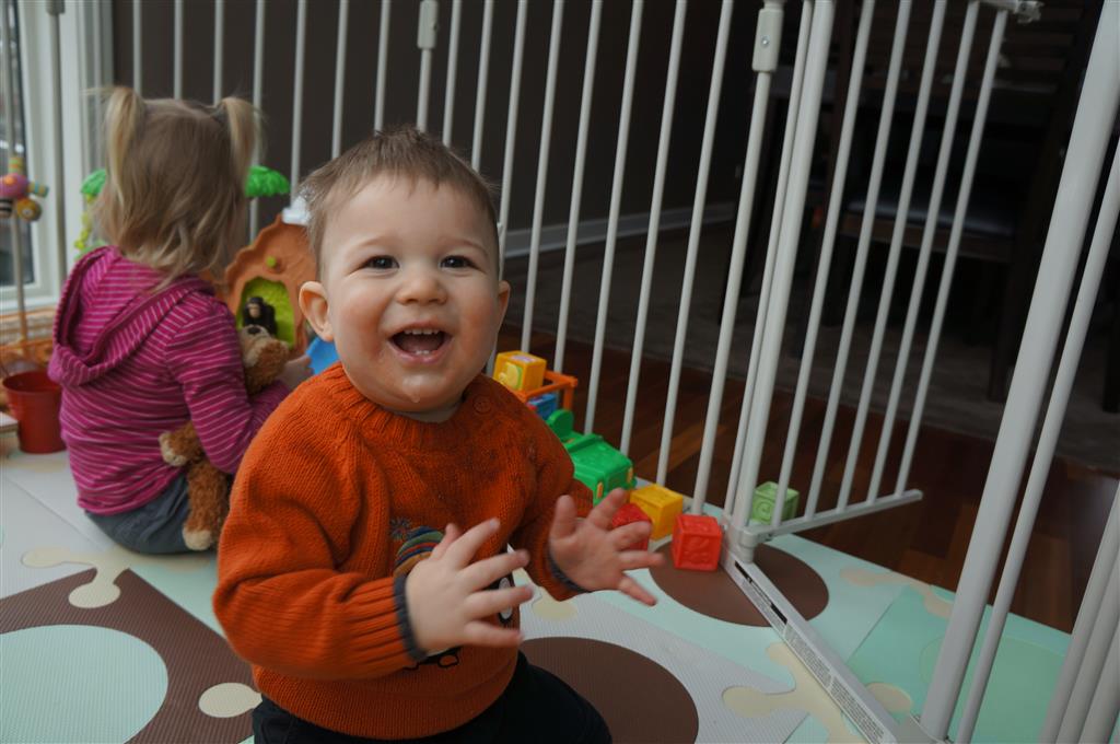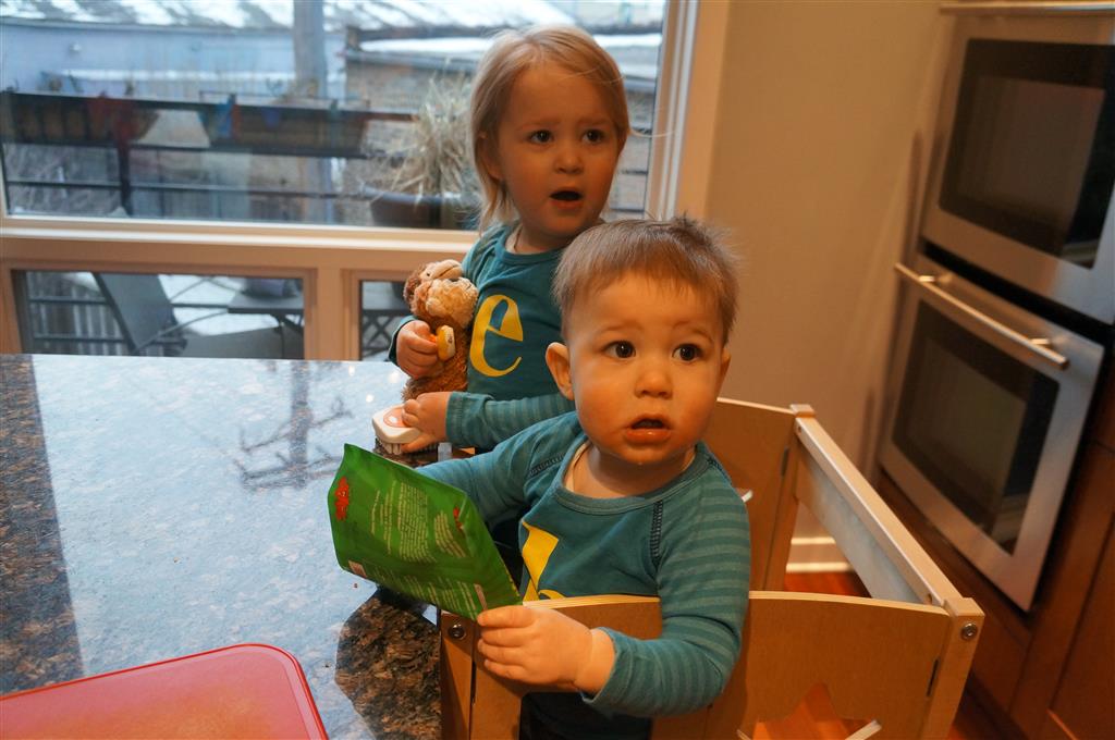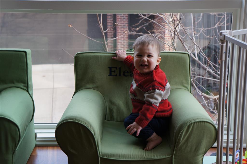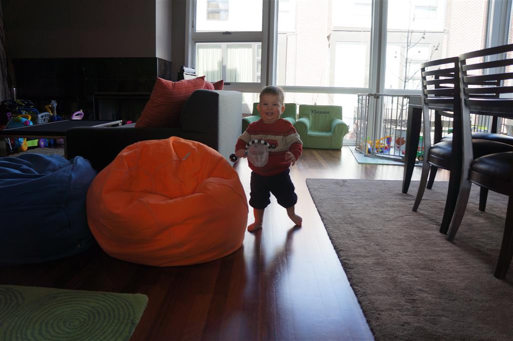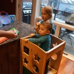 Henry has officially converted to walking. He can now stand up from a seated position without pulling up on anything, and has pretty much given up crawling. Sometimes Mom can even get him to spin in a circle and walk backwards. He can get on and off his rocking horse all by himself, and can also climb up the slide by himself, although he hasn’t quite mastered coming down. Henry is starting to enjoy standing in the kitchen tower and watching Mom and Dad make meals, he even managed to share it with Eleanor during one lunch prep. Speaking of meals, Henry ate a full pear for the first time this week, as well as peanut butter right off the spoon.
