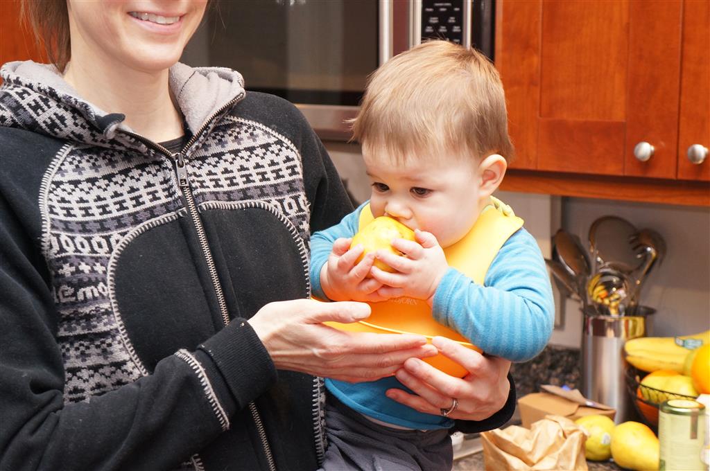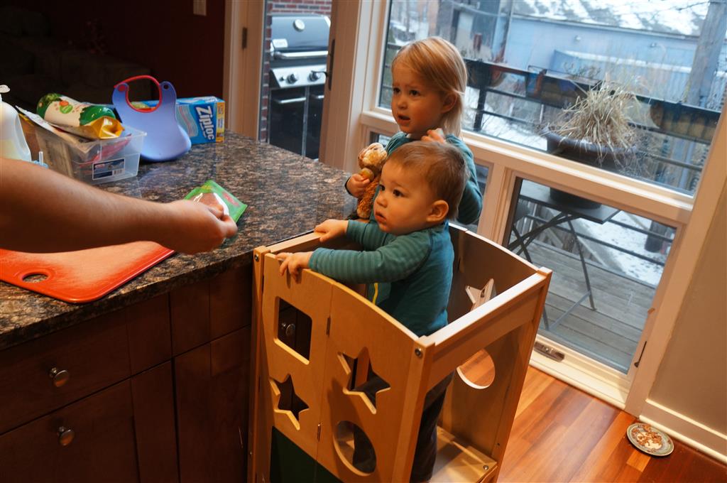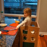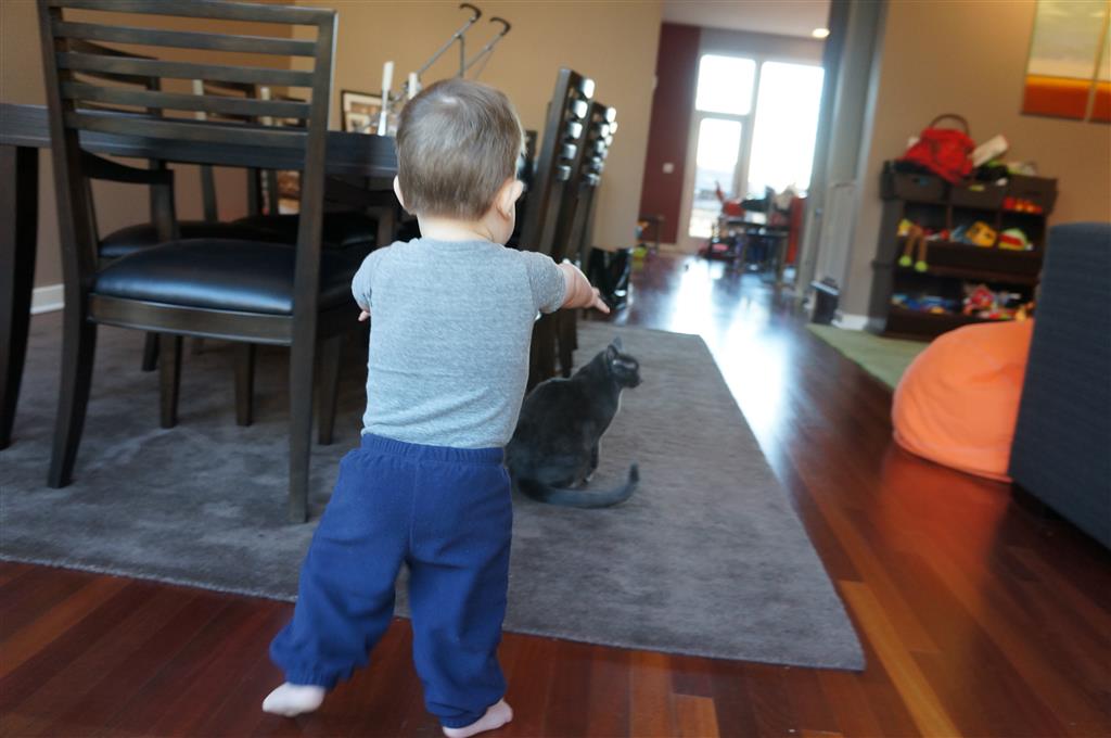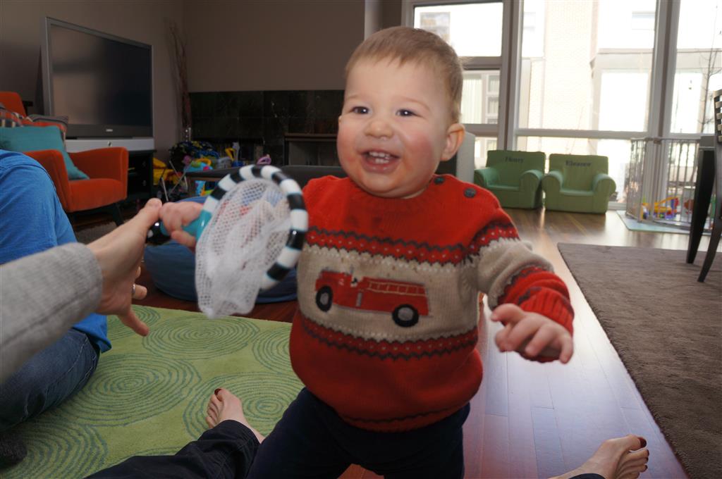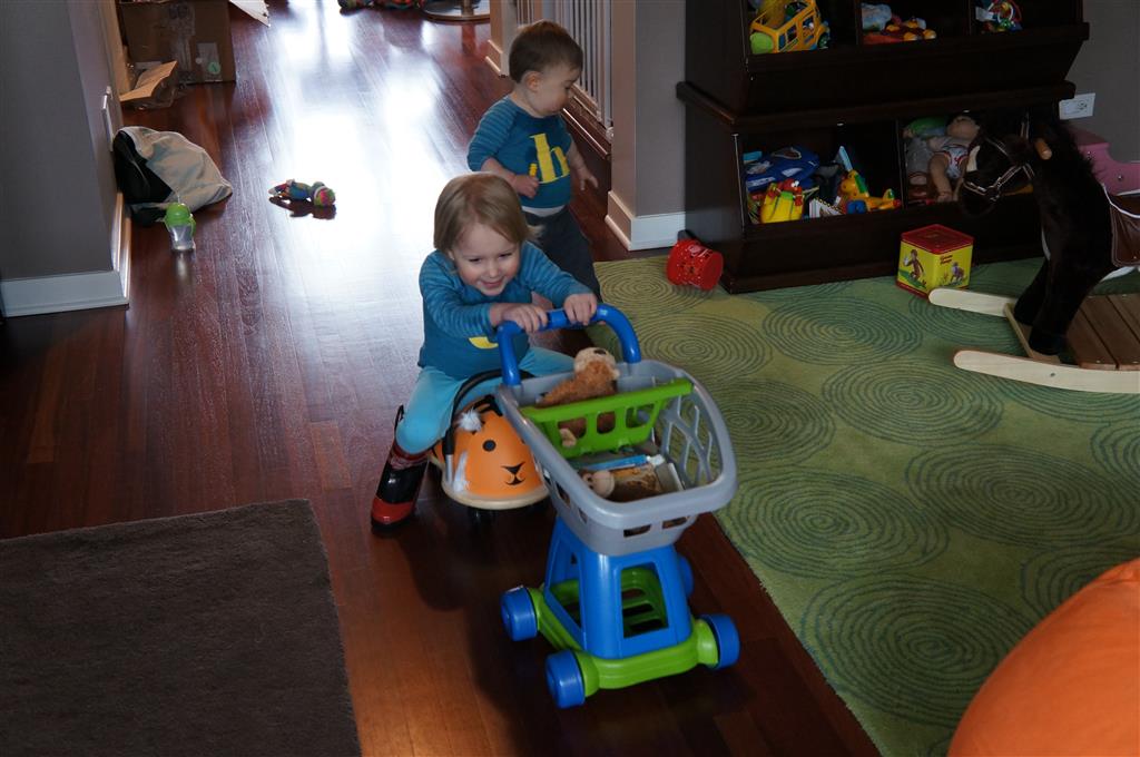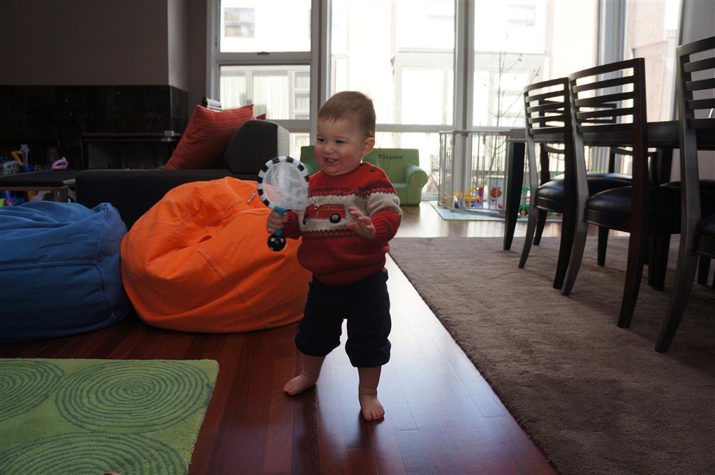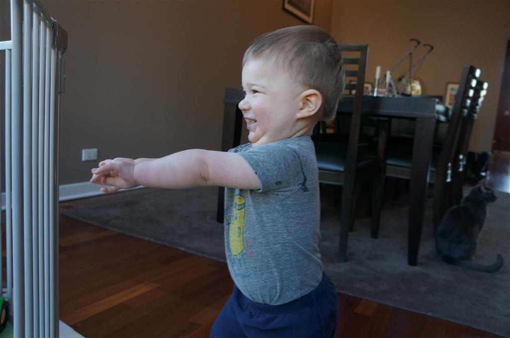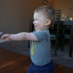 Henry has officially converted to walking. He can now stand up from a seated position without pulling up on anything, and has pretty much given up crawling. Sometimes Mom can even get him to spin in a circle and walk backwards. He can get on and off his rocking horse all by himself, and can also climb up the slide by himself, although he hasn’t quite mastered coming down. Henry is starting to enjoy standing in the kitchen tower and watching Mom and Dad make meals, he even managed to share it with Eleanor during one lunch prep. Speaking of meals, Henry ate a full pear for the first time this week, as well as peanut butter right off the spoon.