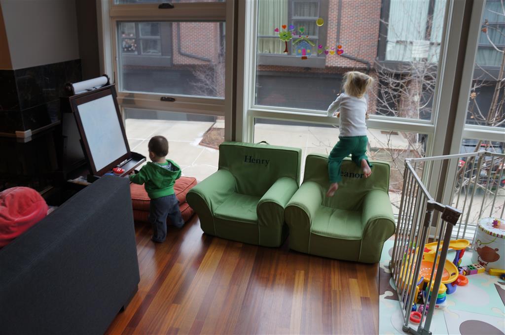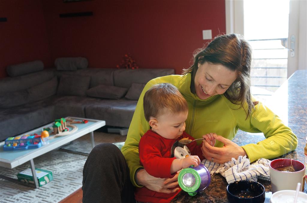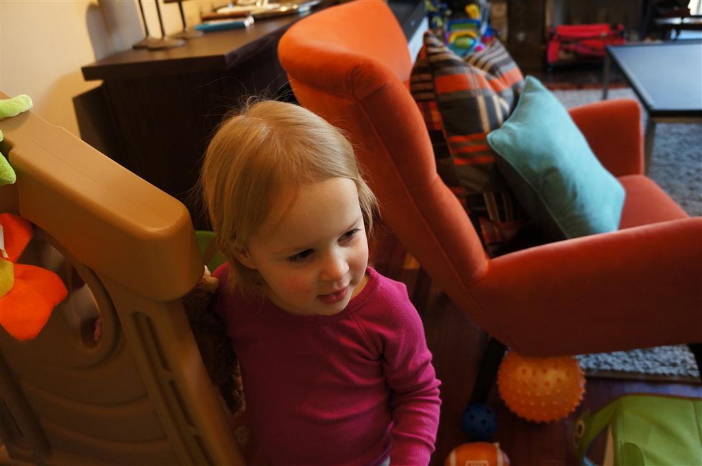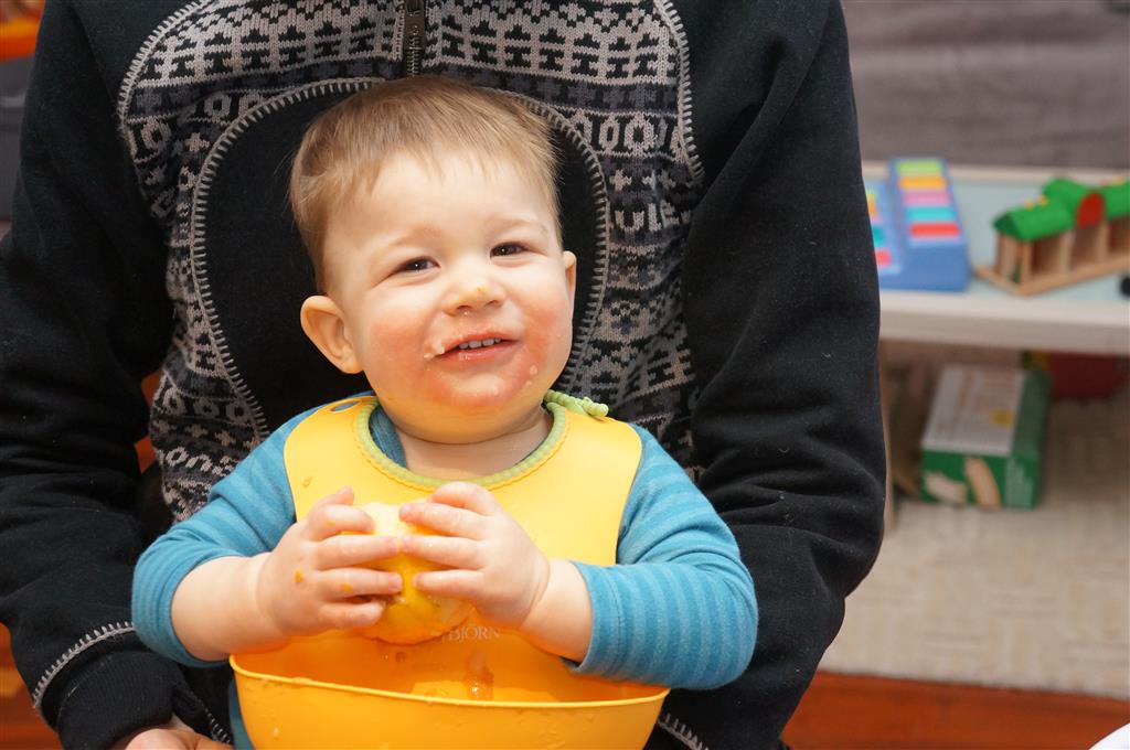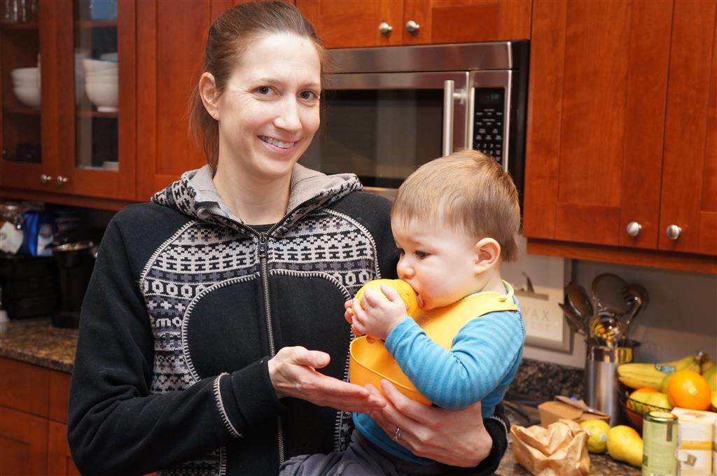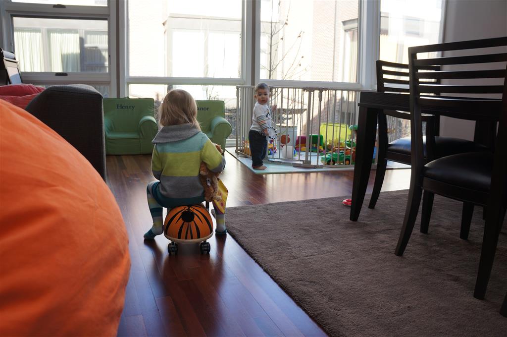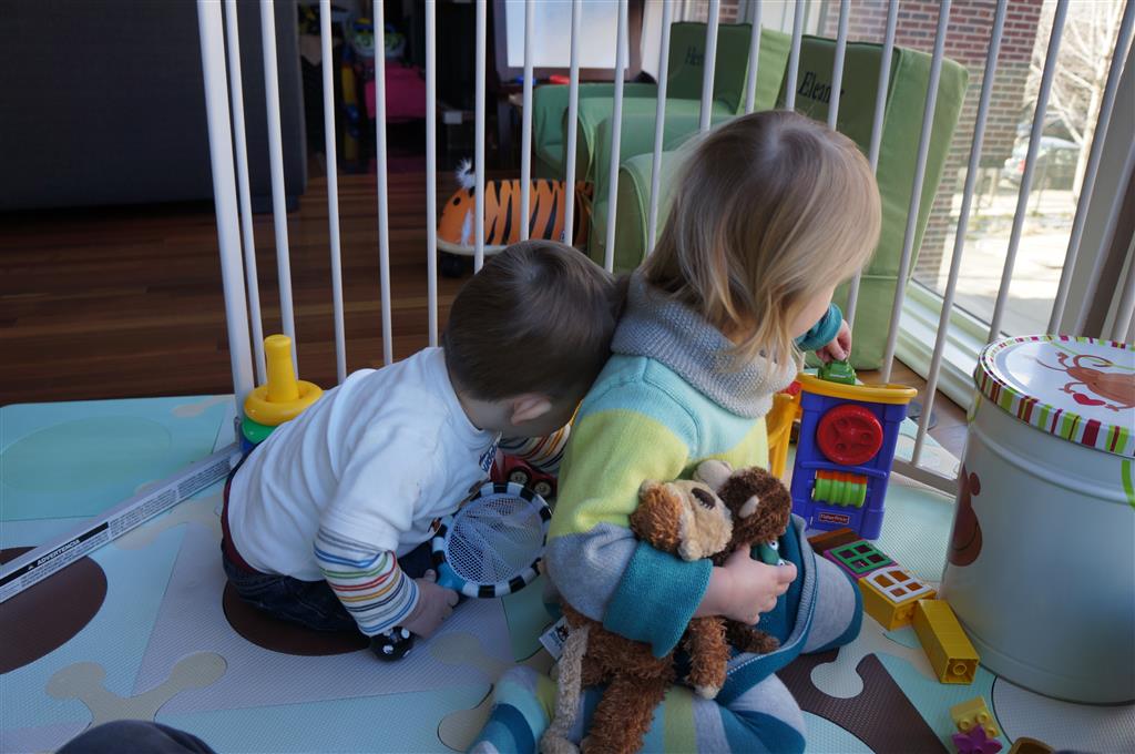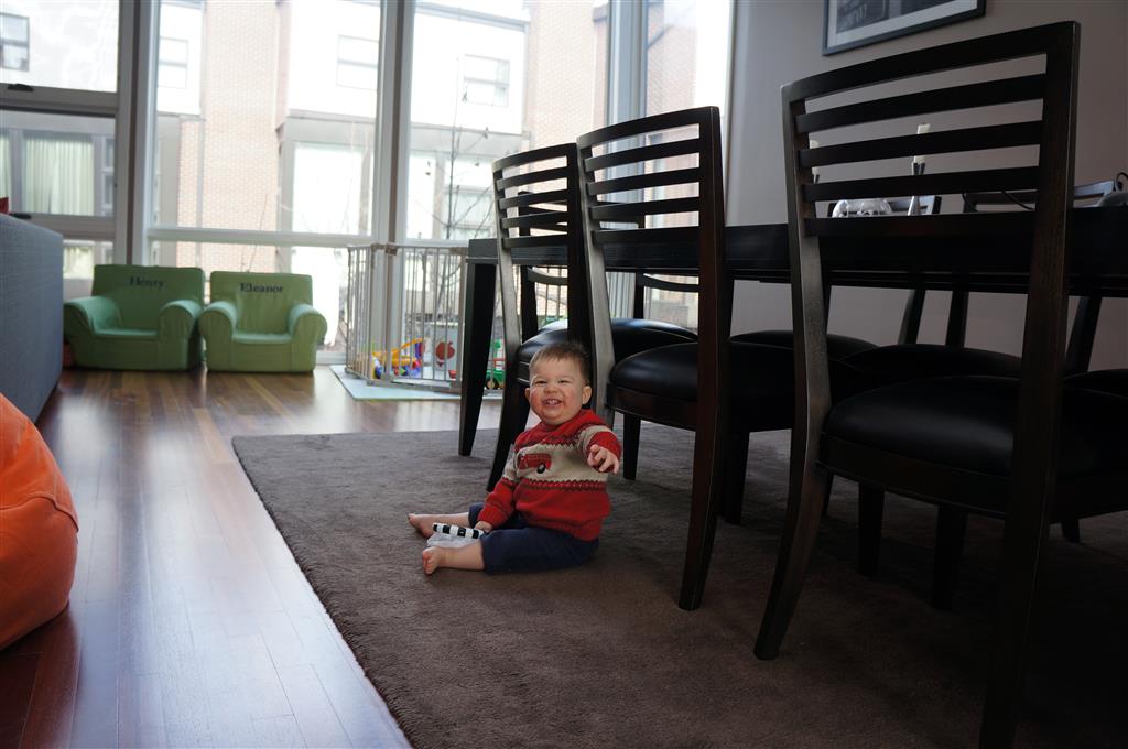 Henry has officially converted to walking. He can now stand up from a seated position without pulling up on anything, and has pretty much given up crawling. Sometimes Mom can even get him to spin in a circle and walk backwards. He can get on and off his rocking horse all by himself, and can also climb up the slide by himself, although he hasn’t quite mastered coming down. Henry is starting to enjoy standing in the kitchen tower and watching Mom and Dad make meals, he even managed to share it with Eleanor during one lunch prep. Speaking of meals, Henry ate a full pear for the first time this week, as well as peanut butter right off the spoon.