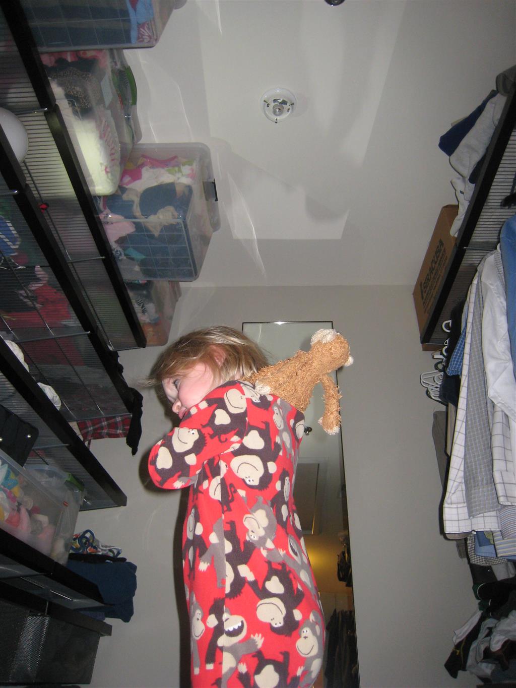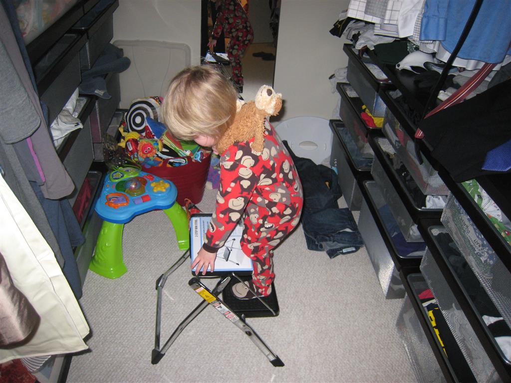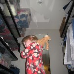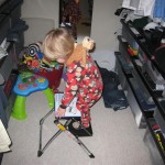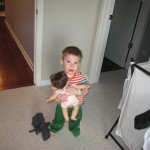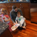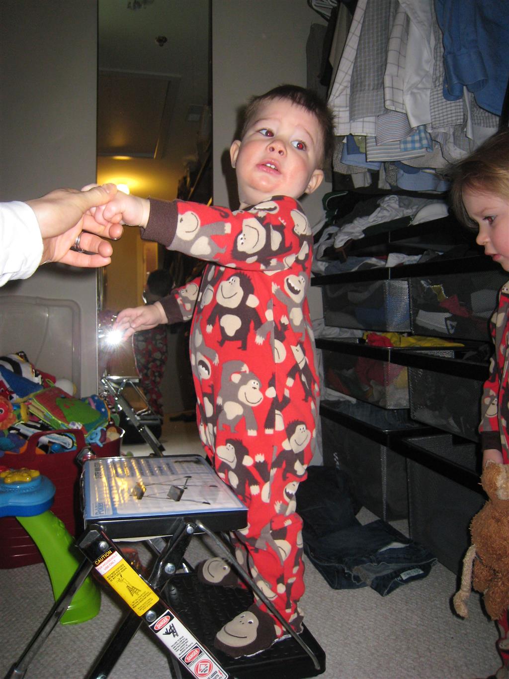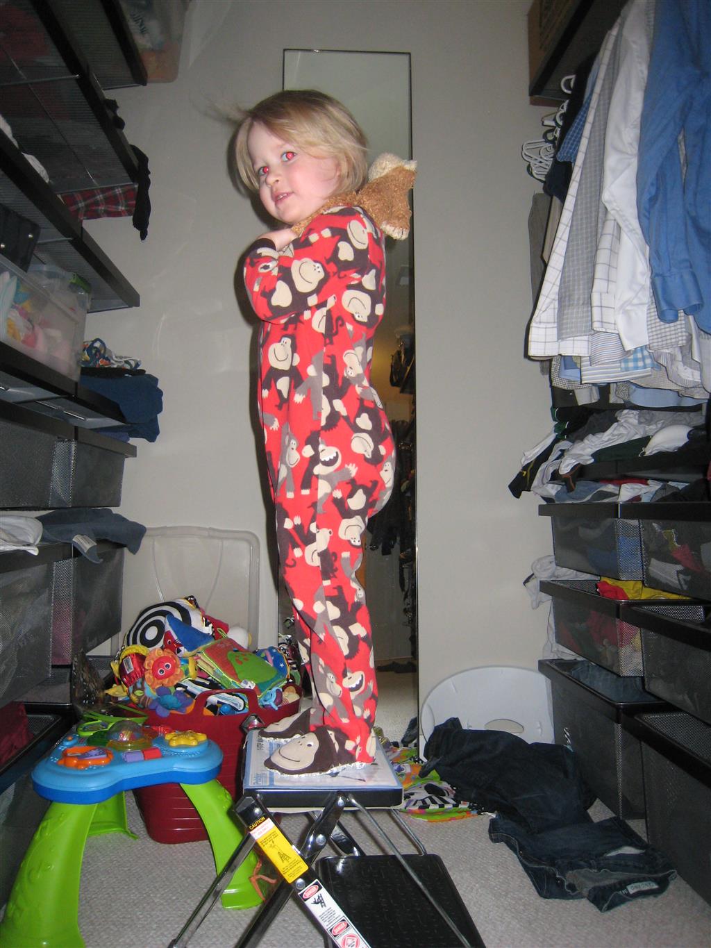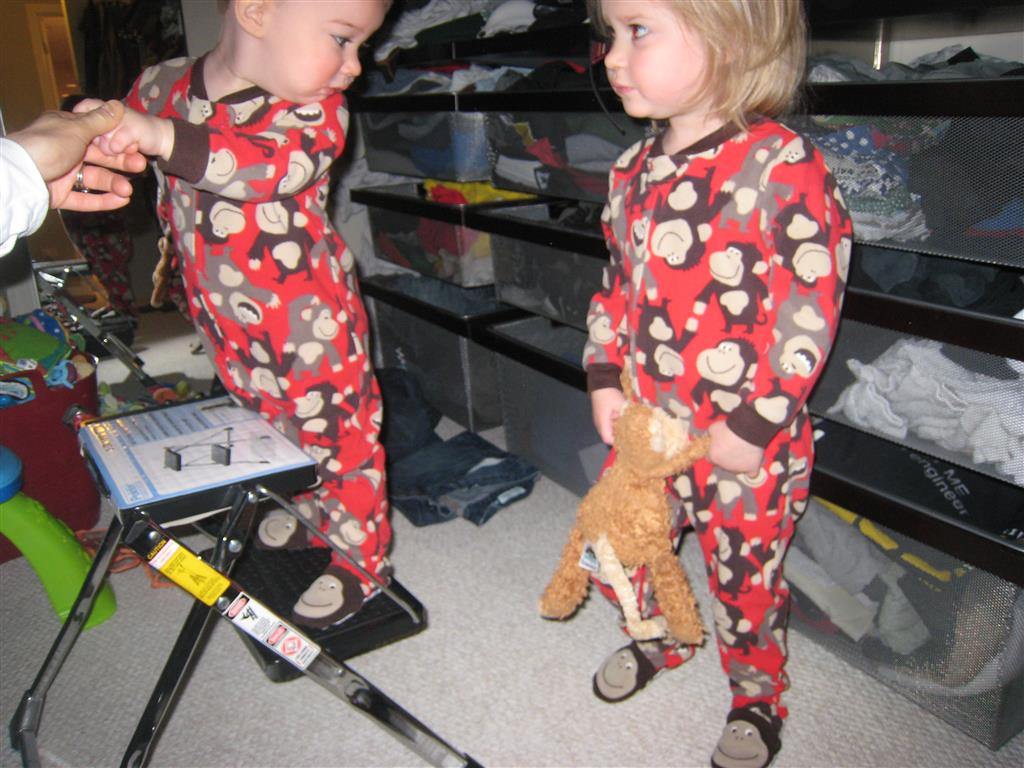 The first series of photos this week requires a bit of an explanation. Eleanor is fascinated by burned out light bulbs, and loves to point them out and ask for Dada to fix them. Well, this turned into a bit of a game where I put her or one of her dolls on my shoulders and ask if they are now tall enough to change the light. So, while I was getting new bulb for the closet, Eleanor climbed the stool with Monkey on her shoulders – and then of course Henry wanted to get in on the fun.