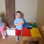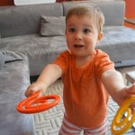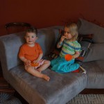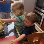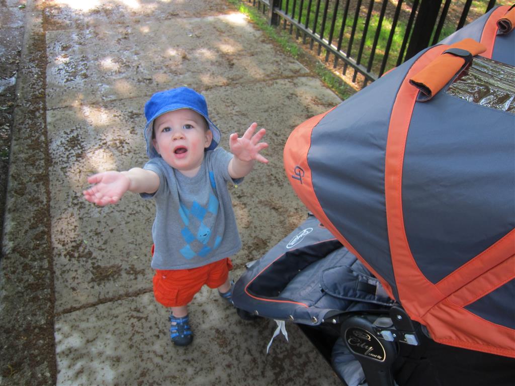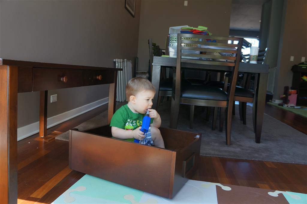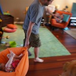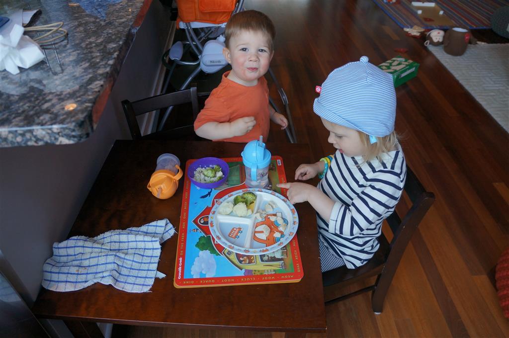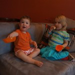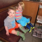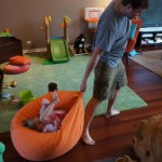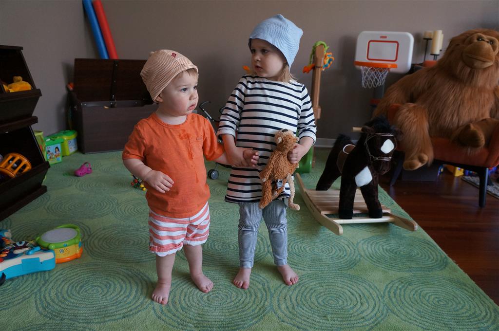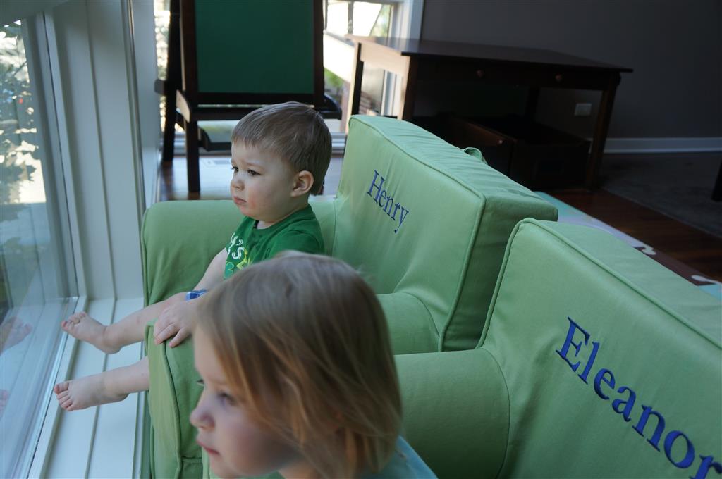 Henry continues to make new sounds and add more “first syllable” words to his vocabulary. He has sounds for puppet, water and button, and banana is starting to separate itself from the generic “apple” that he uses for most fruits. He successfully pointed out Mimi on the fridge magnets – typically he only gets Papa and Grandpa. His favorite activity is whatever Eleanor is doing, even if that means sitting on the potty. For firsts, he ate his first full meal at the table with Eleanor instead of in his high chair, but I think he isn’t quite ready to do that with every meal.