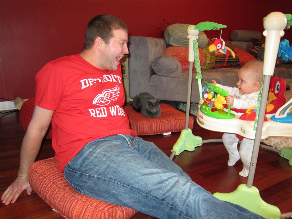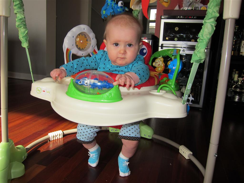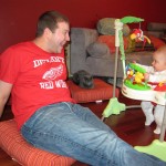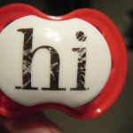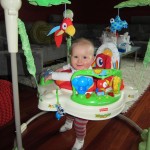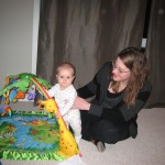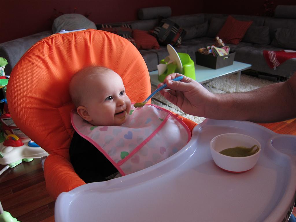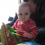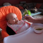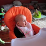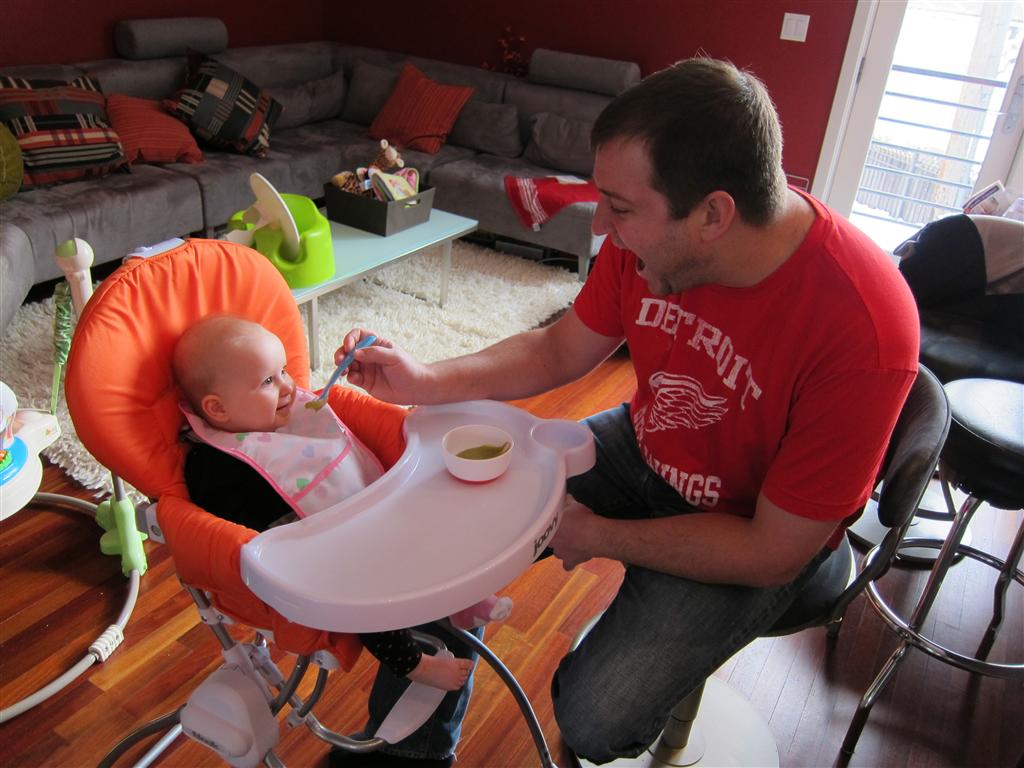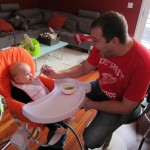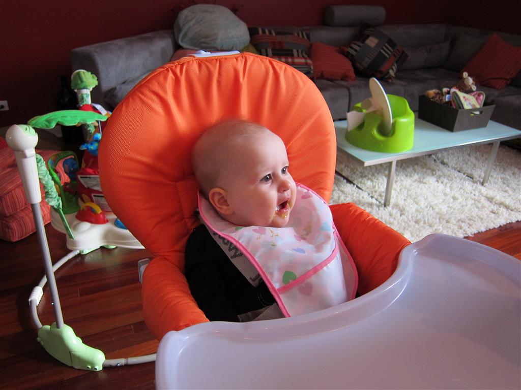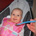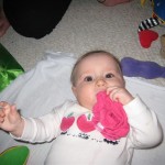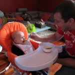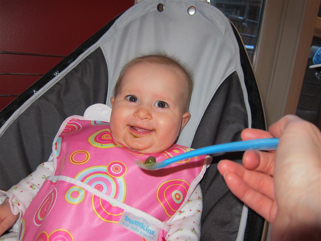 We purchased Eleanor a high chair this week to aid in her new found love of food.  She has been branching out into crazy food combinations like “Pears, Peas and Broccoli” and “Peach Oatmeal Banana”.  Her favorite still seems to be single fruits, especially pears and mangoes.  Amazingly, we still don’t have any progress to report on the top two teeth, but Amy discovered that Eleanor can still do quite a bit of damage with just the lower two.  Her “Hi” pacifier now resembles an ice rink after a full period of hockey.