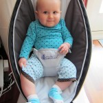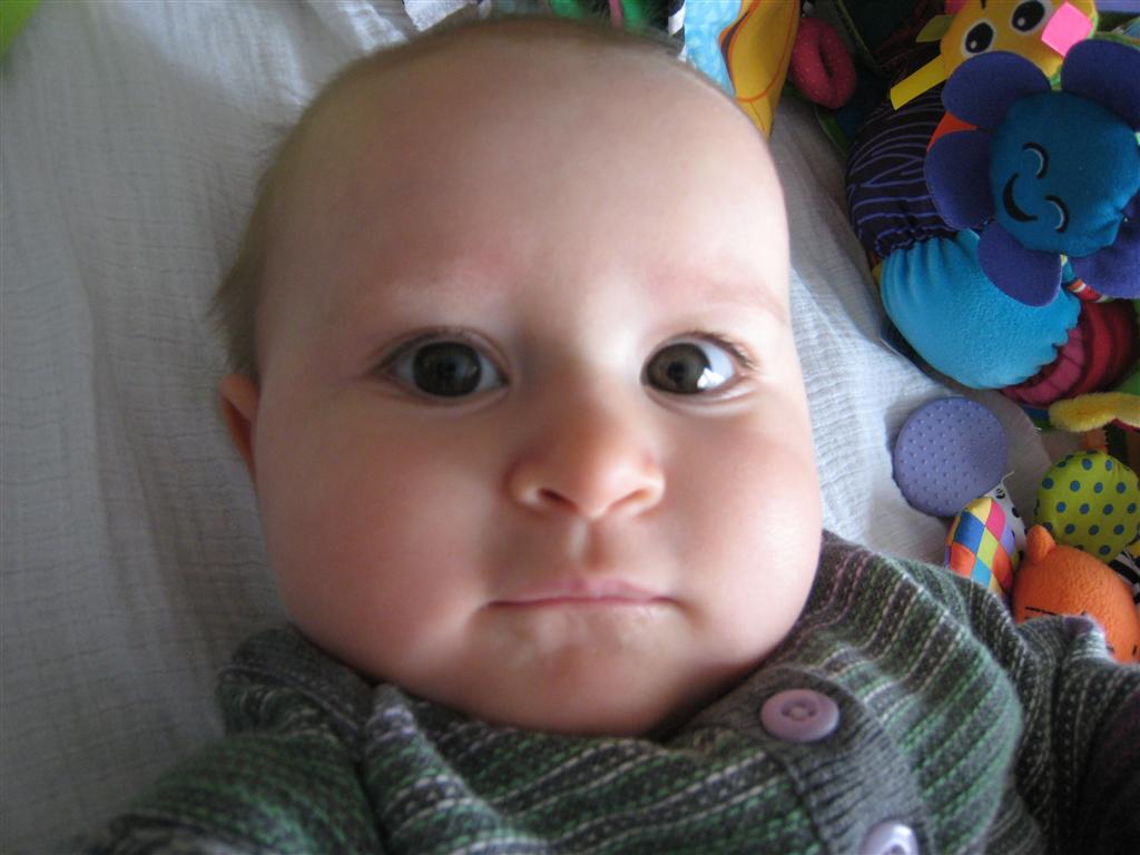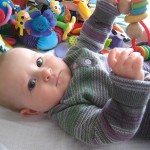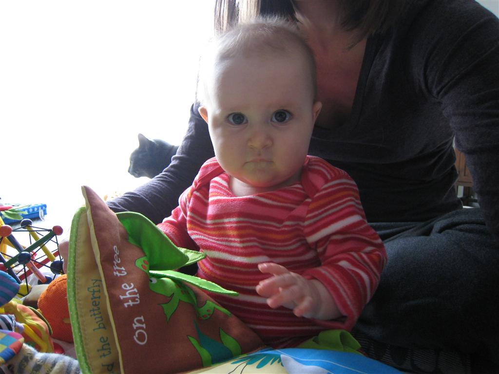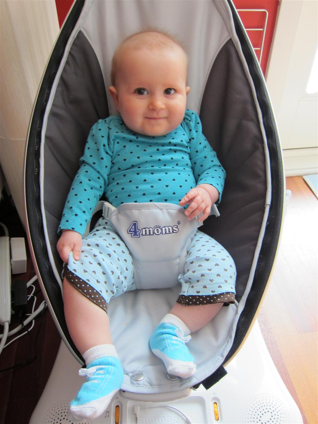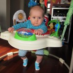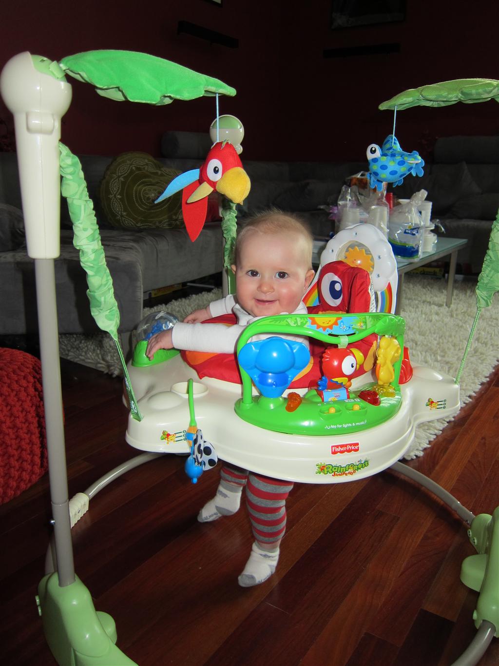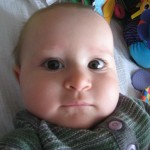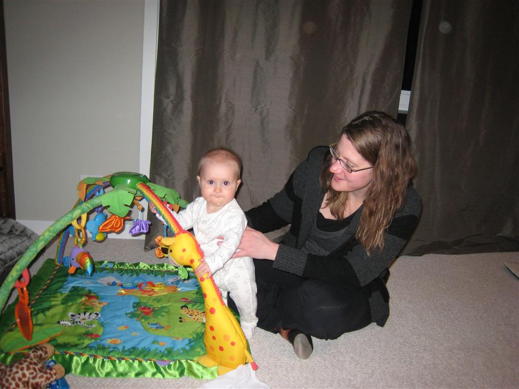 We purchased Eleanor a high chair this week to aid in her new found love of food.  She has been branching out into crazy food combinations like “Pears, Peas and Broccoli” and “Peach Oatmeal Banana”.  Her favorite still seems to be single fruits, especially pears and mangoes.  Amazingly, we still don’t have any progress to report on the top two teeth, but Amy discovered that Eleanor can still do quite a bit of damage with just the lower two.  Her “Hi” pacifier now resembles an ice rink after a full period of hockey.