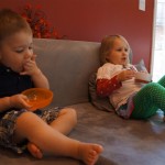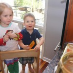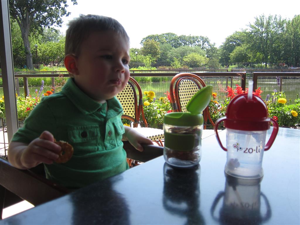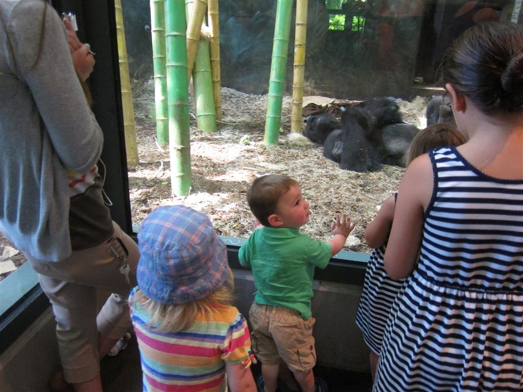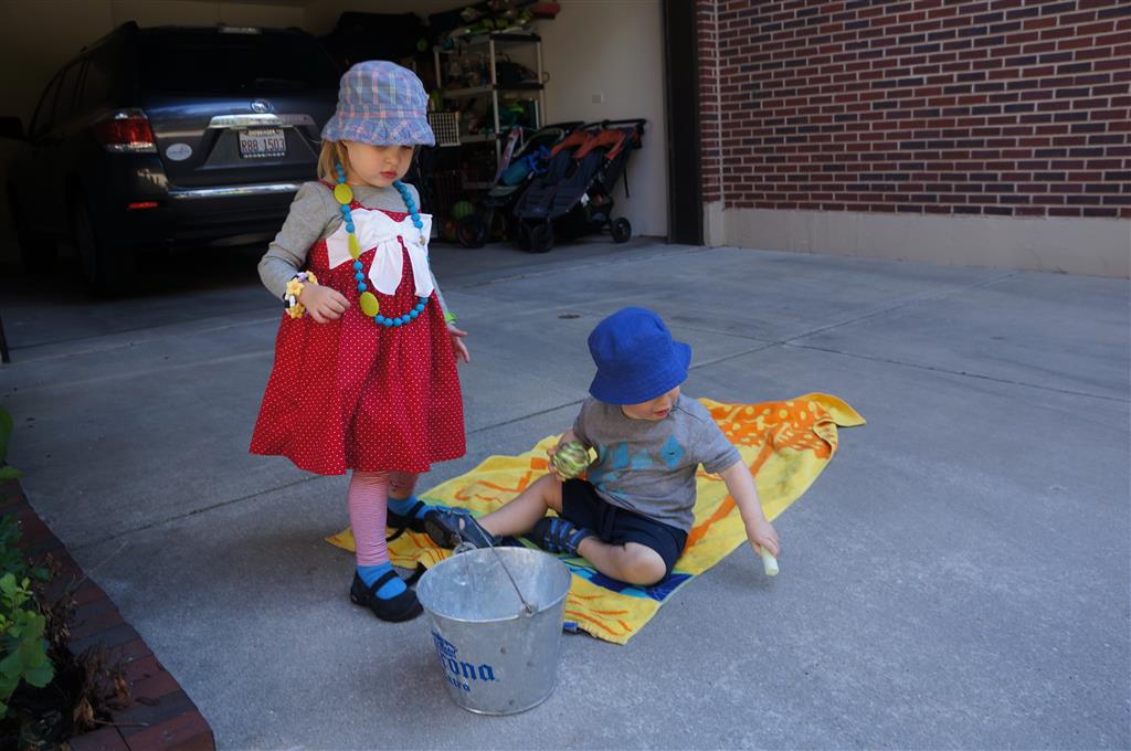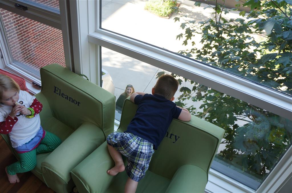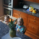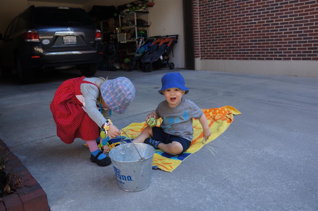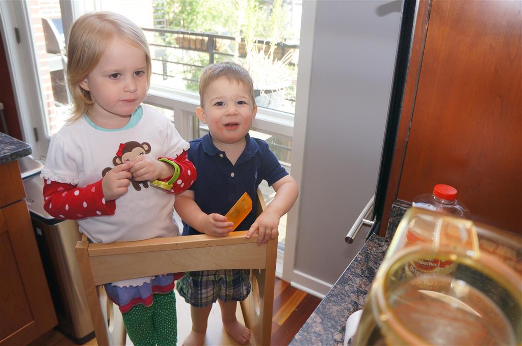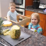 This week brought relief from the super hot weather and Henry and Eleanor took advantage with lots of good outdoor time. They both had a blast at the Zoo, especially the outdoor lunch at Café Brauer. Henry has recently added “Ashes” to his vocabulary, and to celebrate he likes to dance “Ring around the Rosie” while holding hands with Eleanor. He is also improving his balance – he can now go up and down the step at the front door – and is very impressed with himself when he “runs” off it while playing in the front driveway. Both Eleanor and Henry had a great day at swim class this week – they both blew bubbles in the pool! Mom had some friends in town this weekend, so Dad and Lala were each in charge for a day. Dad got to go to Bubbles class with Henry and do preschool drop off with Eleanor. Eleanor was very excited to show me how to sign her in and put her things in her cubby, and at pickup time Henry showed me the way to her classroom. On Saturday, Lala took the kids for a trip to Whole Foods, and came back with a pineapple for a yummy snack.