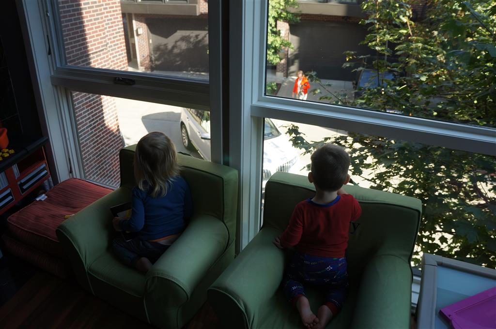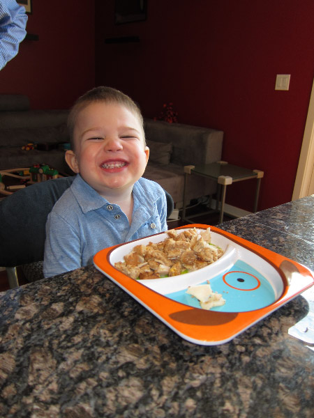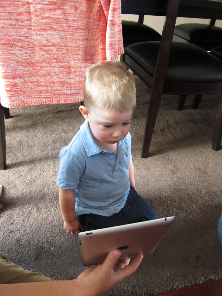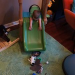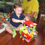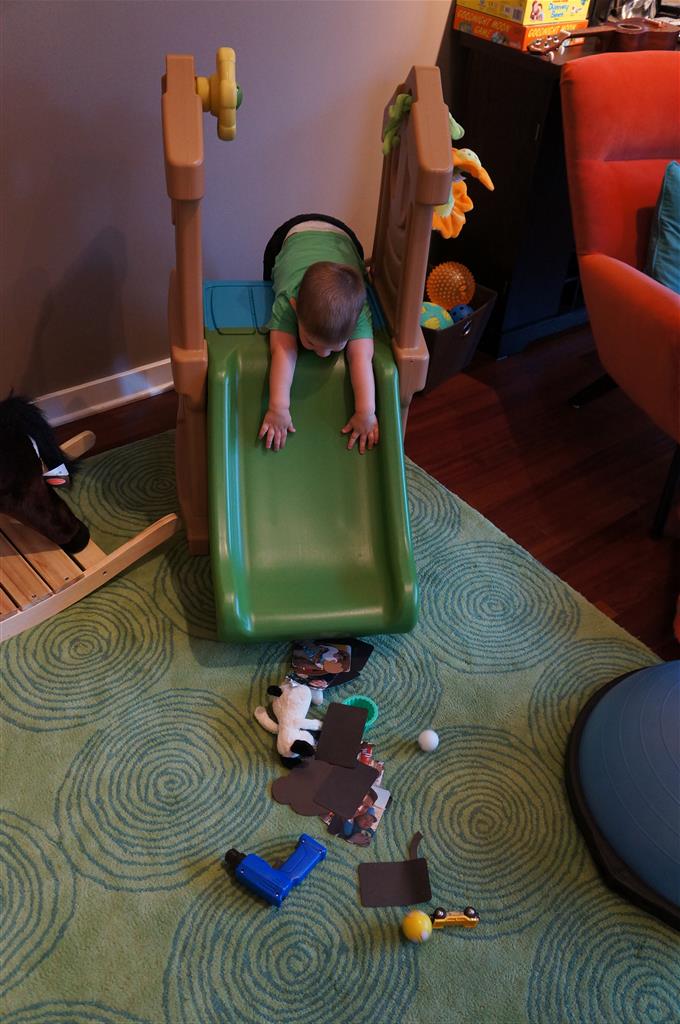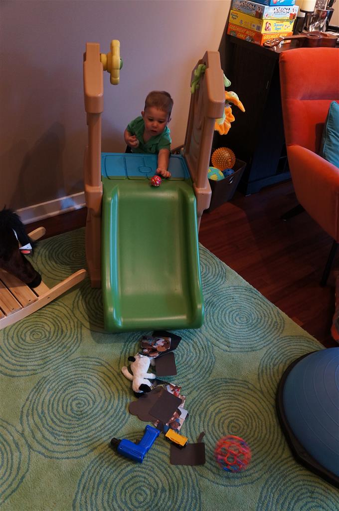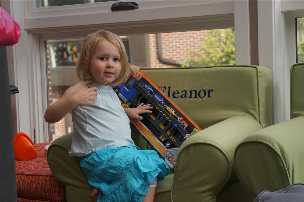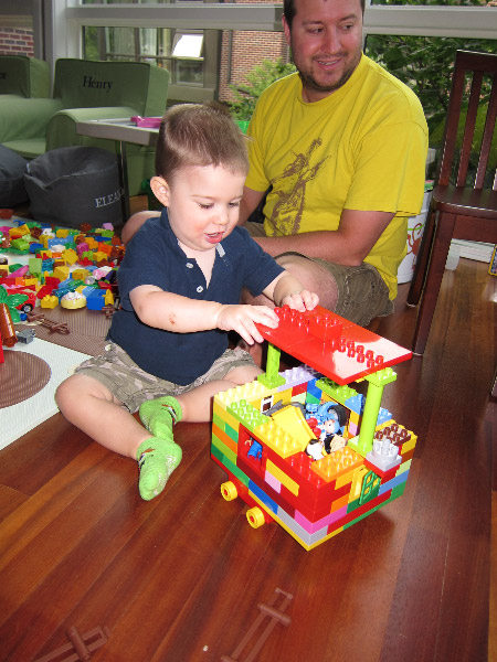 Henry is adding to his vocabulary on a daily basis now, some new fun words include “happy”, “sure” and “I do” said with perfect Eleanor mimicking inflection, “please”, “excuse me”, “2”, “5” and “Elmo”. He entertained Eleanor and Dad with a fun game of “hide the shape” with the shape sorter, and had Mom laughing out loud when he triumphantly handed her a toy that Eleanor had been searching for the previous day. He is definitely enjoying his new communication skills. Henry also had a “surprise” scooter ride this week. He was pushing the scooter around and managed to get to the top of the little hill in our driveway – at which point he turned around and started to push it down – but of course it accelerated down the hill by itself, and he managed to stay on and neither fall nor crash all the way down the hill. He received much applause from Mom and several neighbors that were watching.