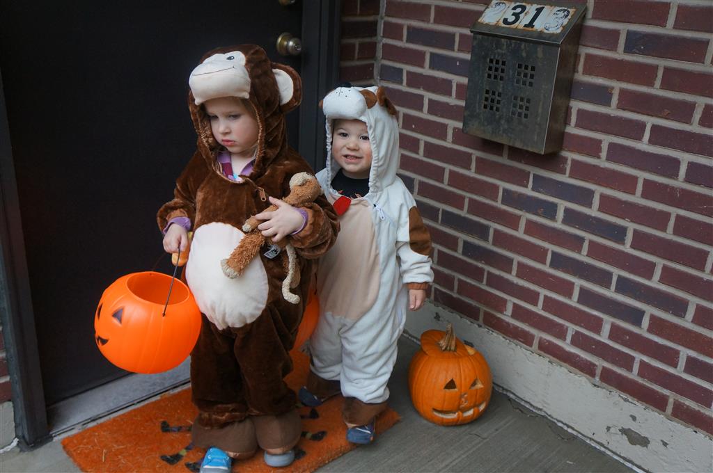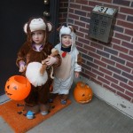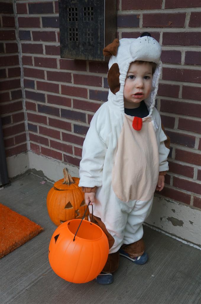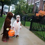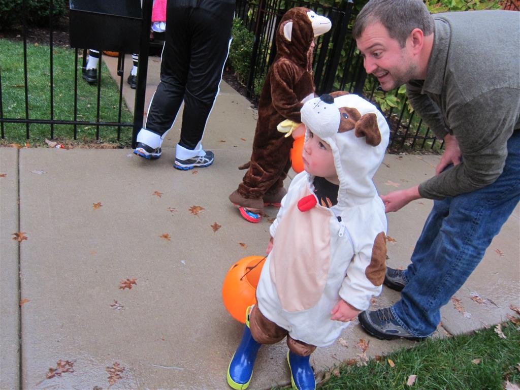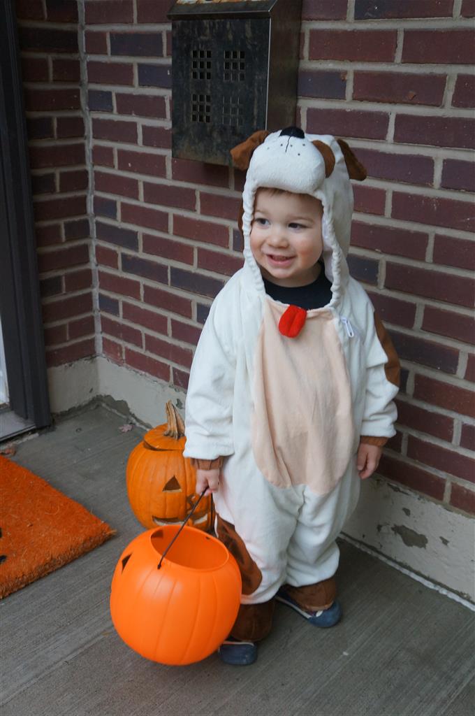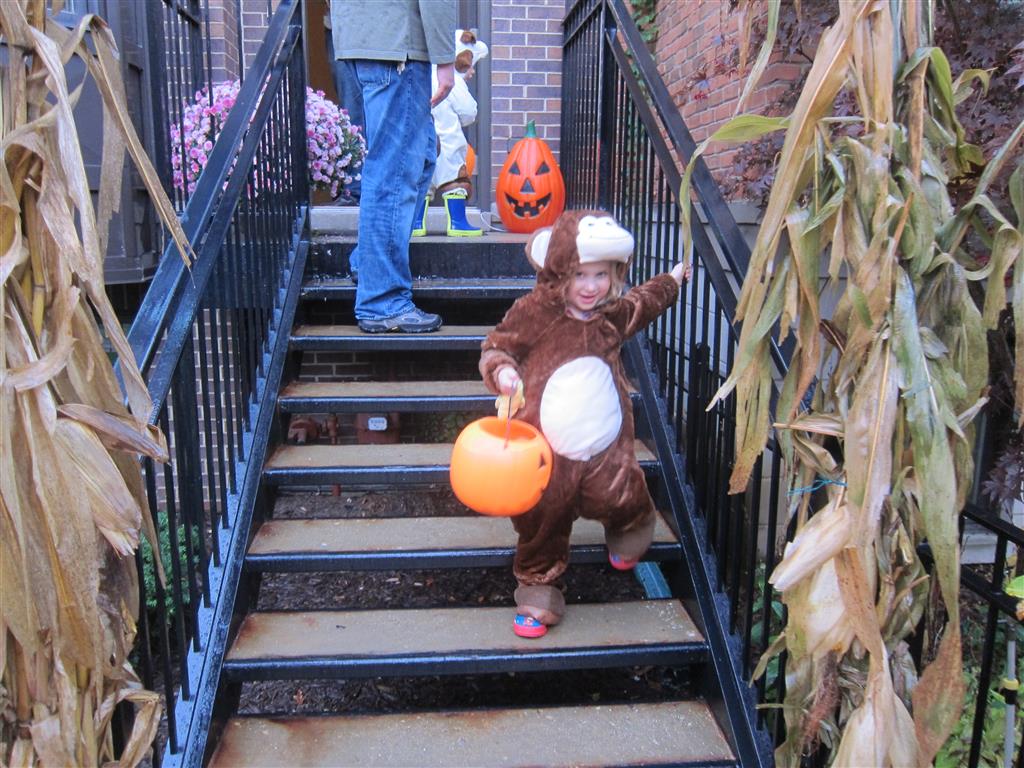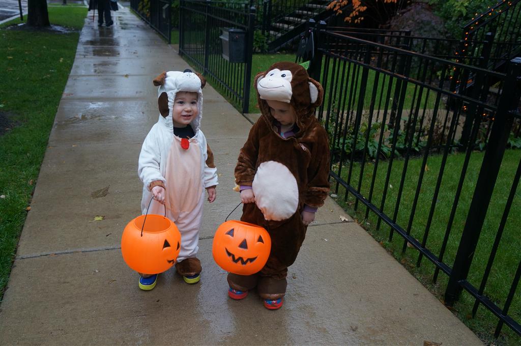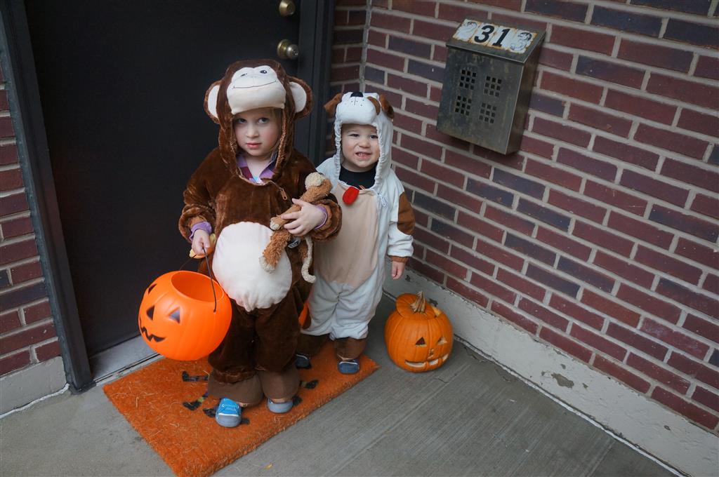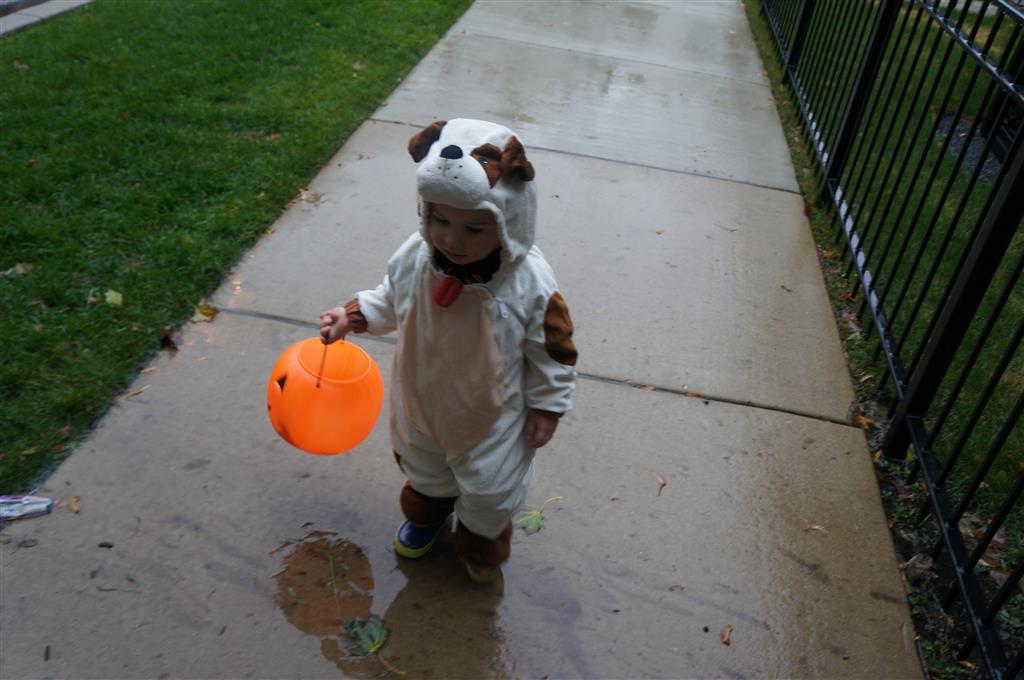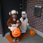 Eleanor and Henry had a great Halloween this week! They both dressed up to match their favorite stuffed friends – Eleanor a monkey and Henry a dog. Henry wasn’t sold on the whole costume at first, but the event grew on him. By the time we were actually trick or treating, he was having a blast walking in the rain and stomping in puddles. Going up to actual houses for candy was a side activity at best, and was eventually completely abandoned in favor of more puddle stomping. Eleanor had fun going up to houses for a little while, but the half flight of stairs up to each door eventually wore on her, and she lost interest as well. She did love Uncle B’s costume – and drew quite a crowd as she dragged it through the street. Who knew monkeys liked apples? Henry had quite the love hate relationship with the apple, he couldn’t stop looking at it while Uncle B was inside, but for every step that Uncle B took, Henry took one to maintain his distance, and much preferred to have Dad between the two.