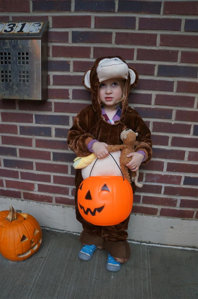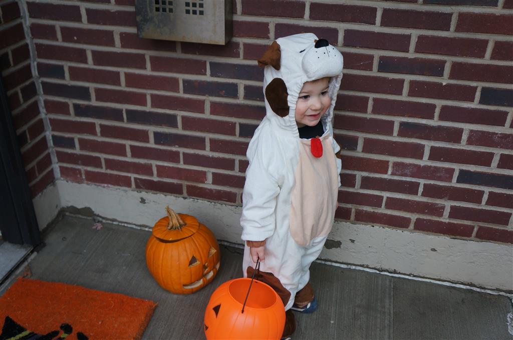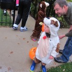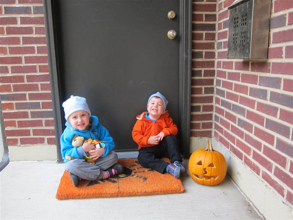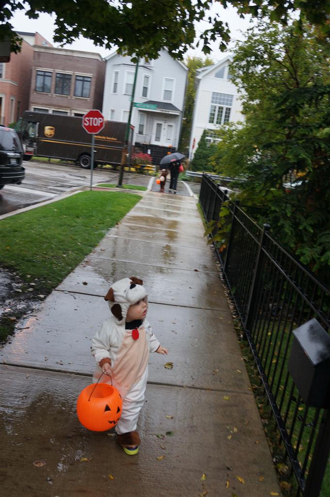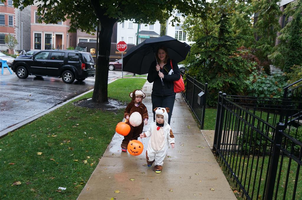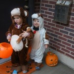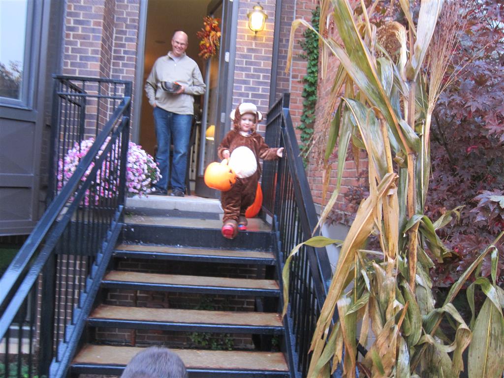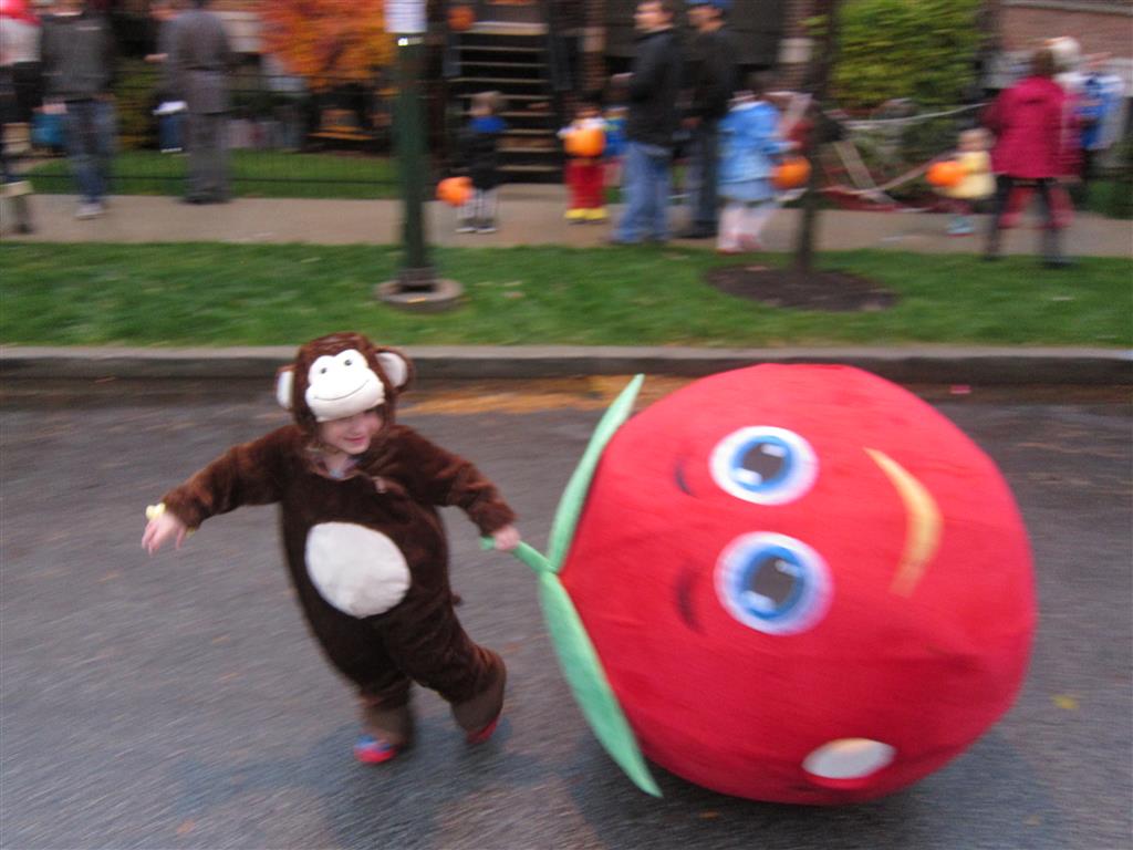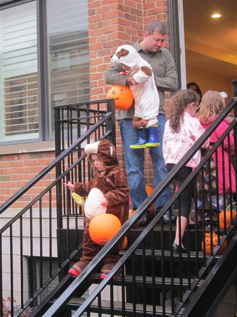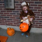 Eleanor and Henry had a great Halloween this week! They both dressed up to match their favorite stuffed friends – Eleanor a monkey and Henry a dog. Henry wasn’t sold on the whole costume at first, but the event grew on him. By the time we were actually trick or treating, he was having a blast walking in the rain and stomping in puddles. Going up to actual houses for candy was a side activity at best, and was eventually completely abandoned in favor of more puddle stomping. Eleanor had fun going up to houses for a little while, but the half flight of stairs up to each door eventually wore on her, and she lost interest as well. She did love Uncle B’s costume – and drew quite a crowd as she dragged it through the street. Who knew monkeys liked apples? Henry had quite the love hate relationship with the apple, he couldn’t stop looking at it while Uncle B was inside, but for every step that Uncle B took, Henry took one to maintain his distance, and much preferred to have Dad between the two.