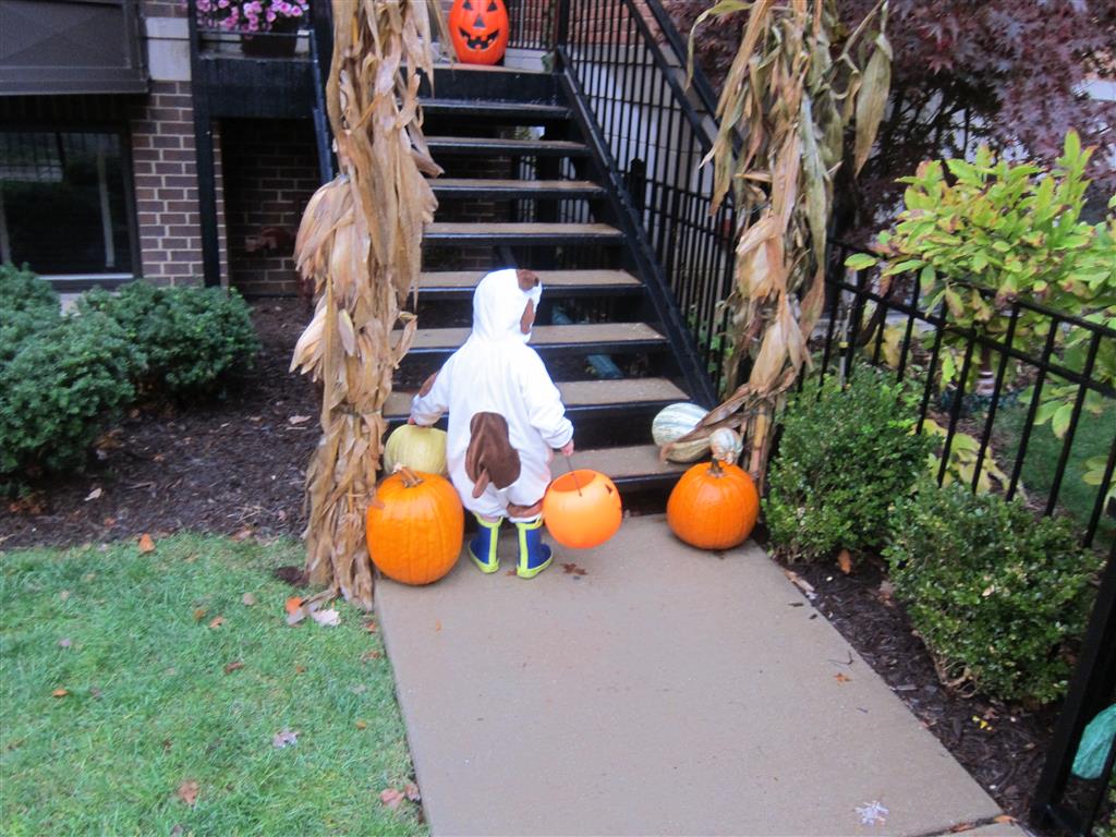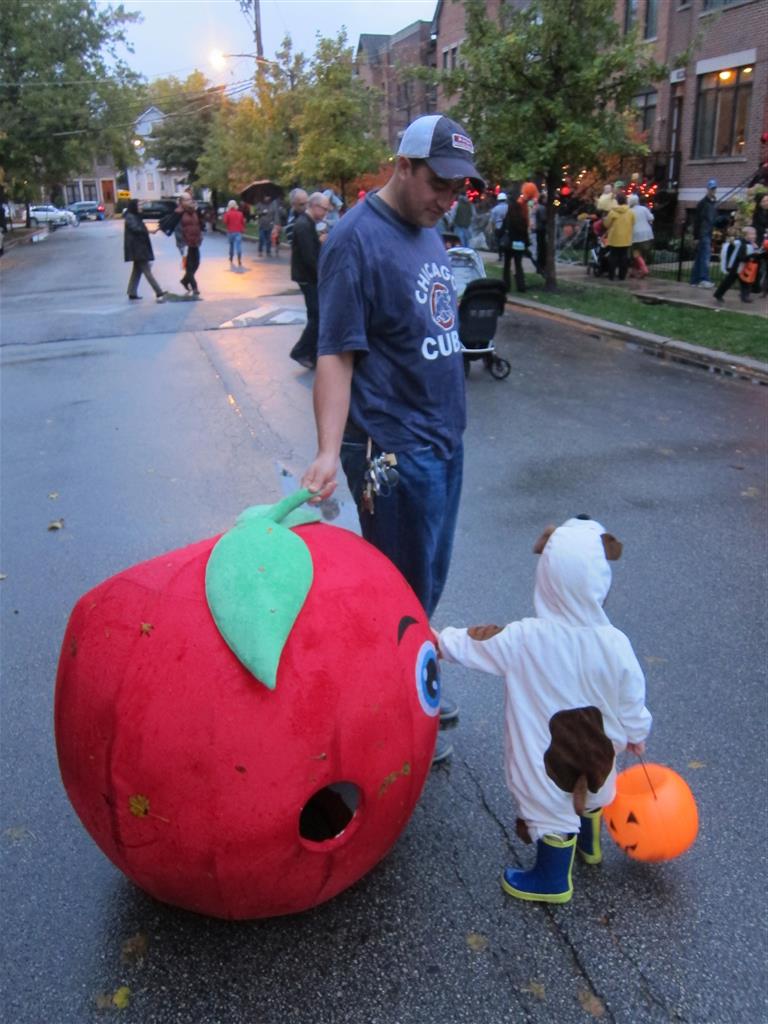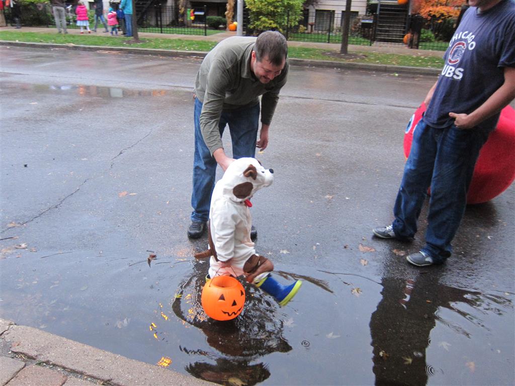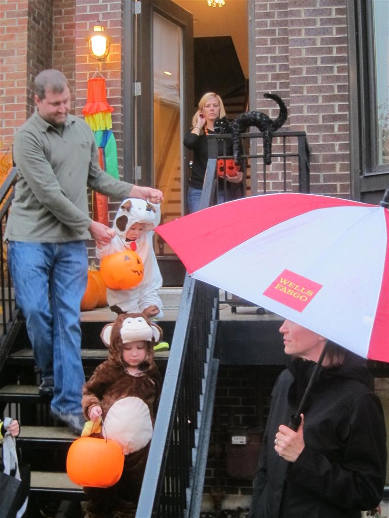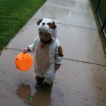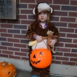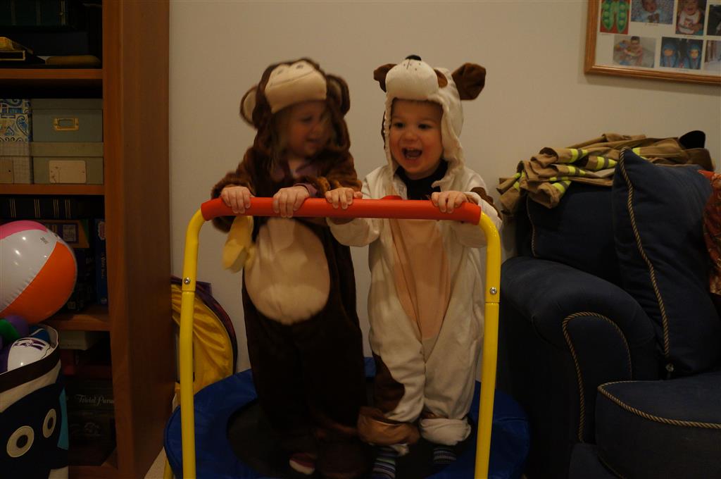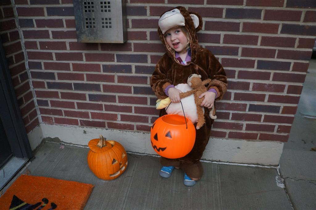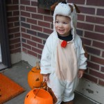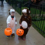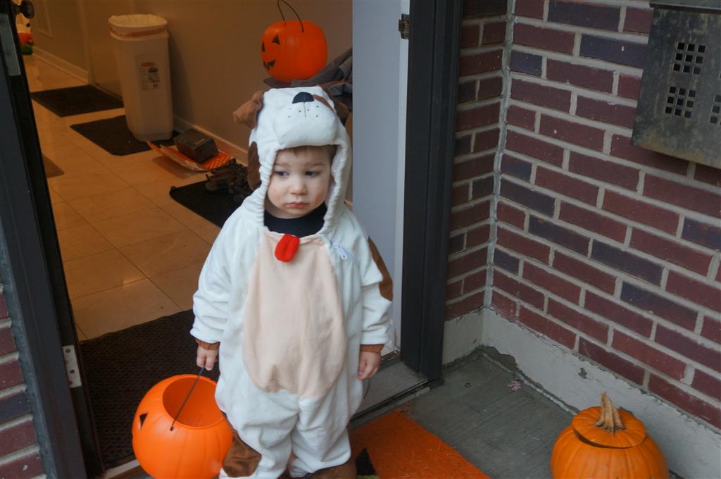 Eleanor and Henry had a great Halloween this week! They both dressed up to match their favorite stuffed friends – Eleanor a monkey and Henry a dog. Henry wasn’t sold on the whole costume at first, but the event grew on him. By the time we were actually trick or treating, he was having a blast walking in the rain and stomping in puddles. Going up to actual houses for candy was a side activity at best, and was eventually completely abandoned in favor of more puddle stomping. Eleanor had fun going up to houses for a little while, but the half flight of stairs up to each door eventually wore on her, and she lost interest as well. She did love Uncle B’s costume – and drew quite a crowd as she dragged it through the street. Who knew monkeys liked apples? Henry had quite the love hate relationship with the apple, he couldn’t stop looking at it while Uncle B was inside, but for every step that Uncle B took, Henry took one to maintain his distance, and much preferred to have Dad between the two.