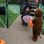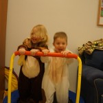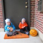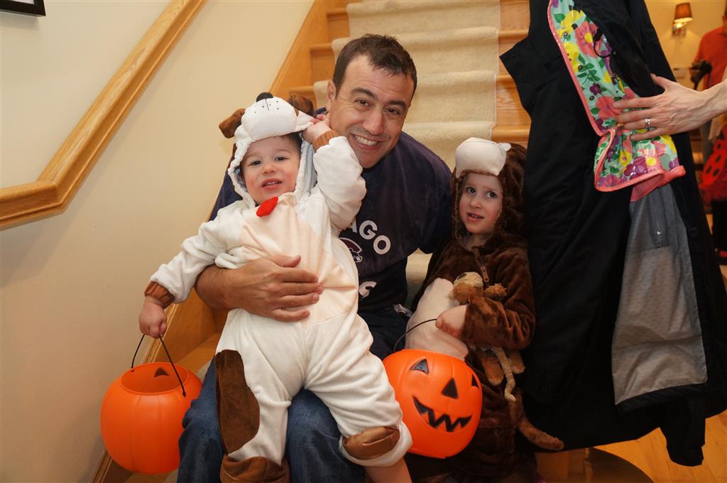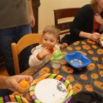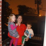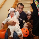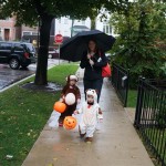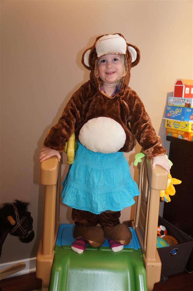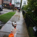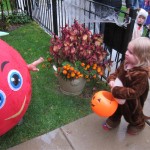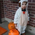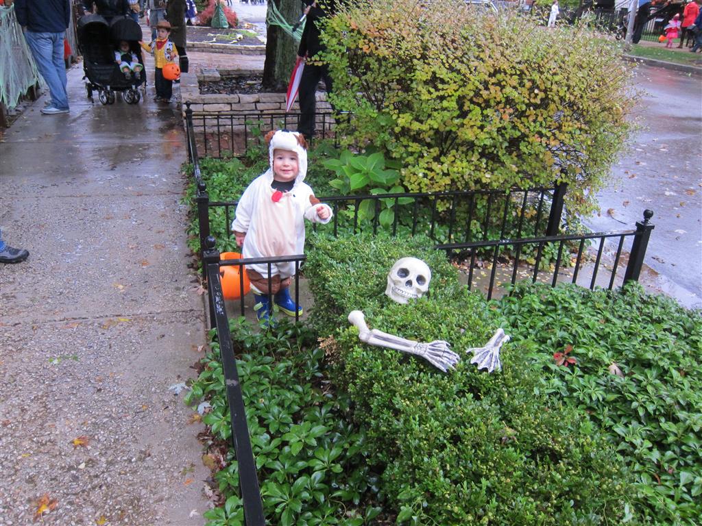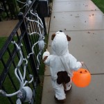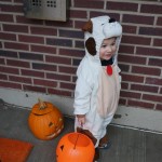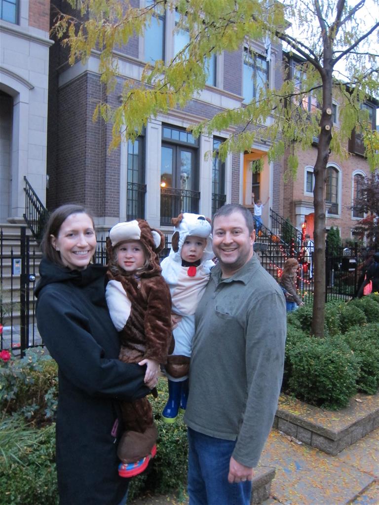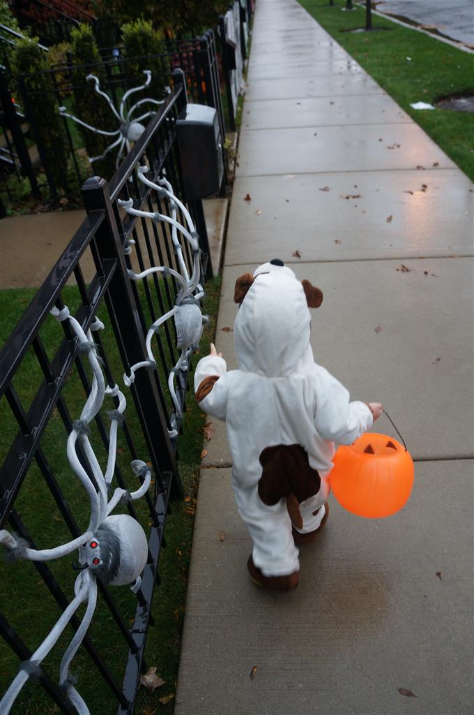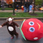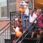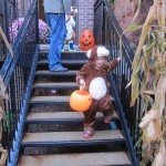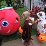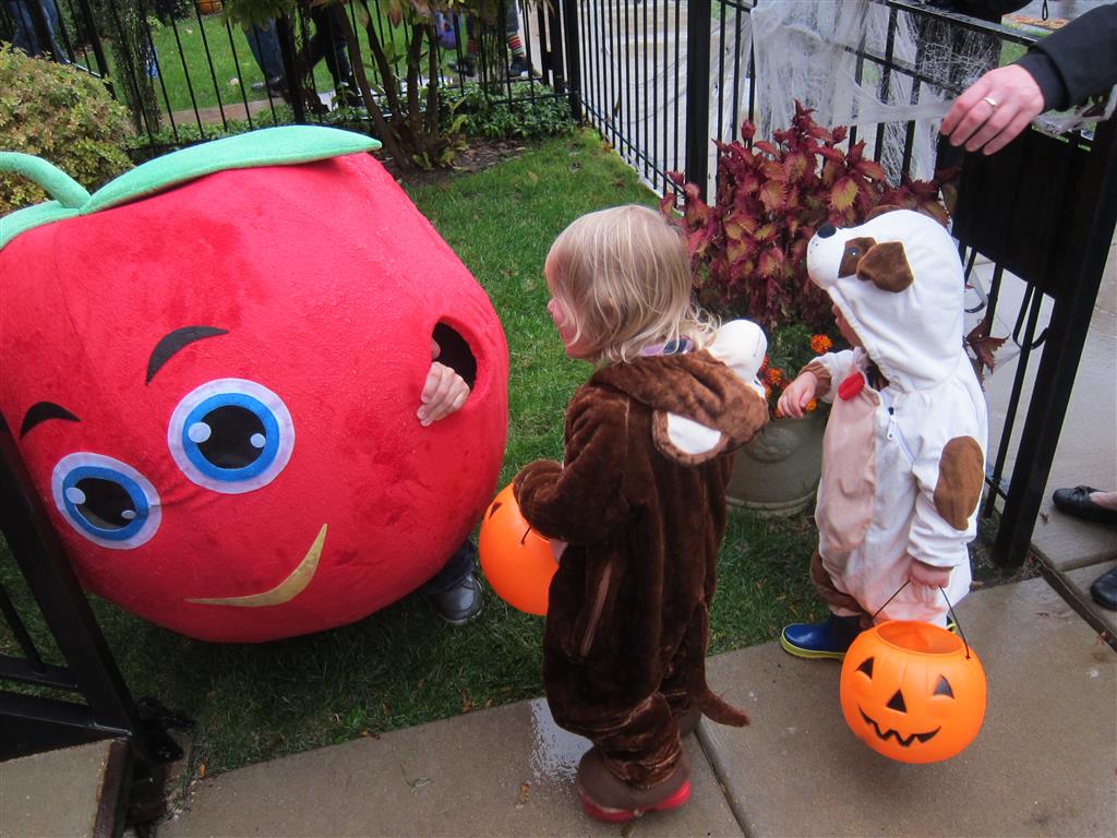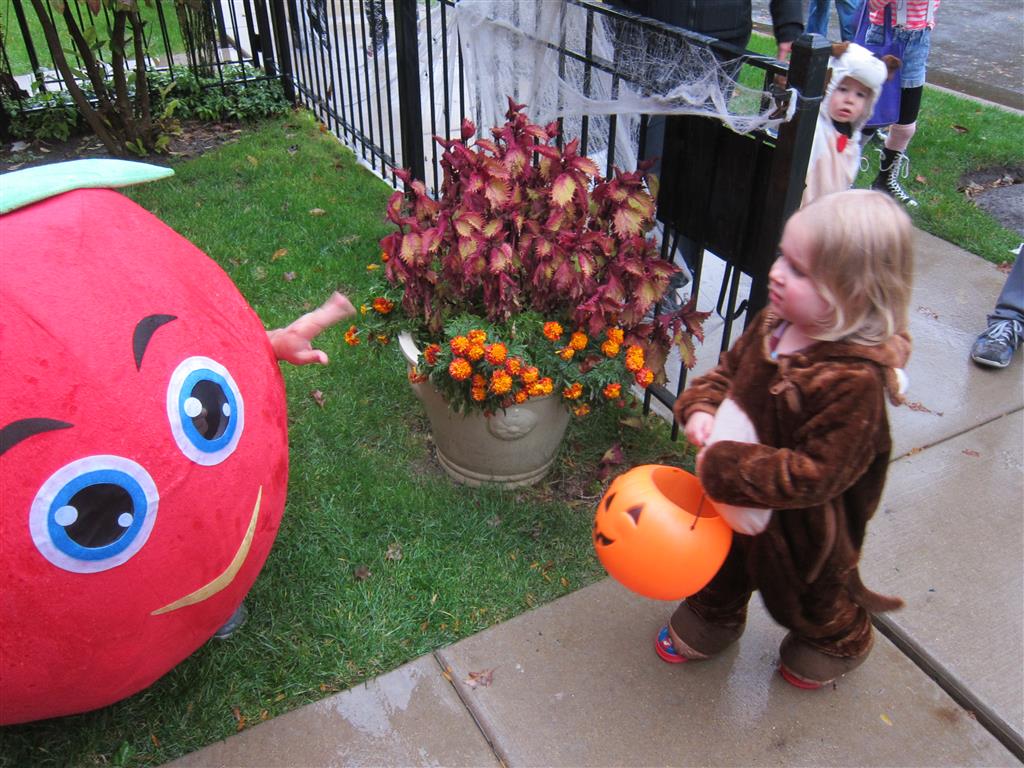 Eleanor and Henry had a great Halloween this week! They both dressed up to match their favorite stuffed friends – Eleanor a monkey and Henry a dog. Henry wasn’t sold on the whole costume at first, but the event grew on him. By the time we were actually trick or treating, he was having a blast walking in the rain and stomping in puddles. Going up to actual houses for candy was a side activity at best, and was eventually completely abandoned in favor of more puddle stomping. Eleanor had fun going up to houses for a little while, but the half flight of stairs up to each door eventually wore on her, and she lost interest as well. She did love Uncle B’s costume – and drew quite a crowd as she dragged it through the street. Who knew monkeys liked apples? Henry had quite the love hate relationship with the apple, he couldn’t stop looking at it while Uncle B was inside, but for every step that Uncle B took, Henry took one to maintain his distance, and much preferred to have Dad between the two.